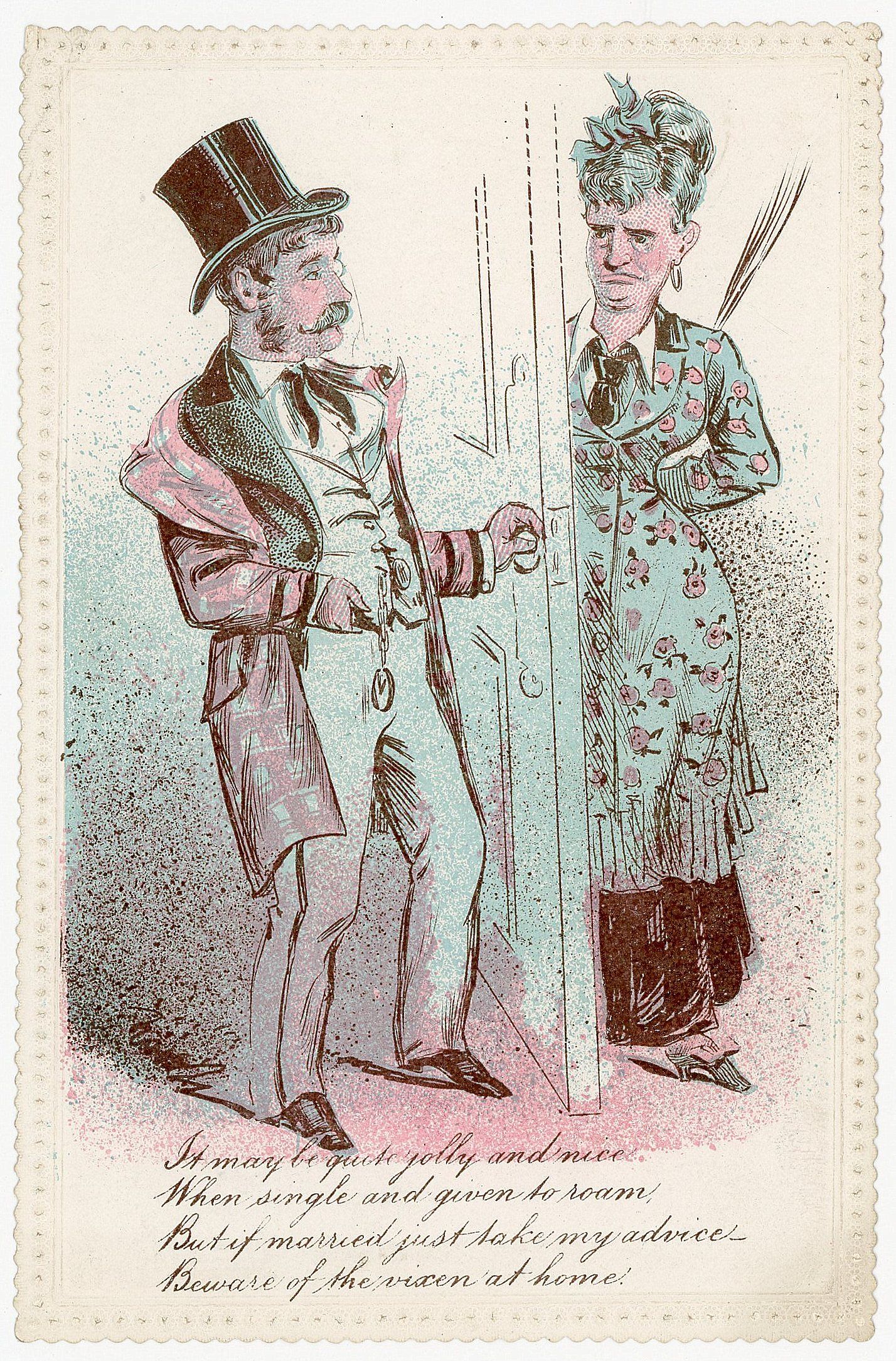 "It may be quite jolly and nice When single and given to roam, But if married just take my advice - Beware of the vixen at home". Reverse is blank.