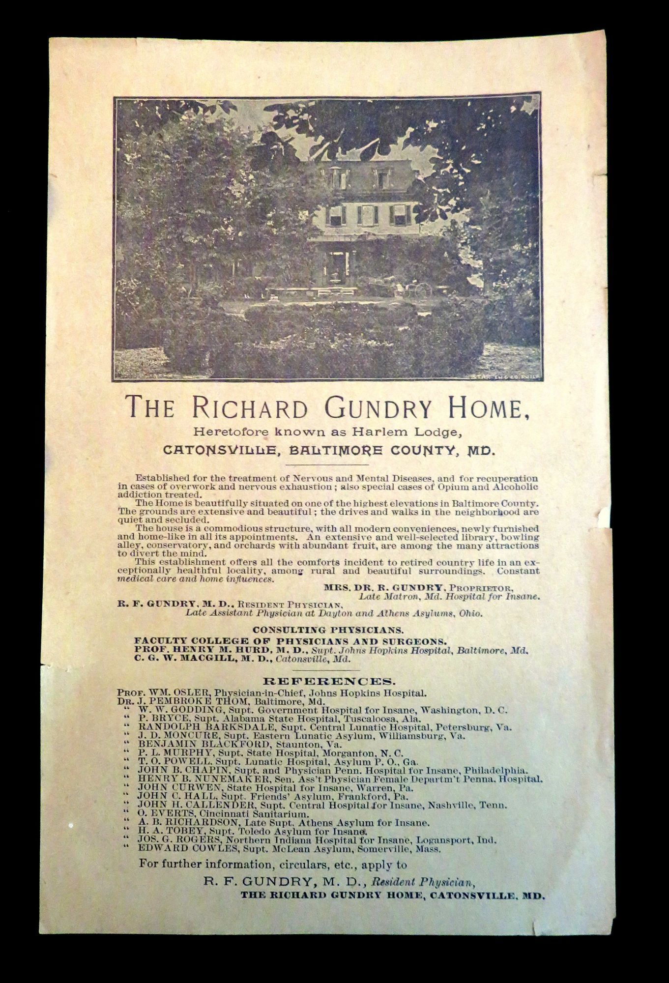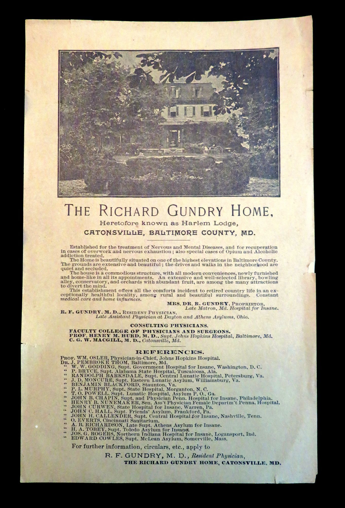 Catonsville, MD: The Richard Gundry Home, 1910. General wear and toning.. A 8 3/4" x 5 1/2" circular with a black and white image from a photograph of the main building at the Richard Gundry Home, surrounded by foliage. Followed by a brief description of the home, its consulting physicians, and a list of doctors who refer to the home. Advertisements for the home started mentioning the "heretofore know as Harlem Lodge" in or around 1910. Measures 8 3/4" x 5 1/2" The Richard Gundry Home, formally known as the Harlem Lodge, was established in 1891 to treat a variety of mental and nervous disorders, as well as exhaustion or addiction to alcohol or opium. The Home was named in memory of Dr. Richard Gundry, Sr. (1829-1891) and was owned by his wife, Mrs. Mary M. Gundry (1838-1908) and their son Dr. Richard Fitz Harris Gundry (1866-1924). Mary acted as the proprietor with her son as the resident physician until 1898 when Mary retired, and her son gained complete ownership. The Home had five buildings, and it prided itself on its modern conveniences, like steam heating and electricity, as well as its many "attractions to divert the mind" such as its extensive library, bowling alley, conservatory, and orchard. The house had the capacity for 45 patients who were in the course of their treatment expected to engage in various outdoor work, such as gardening or sports.