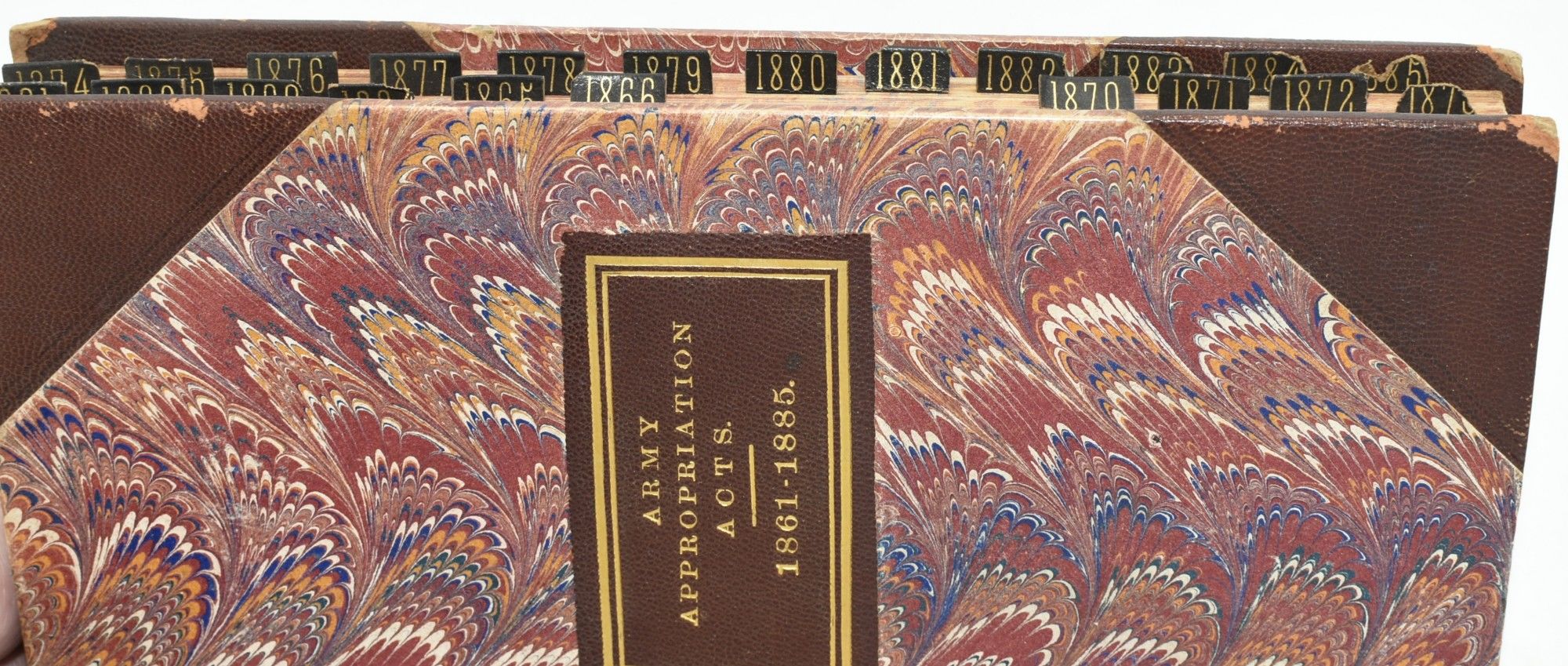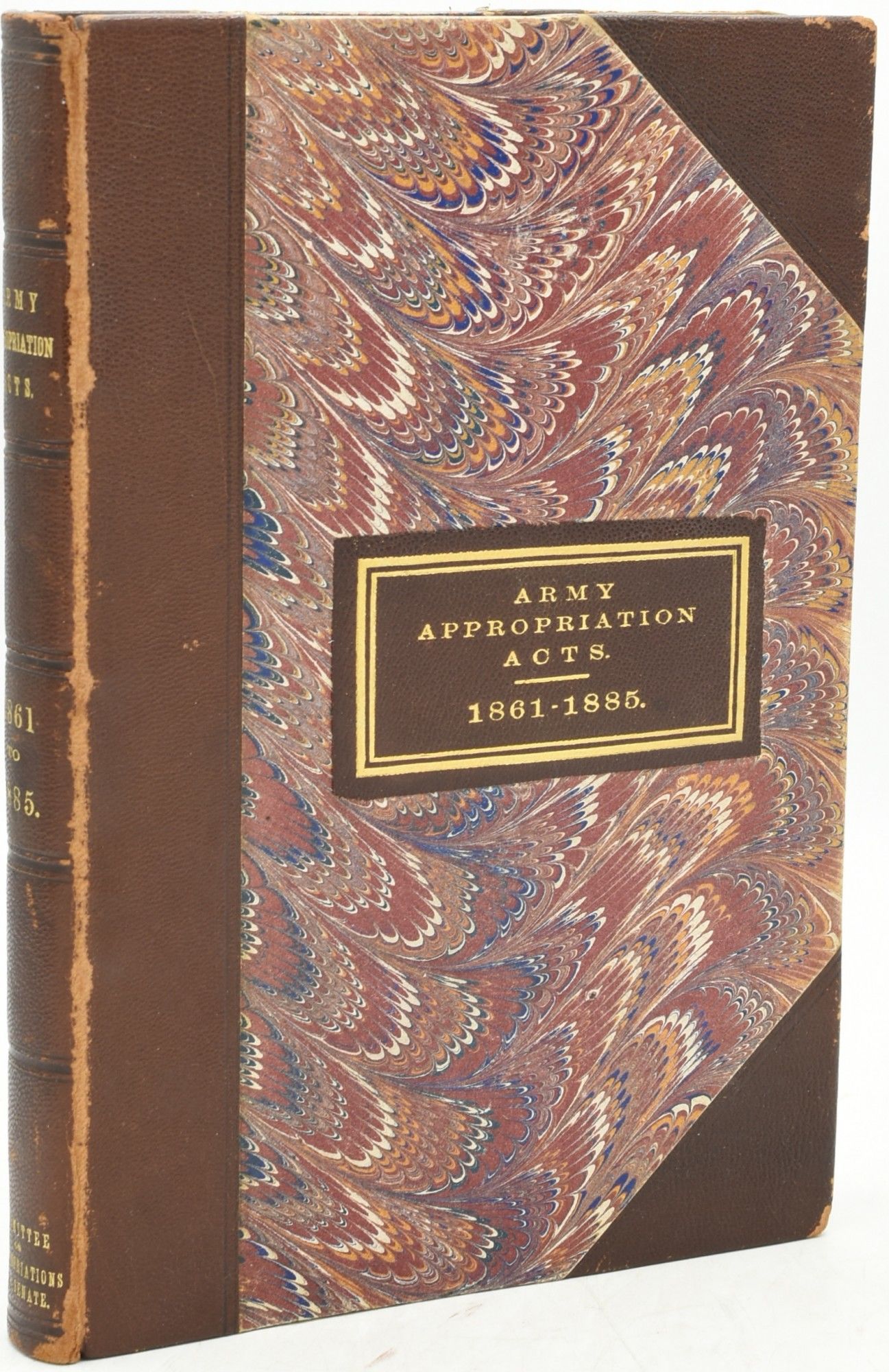 Government Printing Office, 1885. Appropriations for the Army as passed at sessions of Congress, excised from the volumes of the Government Printing Office, and bound together in three-quarter morocco over marbled boards, with a morocco label letters in gilt to the upper board. There are dividers with morocco tabs for each year (some have broken off, though all are present).~~An interesting and comprehensive record of how the savants of the Congress handled military appropriations beginning in 1861 and continuing for the next quarter century. Some underlining and annotations.