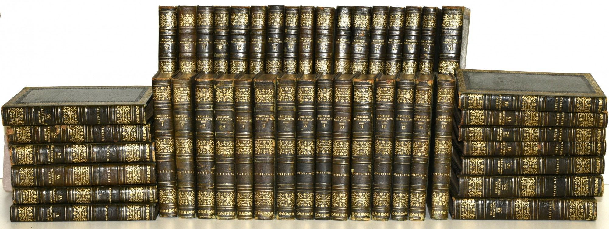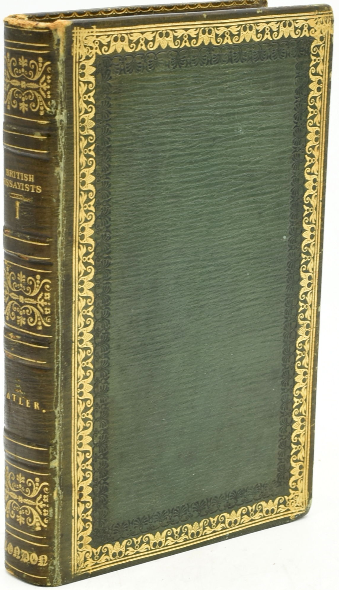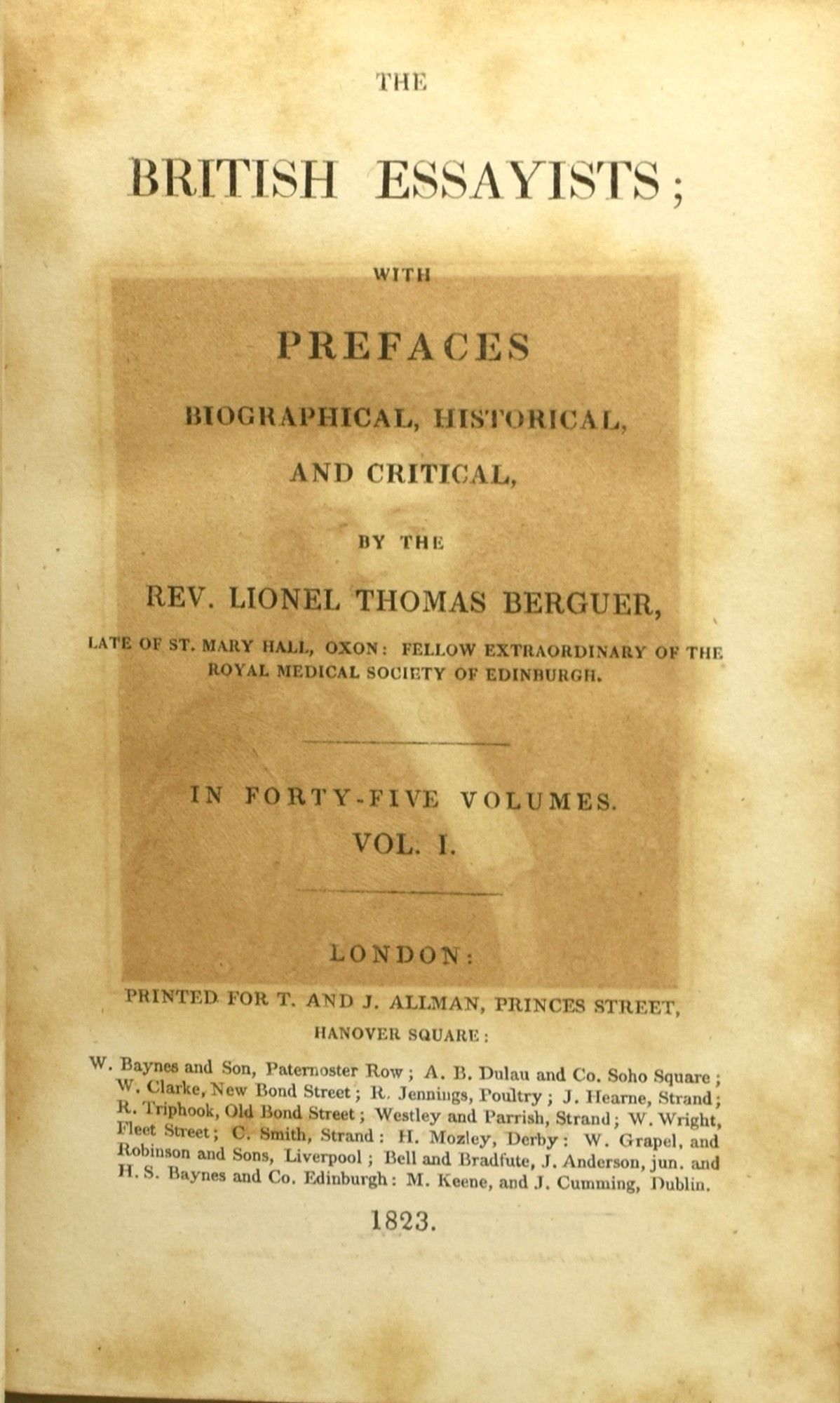 London: T. and J. Allman, 1823. Full Leather. Very Good binding. The set complete in 45 16mo. volumes, bound in green straight-grained morocco, with double rules with elaborate gilt and blind stamping at the perimeter; raised bands with decorations and lettering gilt. turn-ins with deorative rules; pale brown endsheets; there is a name label on the pastedown of each volume. All edges gilt.~~Of the editor, or compiler, Lionel Thomas Berguer, virtually all of the entries we find about him say "Little is known" or words to that effect. We do know that he was born in 1789 which makes him about 34 when this 45 volume set was completed. He was, according to the title pages, a Fellow Extraordinary of the Royal Medical Society of Edinburgh. We think he was an extraordinary fellow to have completed these 45 volumes by the time he was in his early thirties.~~A pretty little set, very much intact, with some modest scuff marks. About 6" tall and filling about three feet six inches of a shelf. All you ever wanted of the British Essayists, at least up to 1823! Very Good binding.