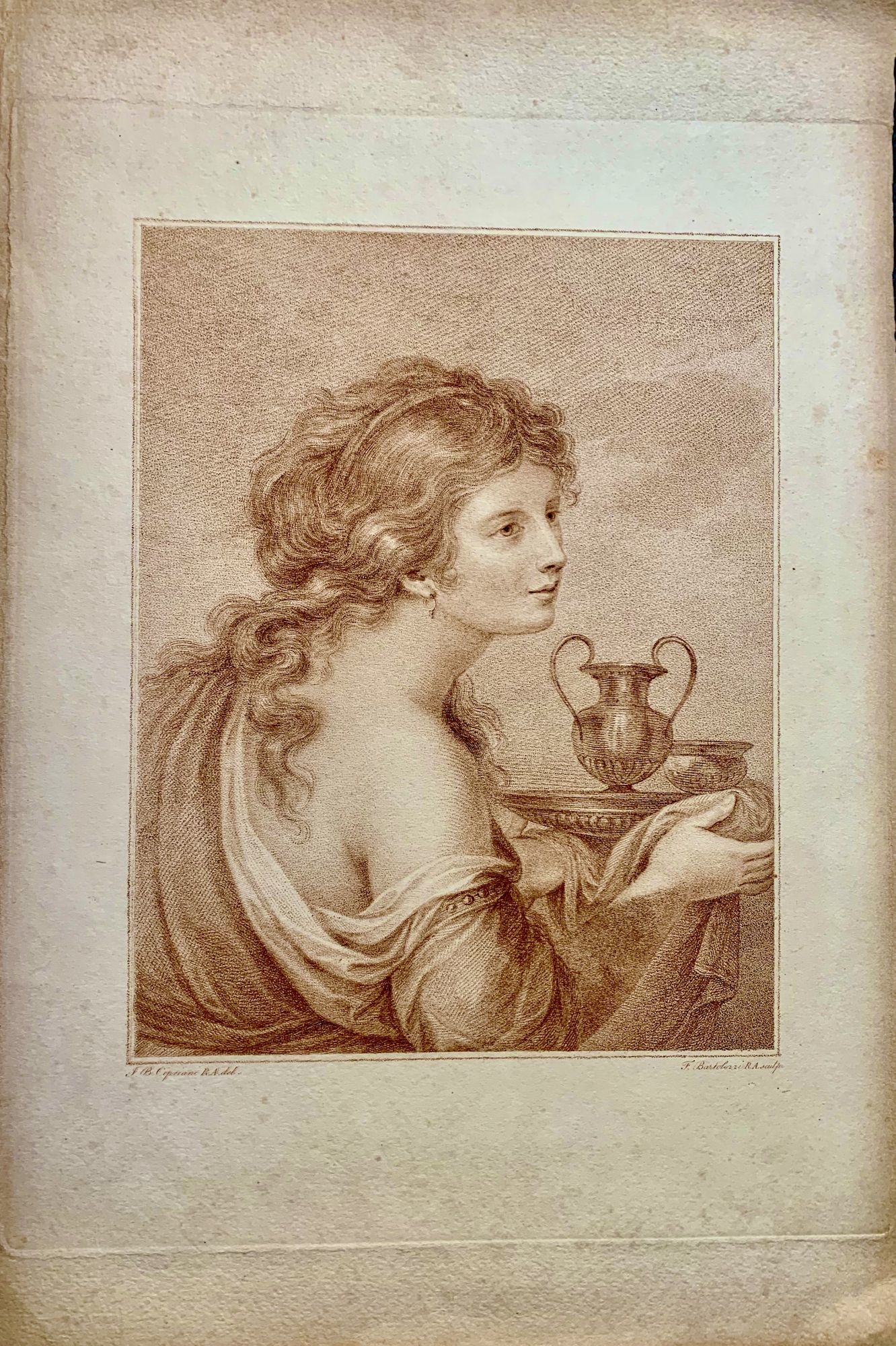 Np: Np, Np. Wraps. Very good. Cipriani, Giovanni Battista. Sepia stipple engraving on wove paper -- image size 23 x 18.5 within 4 cm. borders with entire length 38 cm. Giovanni Battista Cipriani RA was an Italian painter and engraver, who lived in England from 1755. He is also called Giuseppe Cipriani by some authors. Much of his work consisted of designs for prints, many of which were engraved by his friend Francesco Bartolozzi -- who engraved this work.
