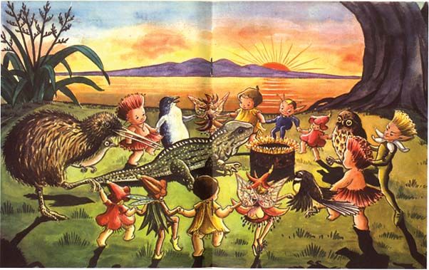 Wellington, New Zealand: A.H. and A.W. Reed, 1956. Near fine.. First edition of the charming story of Kewpie-esque Pohutukawa flower fairies HUTU AND KAWA as they cheer up a lonely reptile. Tuatara are New Zealand's largest reptile, and are a unique species endemic to the islands. They are also the only surviving member of the order Sphenodontia, which could be why this title tuatara was so lonely. In the end, he finds a room to rent, and friends among the various flower fairies, Grandpa Kiwi, Mr. Morepork, Little Blue Penguin, Fanny Fantail, and other native species. 9.75'' x 7.25''. Original color pictorial card covers. Six full-page color illustrations with one color two-page spread and black-and-white illustrations to every page of text. [32] pages. Extremely mild toning to edges, with very subtle edgewear. Sharp and vibrant.