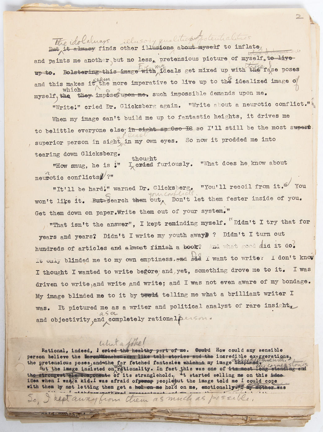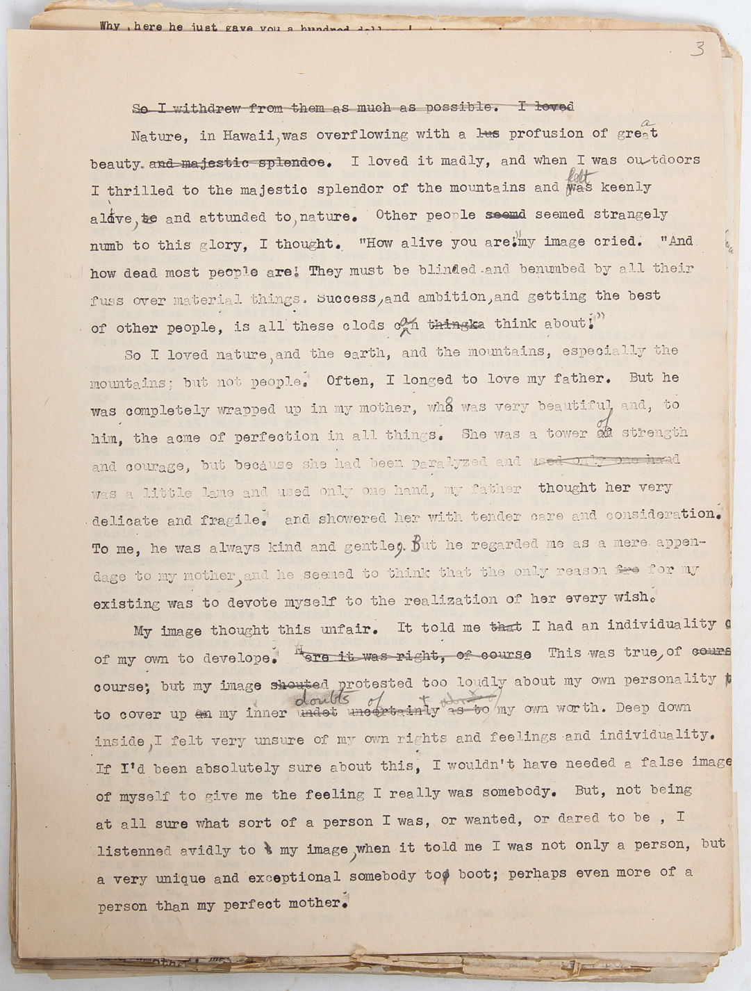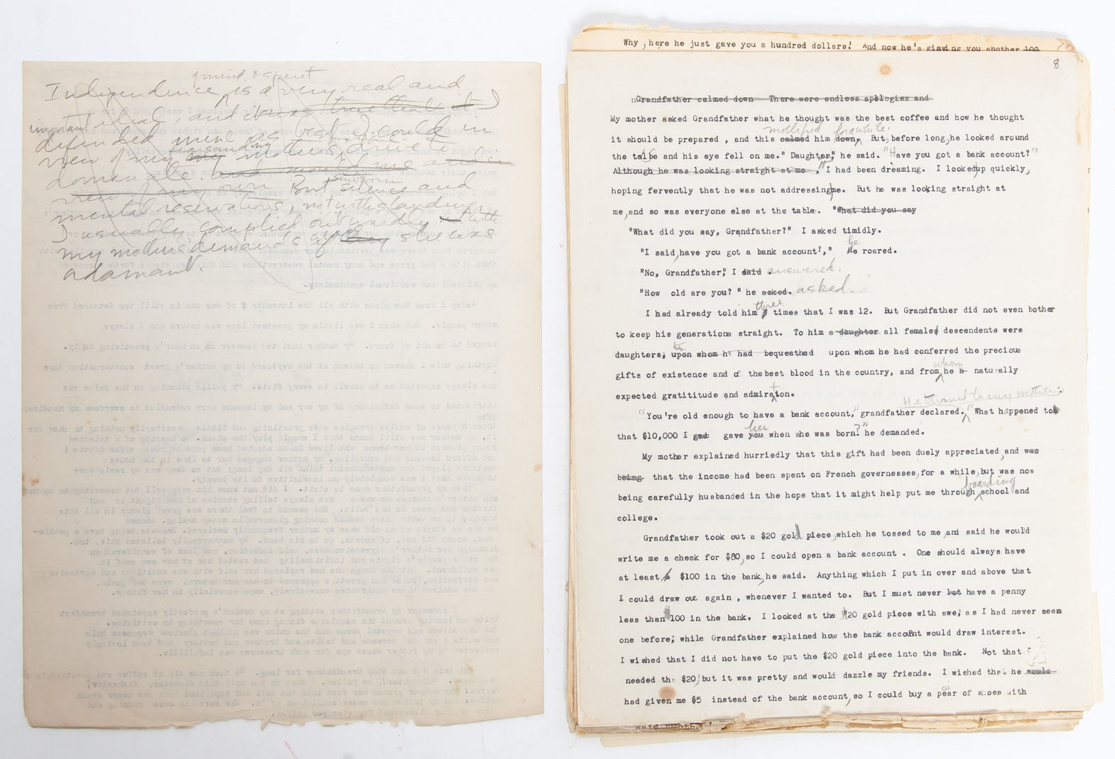 Unbound, with loose pages measuring 8.5 x 11 inches. A short story -- possibly authored by Lowrie, but definitely edited and annotated in her hand. Here, the attention to detail and hands-on approach Lowrie takes are apparent. Meticulously corrected in type and in pencil, with extensive portions excised or changed, the typescript has also been cut apart and pasted back together throughout. The result is mispagination and the creation of a very new version of the original story.