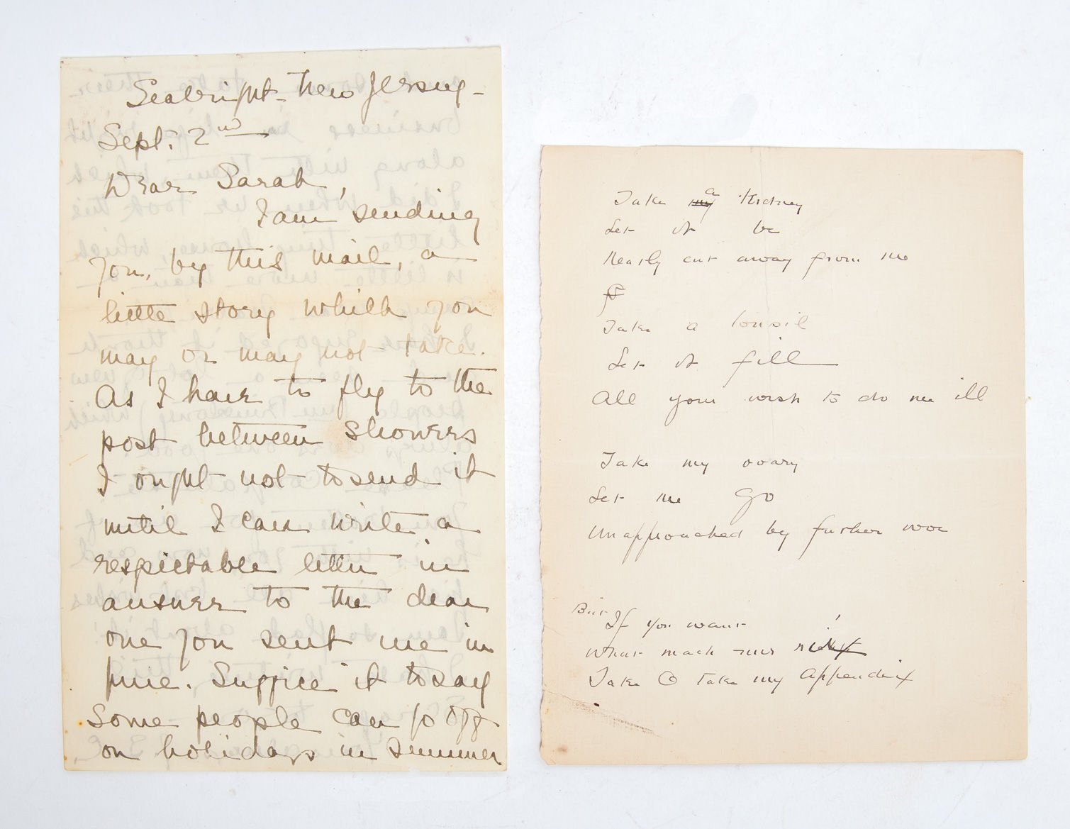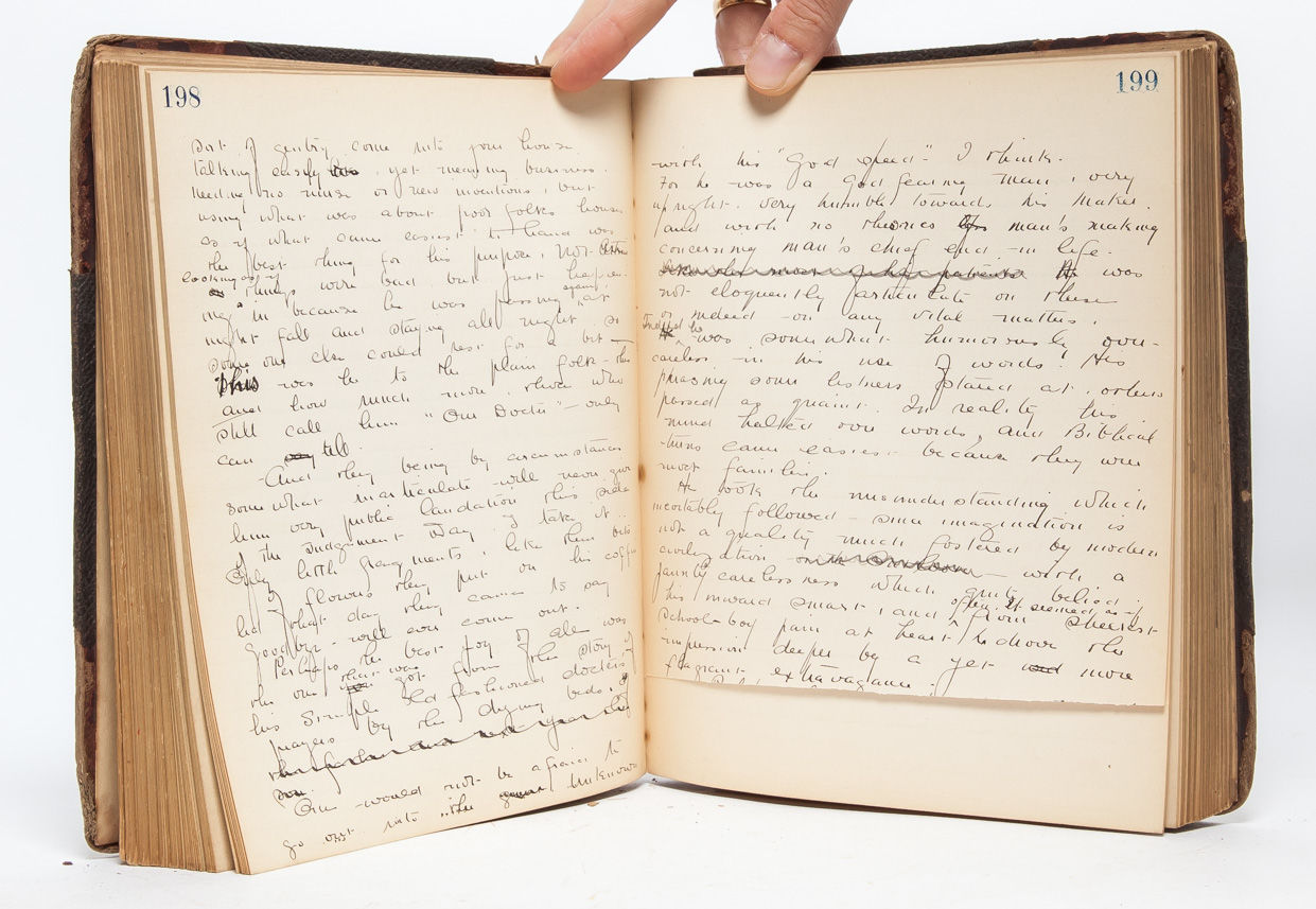 Interspersed within the notebook are other pieces of work by Lowrie. which appear to be unpublished. St. John of the Wilderness (pages 35-56) is dated January-February 1901. The poem Away from You (pages 57-58) is dated February 25, 1901 and is accompanied by an original sketch. A story Peter the Fisherman (pages 176-194) is dated August 25, 1903. And the final piece, dated November 25, 1903 is on the death of her father (pages 195-202) and appears to include a family history as well as a tribute to the man. Tucked loosely within the volume is a letter to Sarah from another female author, identified only as J.S.C., regarding a short story. Also loosely inserted is a 1 page Autograph Poem unsigned in Lowrie's hand with content that ties together authorship and sex: "...Take my ovary Let me go Unapproached by further woe; But if you want What matters next, Take o take my Appendix." Together, the group shows her writing process, and her ability to work on multiple projects during a highly creative period. Further research could link together the works based on religious themes, Lowrie's work in activism and journalism, and her own family's history.
