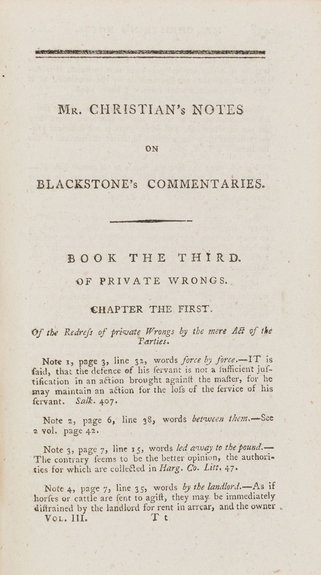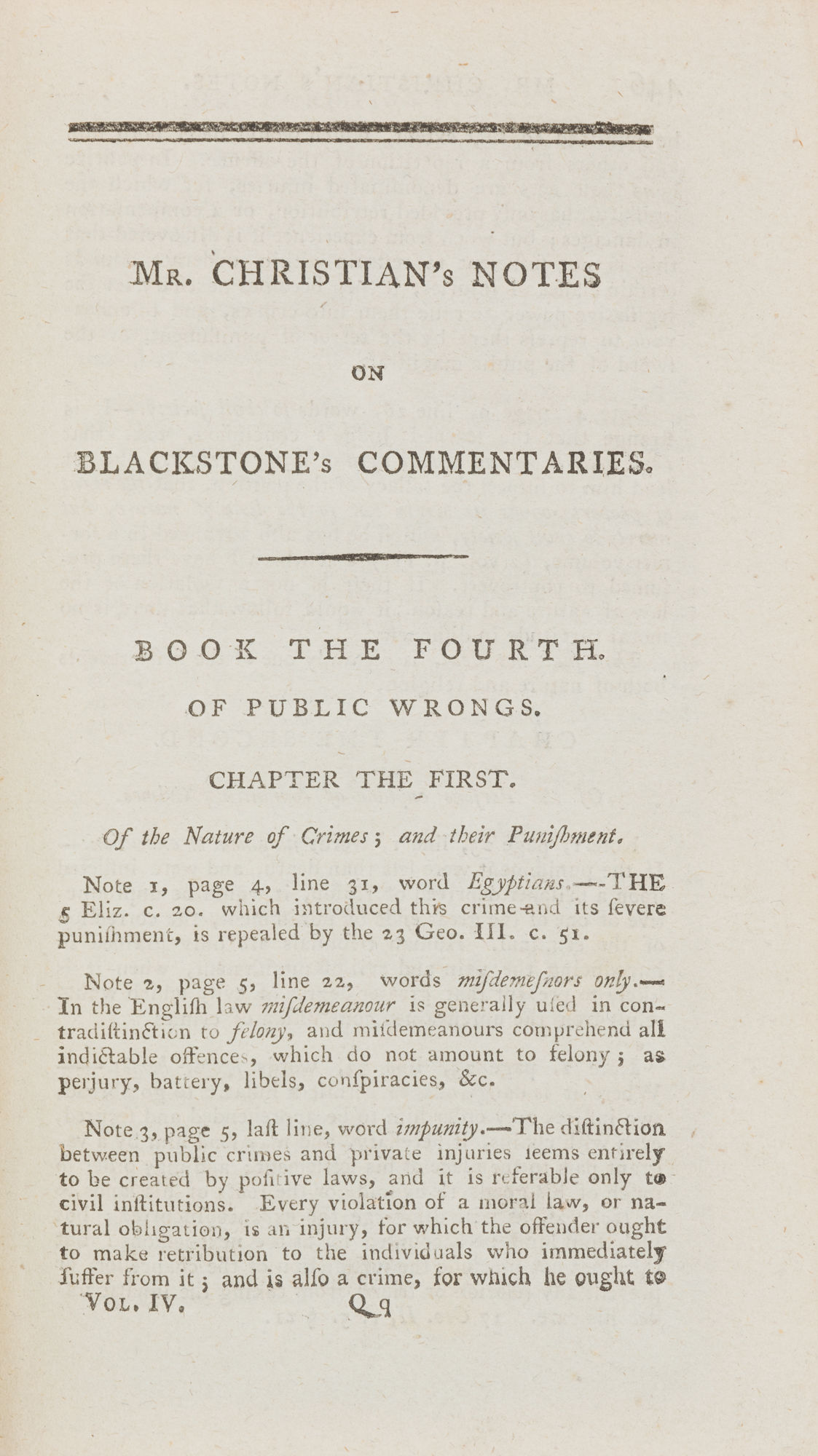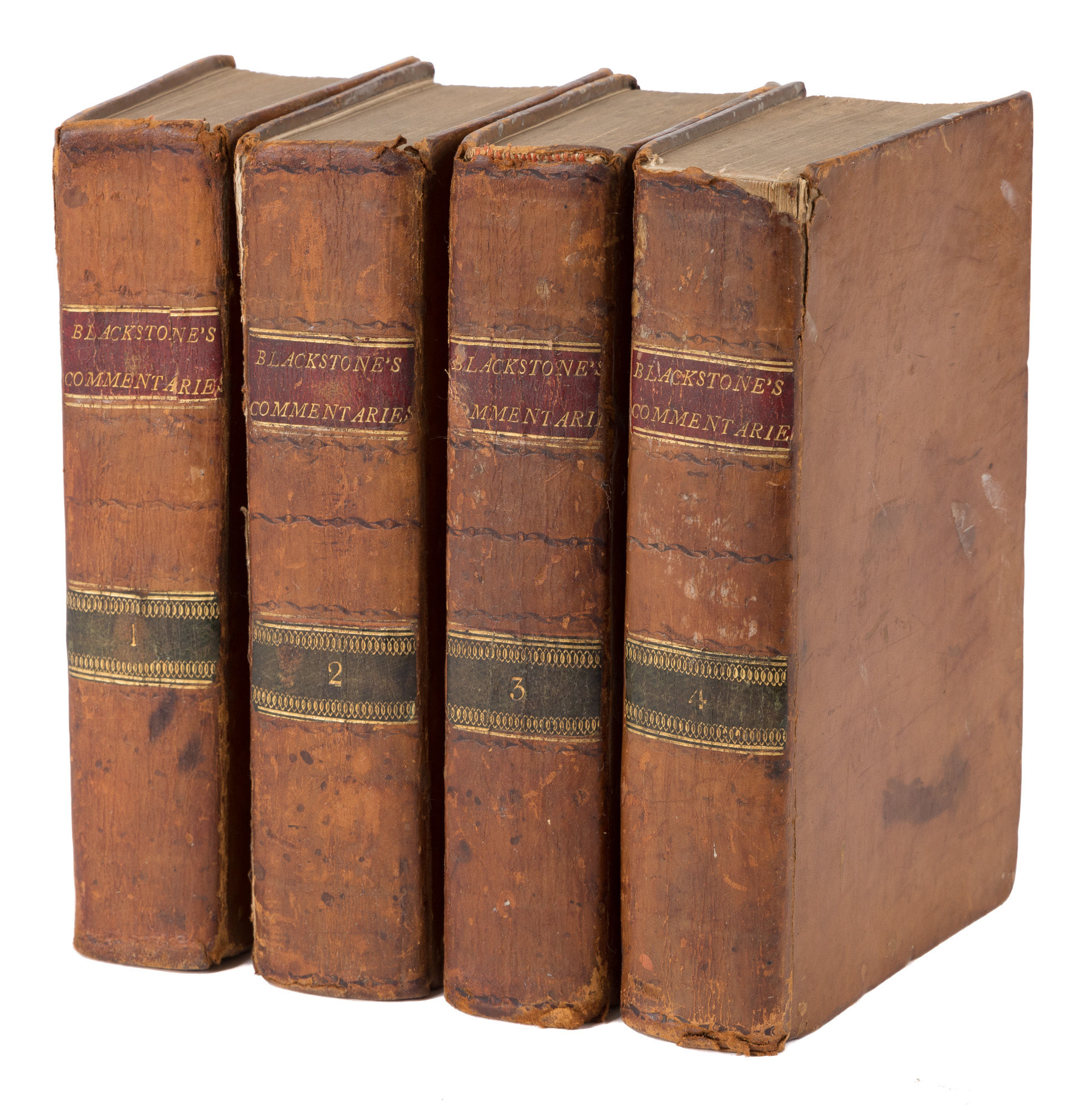 1794. A Curious Hybrid of Two Pirate Editions Blackstone, Sir William [1723-1780]. Commentaries on The Laws of England, In Four Books. The Twelfth Edition. With the Last Corrections of the Author; Additions by Richard Burn, LL.D. And Continued to the Present Time by John Williams, Esq. Dublin: Printed for L. White, William Jones, And John Rice, 1794. [Volume I]. [And] Blackstone, Sir William. Commentaries on The Laws of England. The Thirteenth Edition, With the Last Corrections of the Author; Additions by Richard Burn, LL.D. And John Williams, Esq. And Continued to the Present Time, By Edward Christian, Esq. Dublin: Printed for L. White, William Jones, And John Rice, 1796. [Volumes II, III, IV]. Complete set. 12mo. (6-3/4" x 4"; 17.14 x 10.16 cm). Contemporary calf, lettering pieces and blind fillets to boards. Light scuffing and a few stains to boards, moderate rubbing to extremities, chipping to spine ends, a few joints and hinges starting, rear board of Volume II beginning to separate, but secure. Moderate toning to text, somewhat heavier in places, lower corner lacking from leaf Dd1 in Volume I (pp. 313-314) with no loss to text, lower corner lacking from Leaf Dd5 in Volume III (pp. 317-318), about 1" removed from heads of front free endpaper, most likely to remove signatures, recent owner signature to front free endpaper of Volume I. $1,500. * This set consists of pirated editions. Volume I is a reprint of the authentic eleventh edition, London, 1791, and the other volumes are reprints of the authentic twelfth edition, London 1793-1795, which has extensive notes by Edward Christian at the end of each volume. The appearance of this set and its binding suggests it was assembled around 1796. Our copy of Volume I was bound with the notes included in Volume I of the later edition. Volume II does not have the Table of Descents and folding Table of Consanguinity. Though indicated in the index, which is at the end of Volume IV, it appears these tables were never issued; they do not appear in the copy listed in Eller and Laeuchli (at Yale Law School) or in those listed on OCLC. Eller, The William Blackstone Collection in the Yale Law Library 22,23. Laeuchli, A Bibliographical Catalog of William Blackstone 27,28.