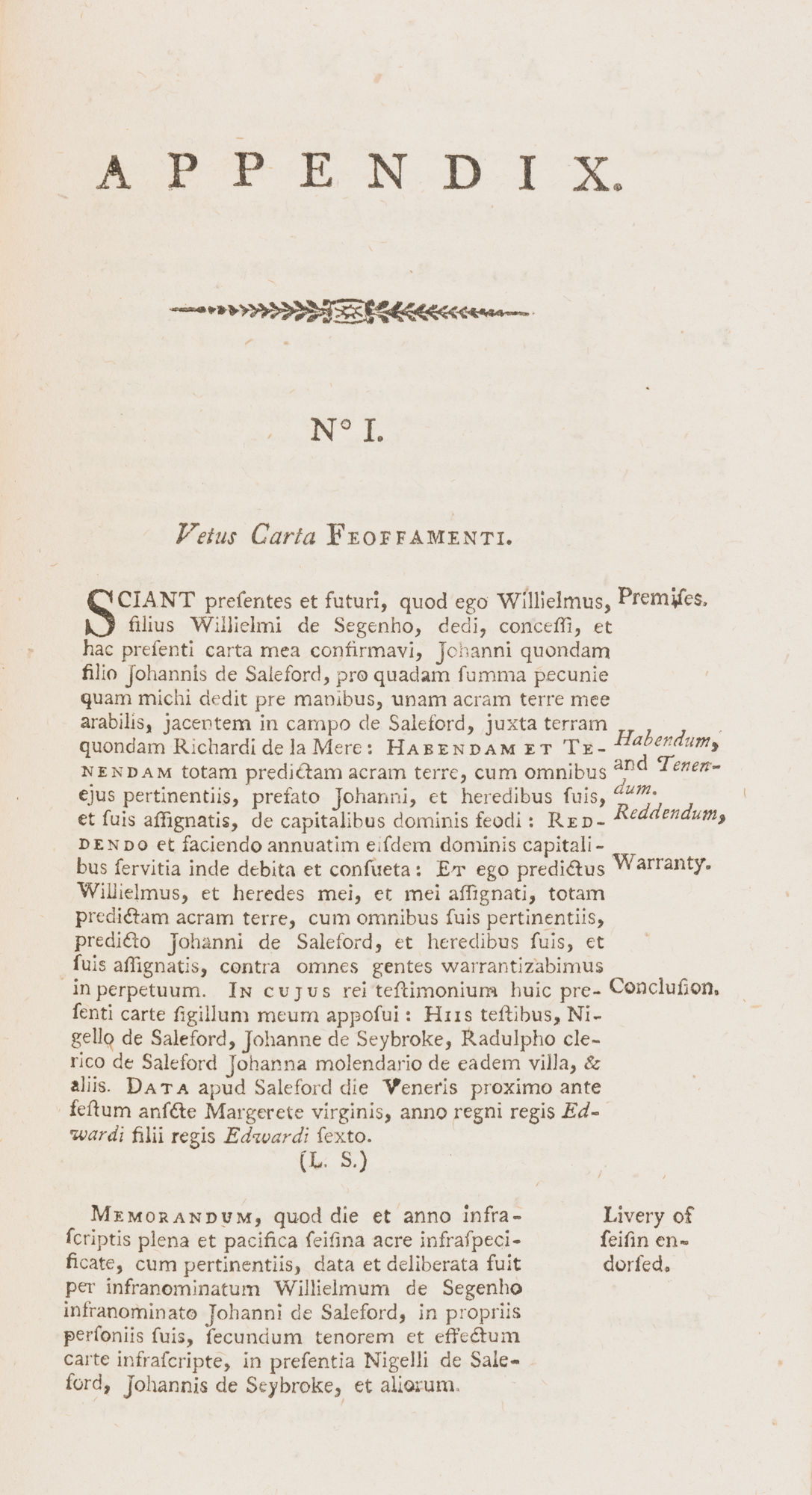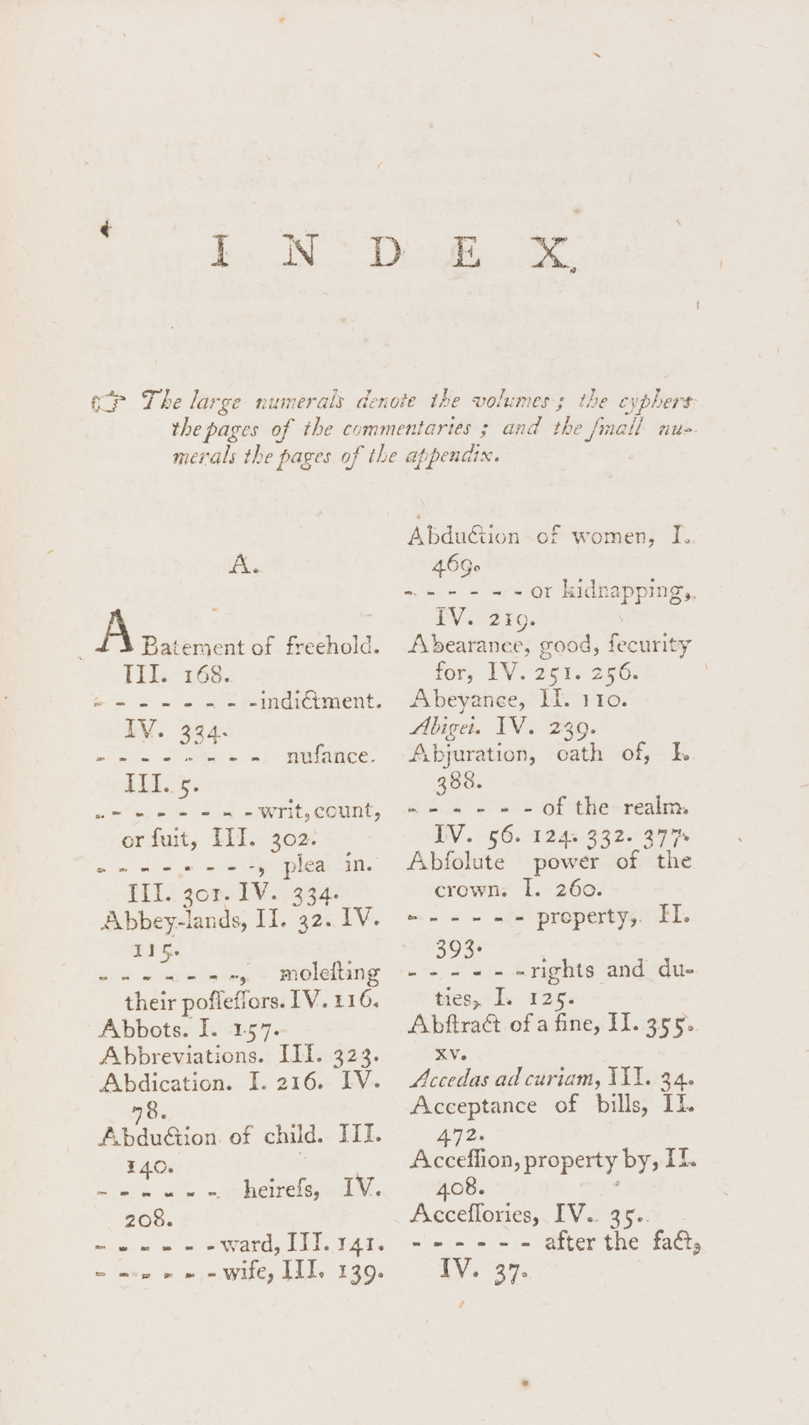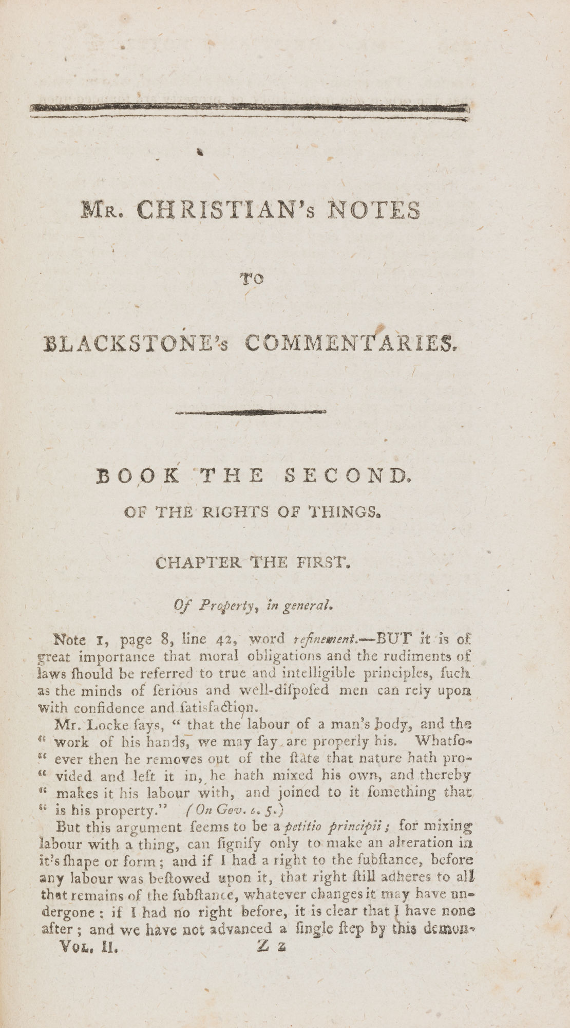 1794. A Curious Hybrid of Two Pirate Editions Blackstone, Sir William [1723-1780]. Commentaries on The Laws of England, In Four Books. The Twelfth Edition. With the Last Corrections of the Author; Additions by Richard Burn, LL.D. And Continued to the Present Time by John Williams, Esq. Dublin: Printed for L. White, William Jones, And John Rice, 1794. [Volume I]. [And] Blackstone, Sir William. Commentaries on The Laws of England. The Thirteenth Edition, With the Last Corrections of the Author; Additions by Richard Burn, LL.D. And John Williams, Esq. And Continued to the Present Time, By Edward Christian, Esq. Dublin: Printed for L. White, William Jones, And John Rice, 1796. [Volumes II, III, IV]. Complete set. 12mo. (6-3/4" x 4"; 17.14 x 10.16 cm). Contemporary calf, lettering pieces and blind fillets to boards. Light scuffing and a few stains to boards, moderate rubbing to extremities, chipping to spine ends, a few joints and hinges starting, rear board of Volume II beginning to separate, but secure. Moderate toning to text, somewhat heavier in places, lower corner lacking from leaf Dd1 in Volume I (pp. 313-314) with no loss to text, lower corner lacking from Leaf Dd5 in Volume III (pp. 317-318), about 1" removed from heads of front free endpaper, most likely to remove signatures, recent owner signature to front free endpaper of Volume I. $1,500. * This set consists of pirated editions. Volume I is a reprint of the authentic eleventh edition, London, 1791, and the other volumes are reprints of the authentic twelfth edition, London 1793-1795, which has extensive notes by Edward Christian at the end of each volume. The appearance of this set and its binding suggests it was assembled around 1796. Our copy of Volume I was bound with the notes included in Volume I of the later edition. Volume II does not have the Table of Descents and folding Table of Consanguinity. Though indicated in the index, which is at the end of Volume IV, it appears these tables were never issued; they do not appear in the copy listed in Eller and Laeuchli (at Yale Law School) or in those listed on OCLC. Eller, The William Blackstone Collection in the Yale Law Library 22,23. Laeuchli, A Bibliographical Catalog of William Blackstone 27,28.