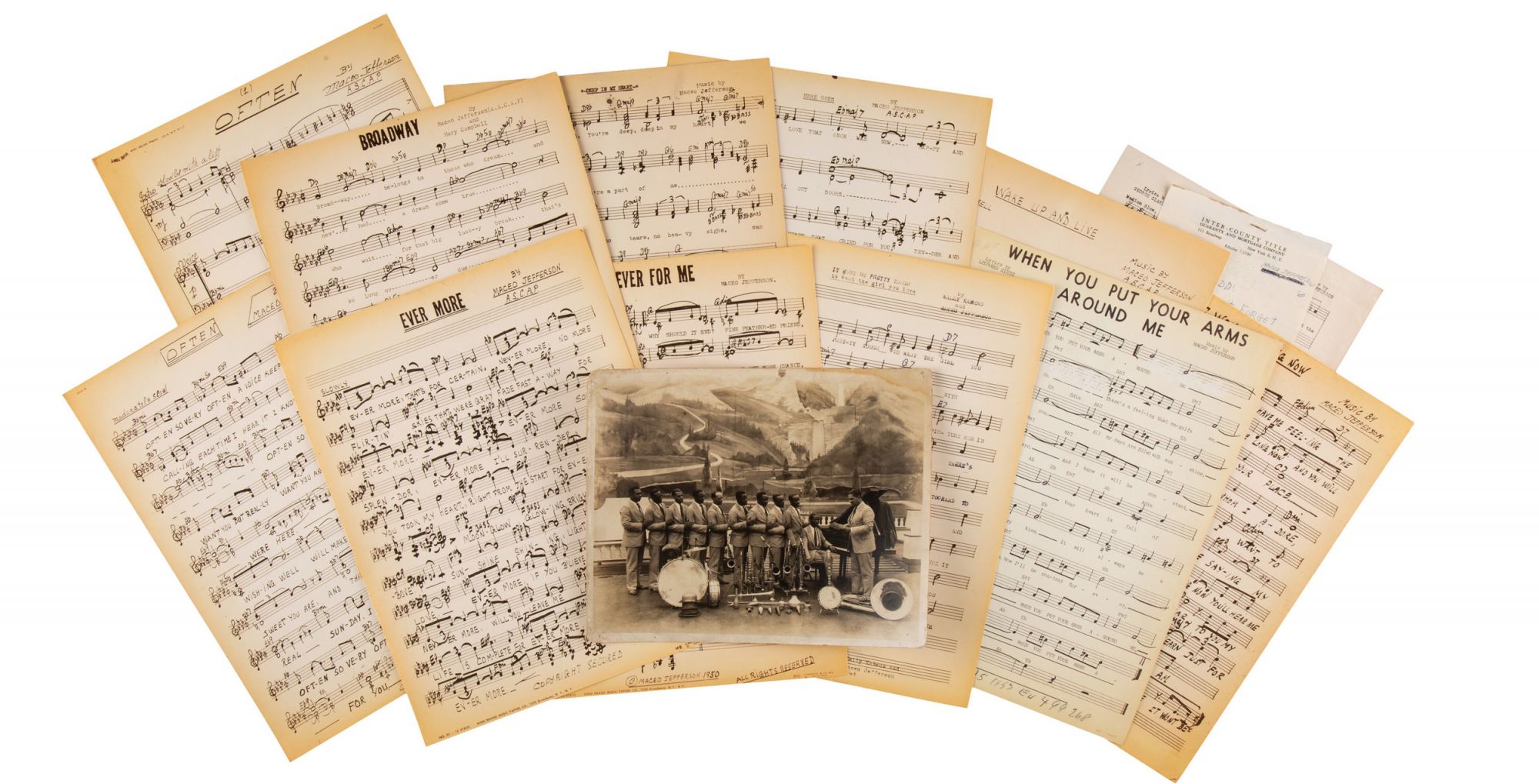 Twelve Compositions by Maceo Jefferson [with] Photograph of the Plantation Orchestra, Featuring Jefferson [with] A Signed Note by Jefferson, c. 1964