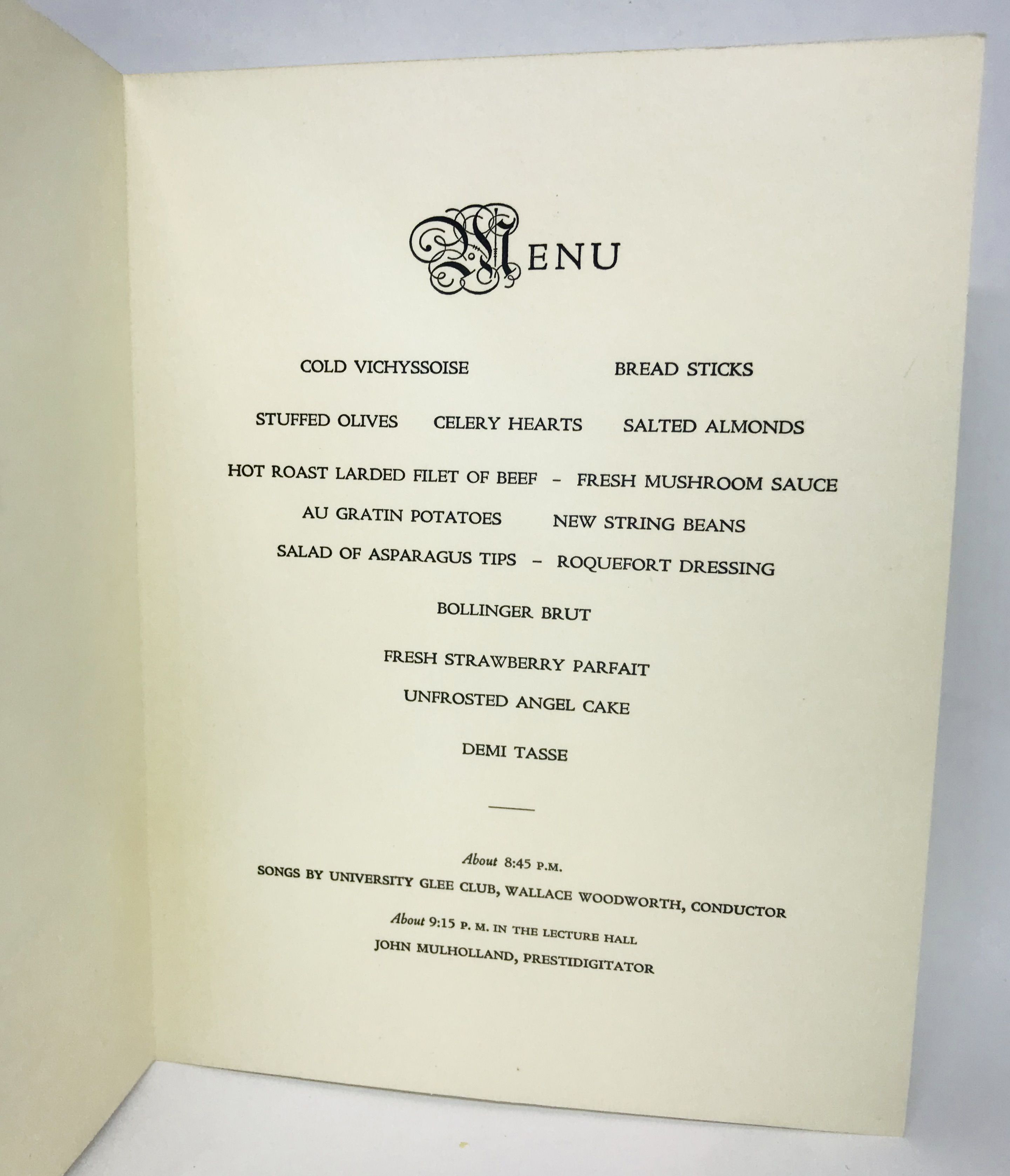 1954. Wraps. Cream cards. Very good. 18.5 x 14.5 cm. Folded card. Very good. Full menu with entertainment - "Songs by University Glee Club". Clean, crisp copy.