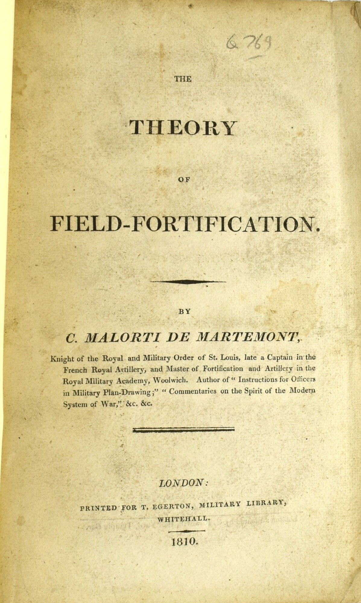 London: T. Egerton, 1810. First Edition. Full Leather. Very Good binding. 8vo.; full speckled calf neatly rebacked in new calf with morocco label; with new endpapers; complete with 31 folding plates at the rear of the book. Armorial bookplate of Arthur Webber on the pastedown. Wear to the edges of the boards, especially at the corners.~~The First Edition of Martemont's "Theory of Field-Fortification" which was printed several times in the 19th century. Martemont's Treatise was used by him in preparing students at The Royal Artillery Institution in Woolwich. Martemont was "late a captain in the French royal artillery, and master of fortification and artillery in the royal military academy". Very Good binding.