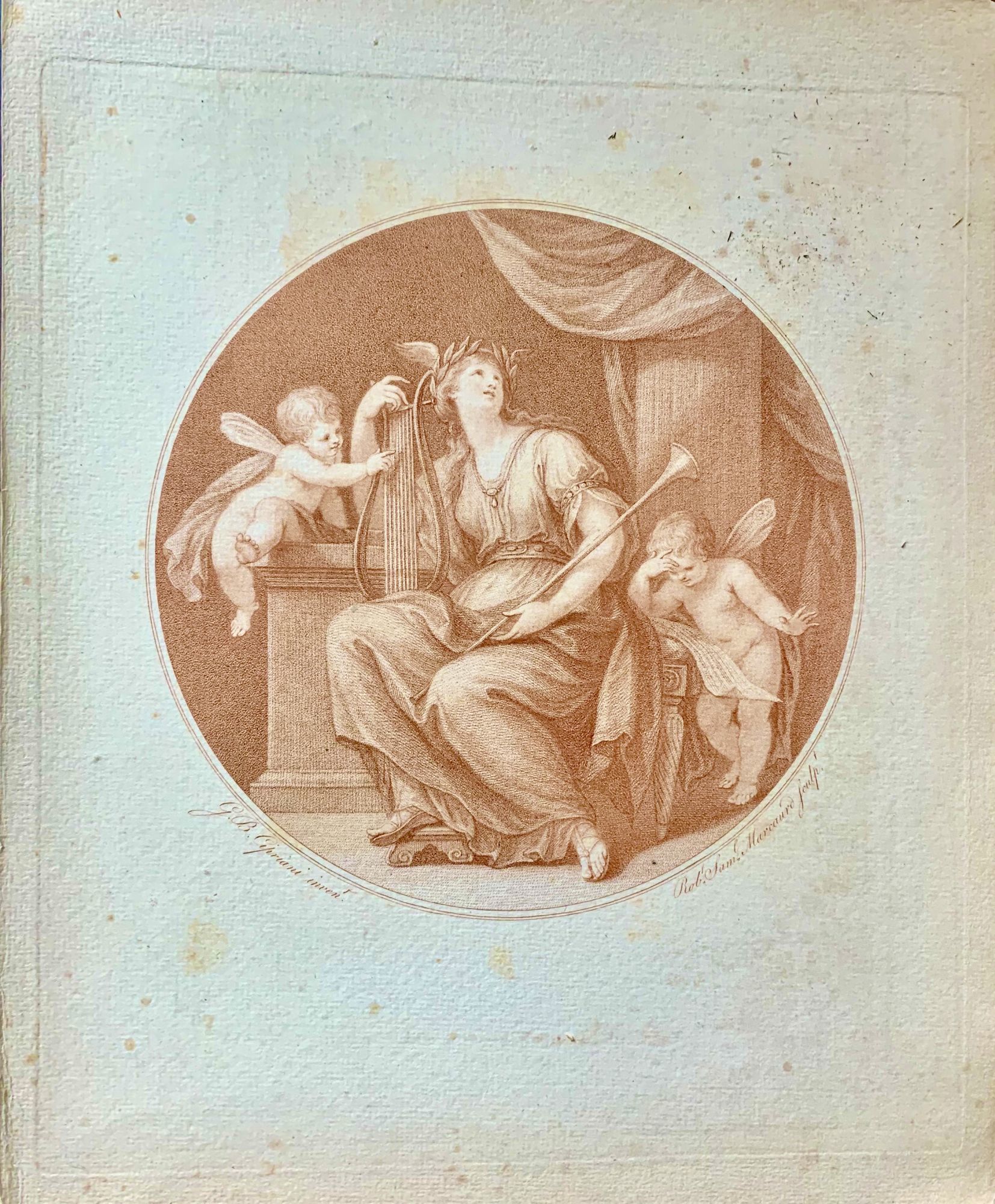 Np: Np, Np. Wraps. Very good. Cipriani, Giovanni Battista. Sepia stipple engraving on wove paper -- image size 17.5 x 17.5 within borders. Giovanni Battista Cipriani RA was an Italian painter and engraver, who lived in England from 1755. He is also called Guise Cipriani by some authors. Much of his work consisted of designs for prints. Engraved by Robert Samuel Marcuard (1756-1788?), a student of Bartolozi.