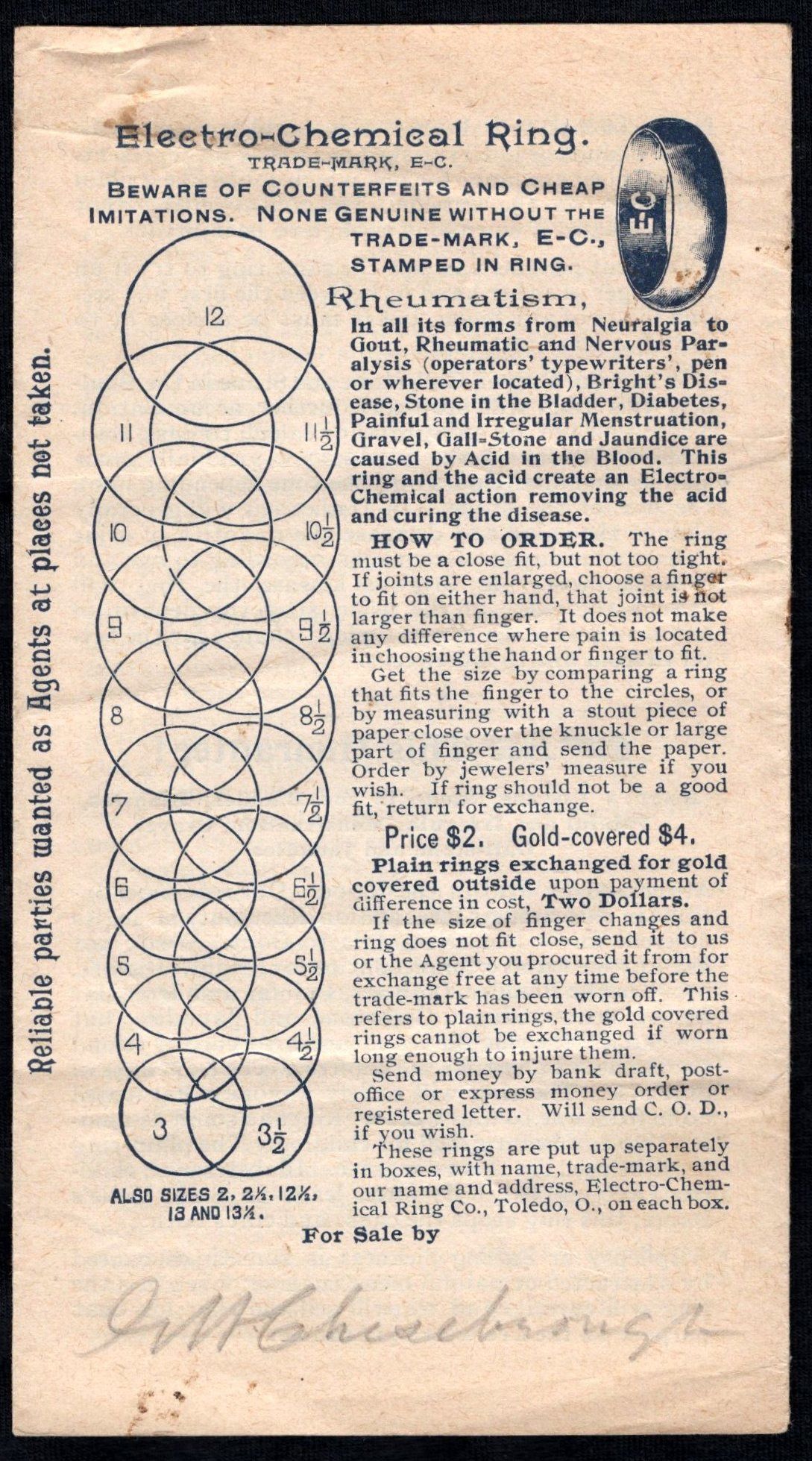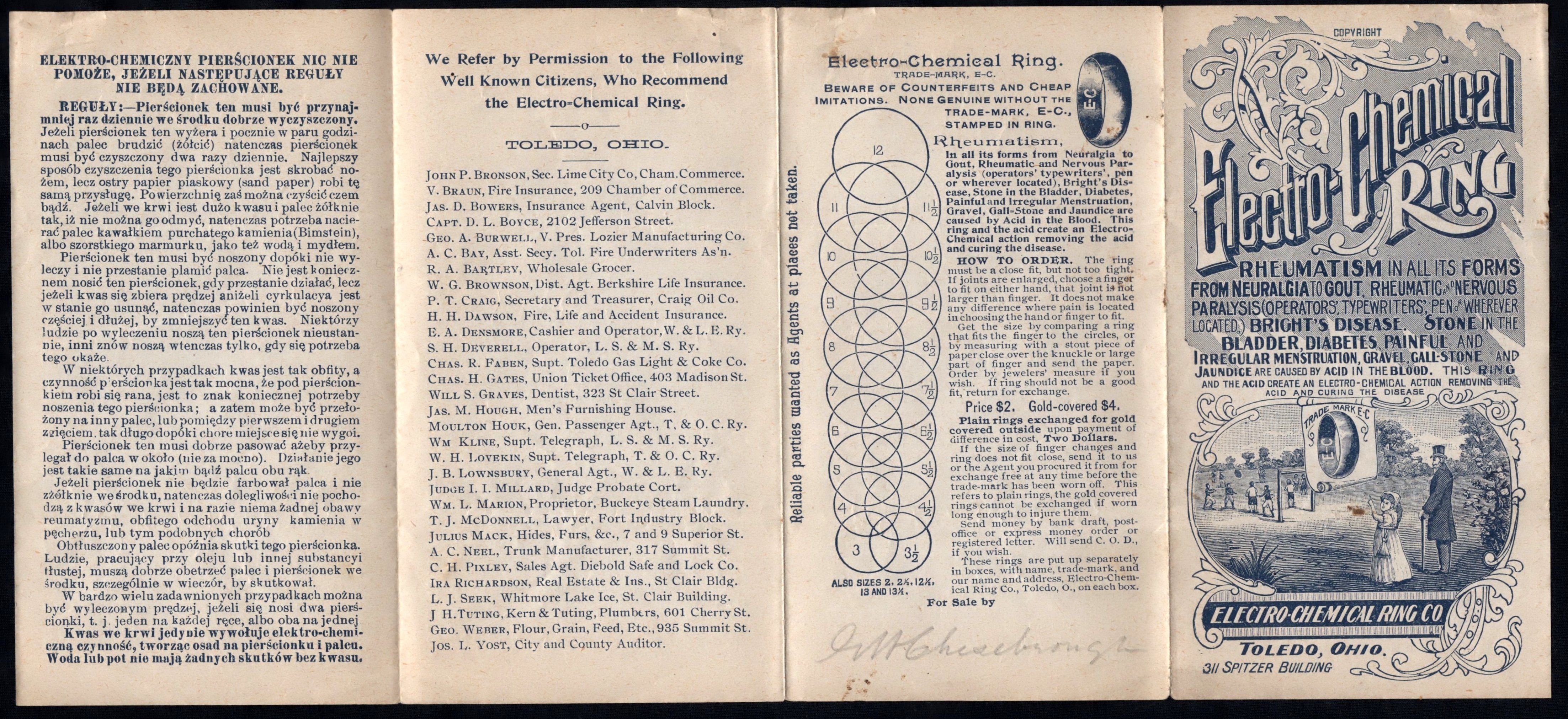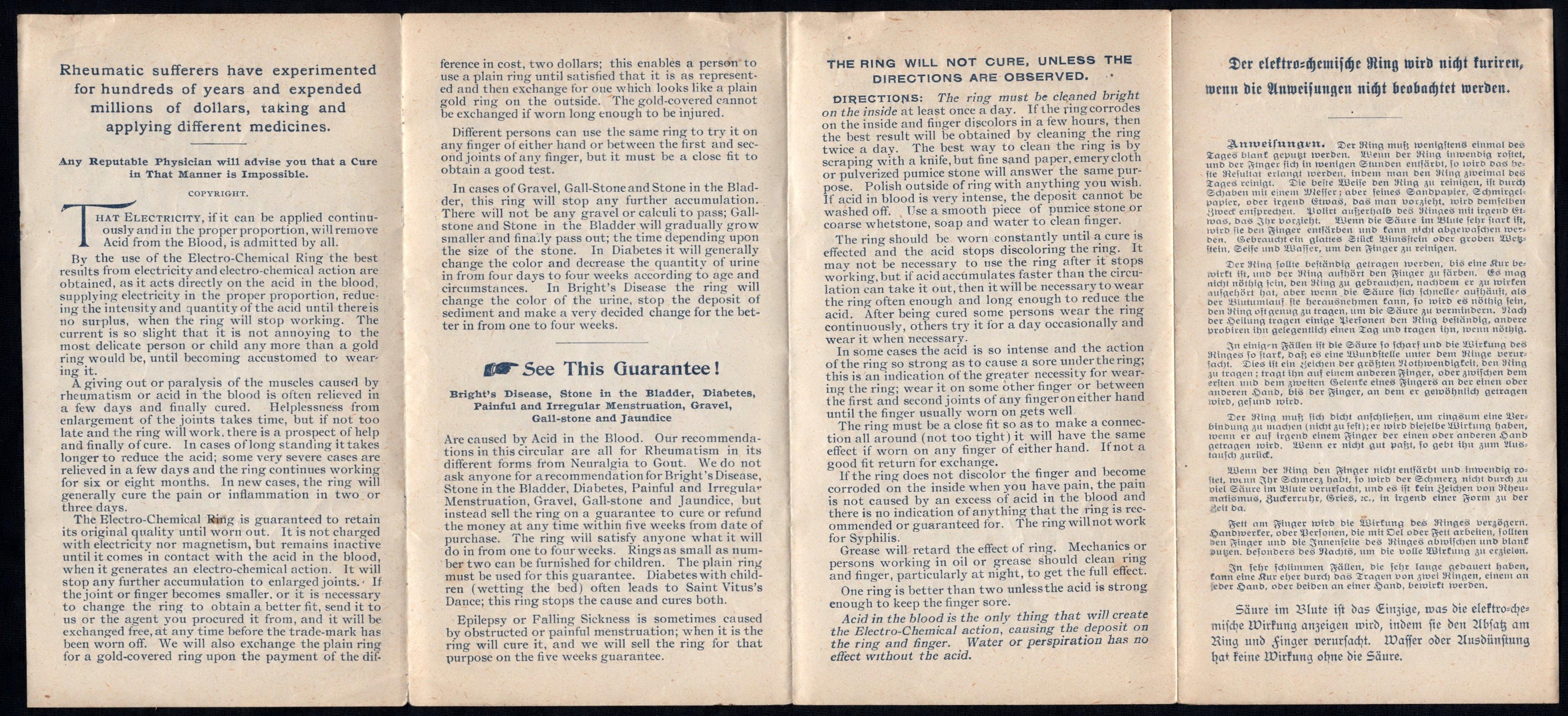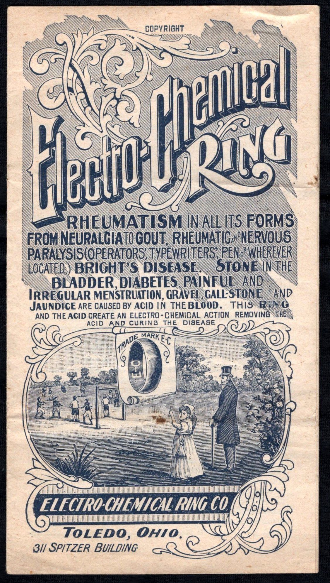 Toledo, Oh: Electro-Chemical Ring Company, [1897-1900]. General wear. Minor penciling and small stain on front cover. . An 8 page fold-out brochure for Electro-Chemical Ring, which was a device that help against "rheumatism in all its forms". The Electro-Chemical Ring was an actual ring that one wore which supposedly "acts directly on the acid in the blood, [by] supplying electricity in the proper proportion, reducing the intensity and quantity of the acid until there is no surplus", at which point the ring would become like any other ring worn. The ring, which could also be purchased in gold, not only cured rheumatism, but also a variety of other diseases caused by 'acidic' blood, such as: Bright's Disease, bladder stones, diabetes, painful or irregular menstruation, gravel, gall stones, jaundice, neuralgia, and gout. They majority of the brochure is text, with two of the pages written in German. However the front and back pages have small black and white illustrations of the ring, a diagram of different ring sizes, and an illustration of children at play in a park. The Electro-Chemical Ring Company appears have been started in the late 1890s by W. G. Brownson, and was at that point located at 311 Spitzer Building in Toledo, OH. Based on other company advertisements, particularly ones in newspapers, the company remained there between 1897-1900, at which point it moved locations within the city of Toledo. 8 pg. folded brochure, two pages in German. 0 OCLC (Jan. 2020). Measures 6 1/4" x 3 1/2" (folded), 13 1/2" x 6 1/4" (unfolded).