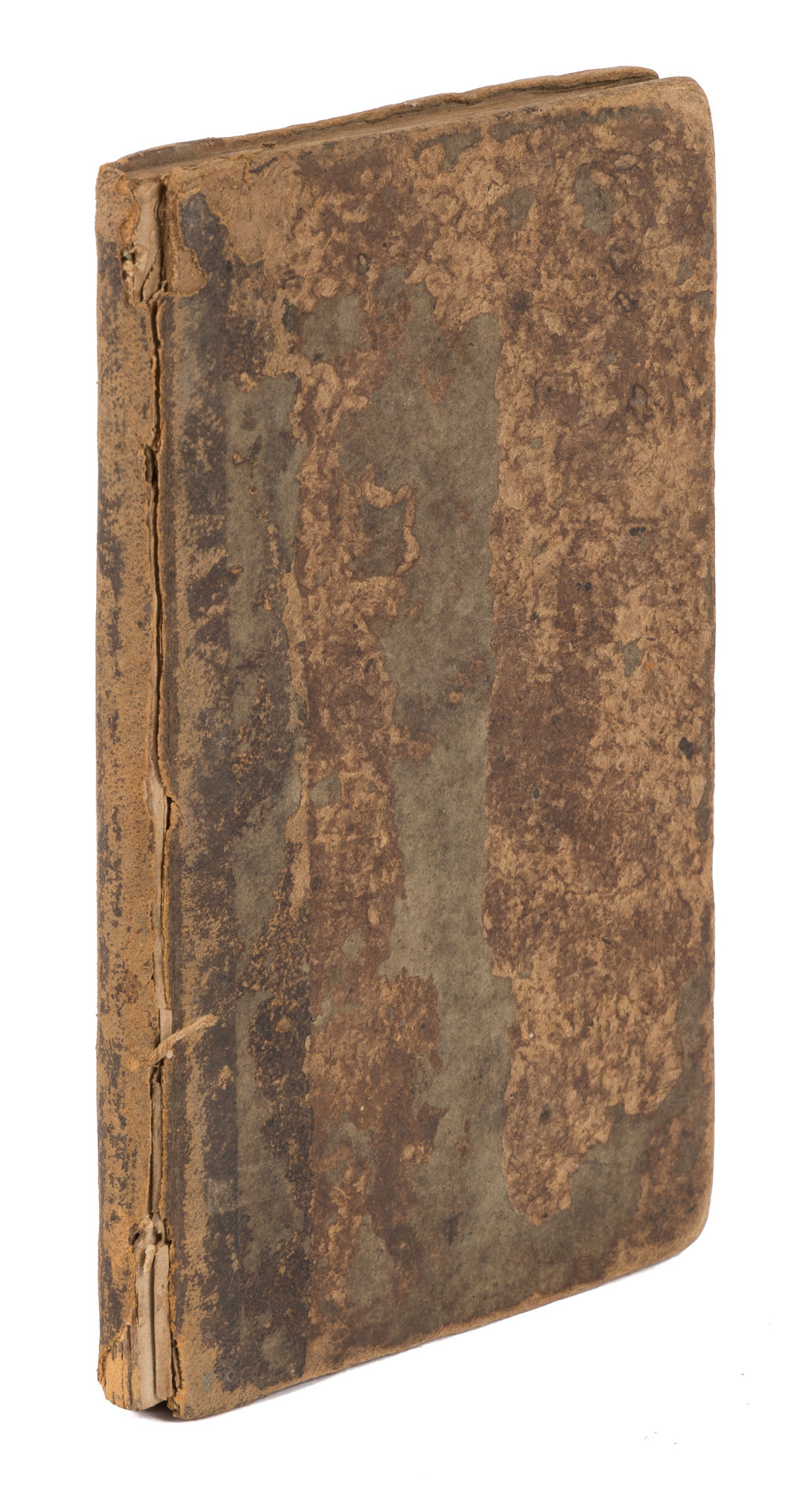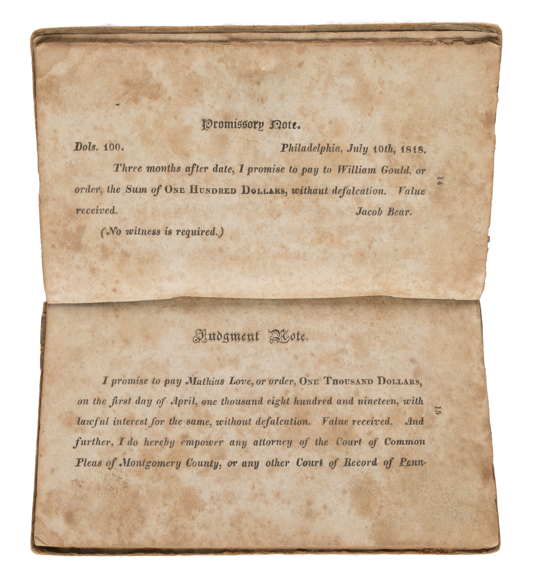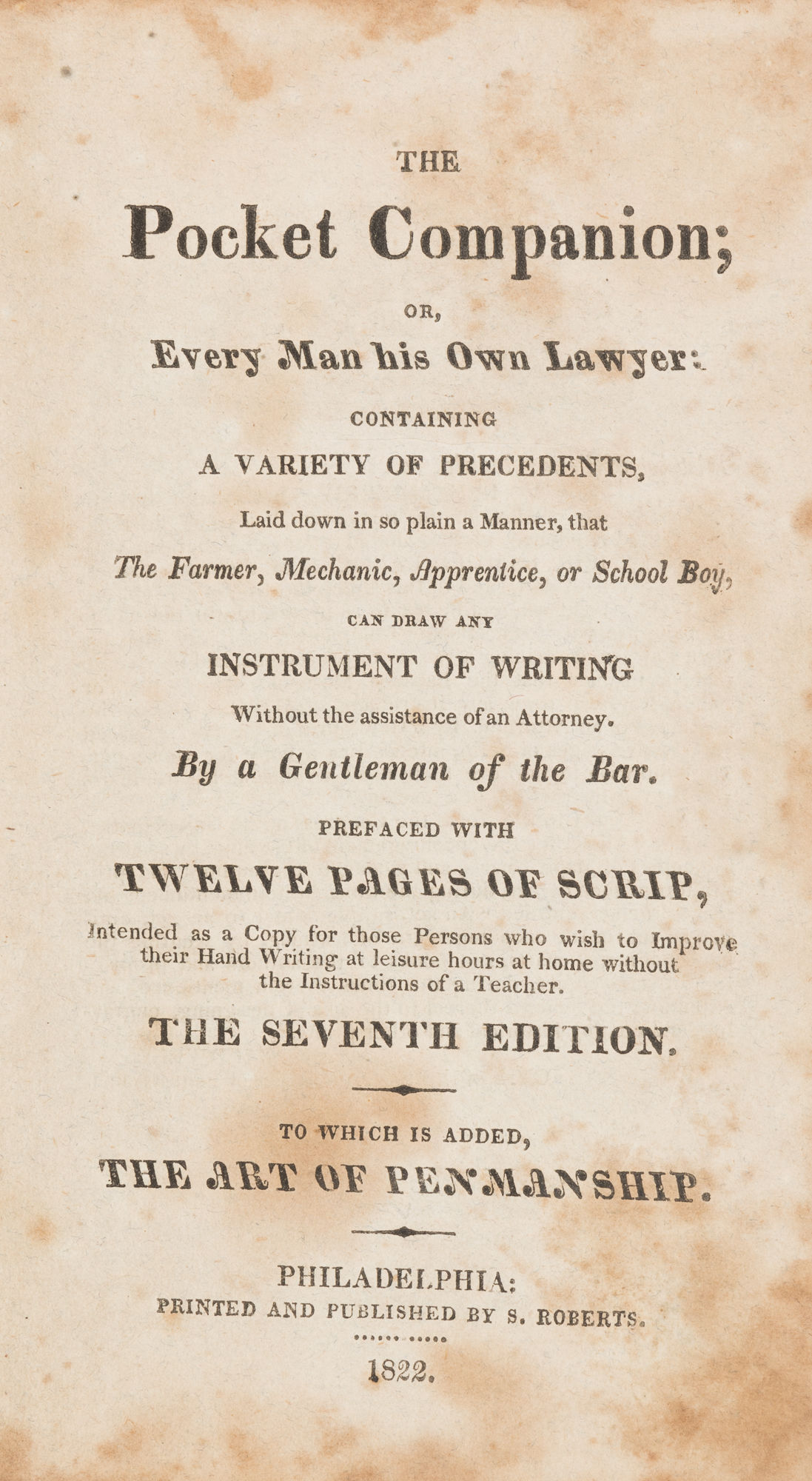 1822. Philadelphia, 1822. 7th ed. 1 of 2 issues.. Philadelphia, 1822. 7th ed. 1 of 2 issues. A Pennsylvanian His Own Lawyer A Gentleman of the Bar. The Pocket Companion; Or, Every Man His Own Lawyer: Containing a Variety of Precedents, Laid Down in So Plain a Manner, That the Farmer, Mechanic, Apprentice, Or School Boy, Can Draw Any Instrument of Writing Without the Assistance of an Atorney. Prefaced with Twelve Pages of Scrip, Intended as a Copy for Those Persons Who Wish to Improve Their Hand Writing at Leisure Hours at Home Without the Instructions of a Teacher. To Which is Added, The Art of Penmanship. Philadelphia: Printed and Published by S. Roberts, 1822. 88 pp. Main text parallel to spine. Pp. 5-12 printed in script. Octavo (7" x 4"). Quarter sheep over plain-paper boards. Rubbing to boards and extremities with wear to spine ends and corners, front board and free endpaper detached. Light browning and foxing to text, light edgewear to a few leaves. $50. * Seventh edition, one of two issues. This popular formbook for laymen was first published in 1818. Later editions and adaptations were published into the 1840s. There is another issue of the seventh edition with a 47-page guide to penmanship. (Both issues have identical title pages mentioning this guide, which is a source of confusion today.) Cohen, Bibliography of Early American Law 8120.