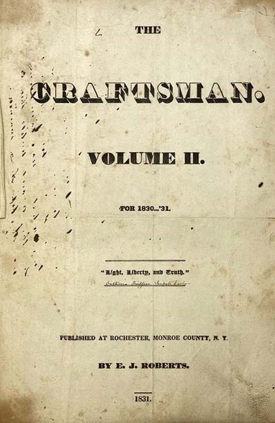 Rochester: Published at Rochester, Monroe Co., N.Y, 1831. Large Hardcover. Fair/No Jacket. Title page and leaves of the first number (pp. 1-8) detached and cropped close, occasionally touching text at bottom or fore-edge, title similarly cropped without loss, short tears and stains throughout, contemporary signature of John M. Burt of Smithville, N.Y., later ownership markings of the Burt and Griffin families of Jefferson County, N.Y., bookplate of the Grand Lodge of New York on the front pastedown and their small blindstamp on corner of title and occasionally in text. 1831 Large Hardcover. Small folio, contemporary leather spine and corners, marbled boards. [4], 1-19, 22-80, 89-112, 129-152, 161-168, 177-184, 209-216, 241-264, 289-320, 329-360, 369-376, 385-408 (of 416) pp, irregularly paginated. Being nos. 1-10, 12-14, 17-19, 21, 23, 27, 31-33, 37-40, 42-45, 47, 49-51. Altogether, 34 of 52 issues, bound under a general title with index leaf. Very scarce, comprising nearly one third of the 104 issues of this weekly, the principal organ of Western New York Masonry after the Morgan affair. The 260 pages present here contain a wealth of information on Masonic and Anti-Masonic activities in New York, especially the legal proceedings and political machinations that took place in the aftermath of Morgan's abduction and presumed murder. There is much material on the Whitney and Gillis trials and on the libel suit against Roberts for his coverage of the former. There are numerous accounts of meetings and conventions. Special Prosecutor John C. Spencer, local anti-Masonic editor Myron Holley and Frederick Whittlesey, to take just several examples, are frequent objects of attack. Local rivals Thurlow Weed and Henry O'Reilly are mentioned less frequently, generally with humor or grudging respect. The section of the index, 'On the Excitement' takes up one and a half columns and has well over 100 entries. The 'Political' section of the index takes up more than a full column. It can be difficult to extricate the political from the anti-Masonic coverage. But the paper did have an interest in the more radical elements of Jacksonian democracy. Several of President Jackson's proclamations are reprinted in full, in particular the 15,000 word second annual address to Congress of December 7, 1830. Imprisonment for debt and the Sabbath Mail question are issues that recur. Local coverage includes an extensive account of the 'Rochester Liberal Meeting' of January, 1831, which elicited some angry replies from readers. Mark and Schwab* note that the resolutions of this organization indicate its spiritual affinity with the Working Men's Party of New York. The Friends of Liberal Principles and Equal Rights opposed ecclesiastical influence and the attempt to stop Sunday mails. It favored equality of education and the abolition of imprisonment for debt, and sympathized with the contemporaneous revolutions in Europe. The balance of the index, 'Miscellany' constitutes 3+ columns reflecting the roughly 50% of each issue that is given over to poetry and prose, some of it original, extracts from foreign journals, brief notices of local events, &c. In addition to many anonymous poems, the native literature includes the following frontier stories: Wakonda, a Tale of the Frontiers and Roger Dimon, a Story of the Canadian Frontier, both by Wyllys Gaylord of Otisco, N.Y.; The Mohawk's Revenge (a female captivity) by 'Eva'; Lundy's Lane by 'C.A.G.' of Utica; and Oolaita, a Story of the Wilderness (set in Ohio) signed 'L.P.M.' Other American stories include: First Love, written for The Craftsman by 'Edith'; The Execution. A Story of the Revolution, by Mrs. Grace H. Plumb, head of the School For Ladies in Rochester; The Family Meredith by Miss Eliz. Bogart, a romance set in tidewater Virginia; Lucy Moore, set in Middletown, Conn., written by 'Brentwood' of Mt. Vernon, Ohio; The Tent by James Lawson, extracted from Tales and Sketches, by a Cosmoplite (N.Y.: Bliss, 1830), and a lurid tale by W.L. Stone, The Dead of the Wreck (reprinted from Atlantic Souvenir for 1831), set in the Gulf of St. Lawrence, involving cannibalism, death by freezing, &c. Poetry includes numerous anonymous contributions with American themes. Signed compositions include poems by Prosper M. Wetmore, Samuel Woodworth, Cornelius Vanarsdale, and by 'D.S.B.' of Jamaica, L.I., 'C.' of Bangor, Me., 'Corninna' of Philadelphia, The Lost Ship, based on the wreck of the U.S. sloop of war Hornet, by 'T.V.H.' of Syracuse, and The Spirit by 'C.A.G.' of Utica. Strangely (and sadly) there is no mention of Joseph Smith and The Book of Mormon (published in Palmyra in May, 1830). There are two brief allusions to Mormonism, however: a notice of May 11, 1830 on the demise of the Geneva Chronicle, conducted by Franklin Coudery [sic], cousin of Oliver Cowdery; plus the following squib at the foot of page 385: Married… In Batavia, Nov. 23 [1830], by the hon. S. Cummings, Mr. GEORGE W. HARRIS, to Mrs. LUCINDA MORGAN, wife of Capt. William Morgan. WorldCat records holdings at 10 institutions but most of these are scattered and/or defective. An 'Appeal to the Public' by the Masons of Jefferson Co., N.Y., present here, lists John M. Burt among the brethren of Adams Township. *Mark & Schwab (eds.) The Faith of Our Fathers: An Anthology Expressing the Aspirations of the American Common Man, 1790-1860 (N.Y. 1952), page 274ff.