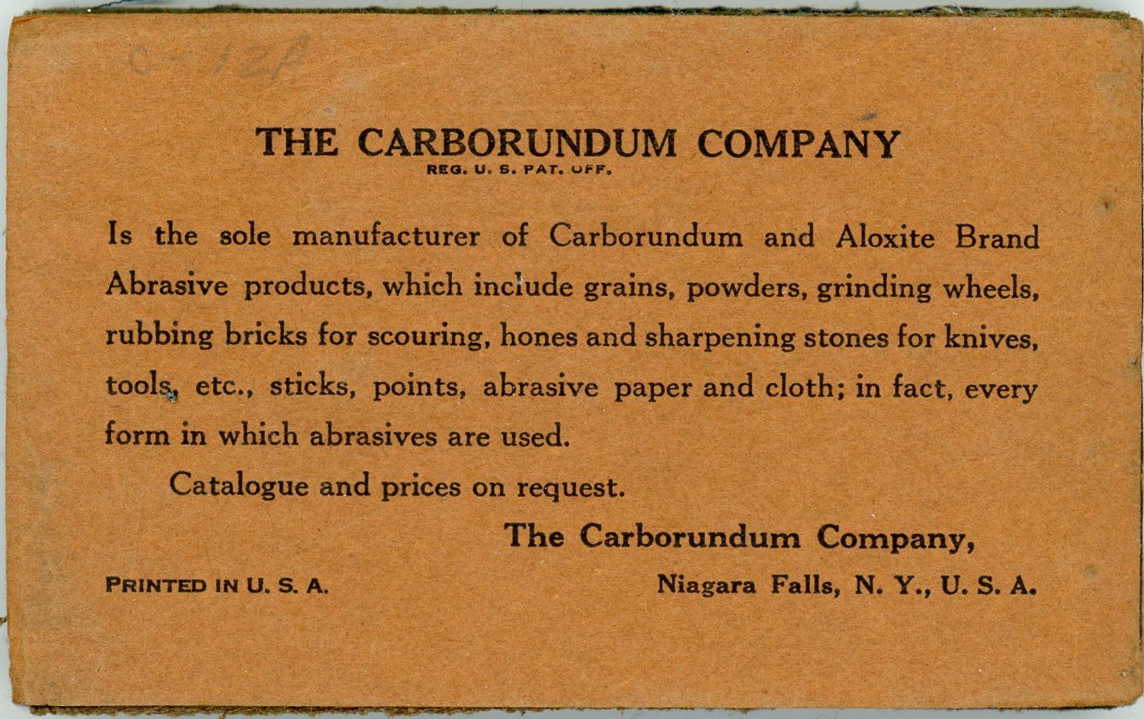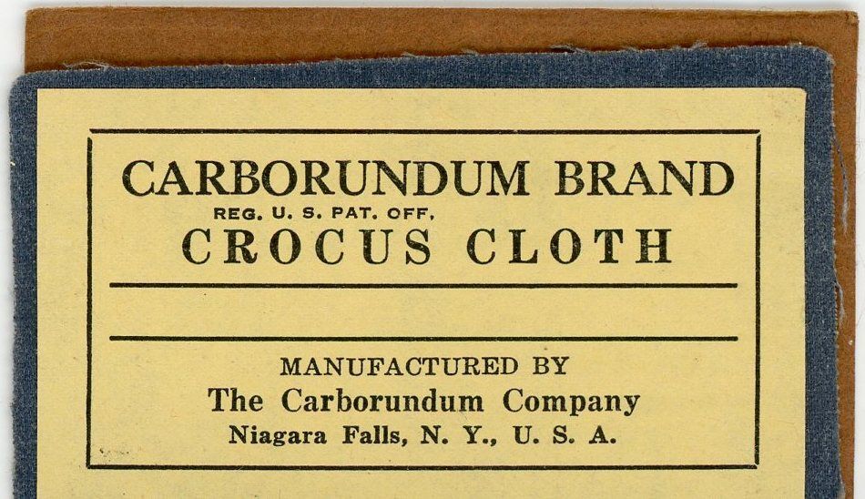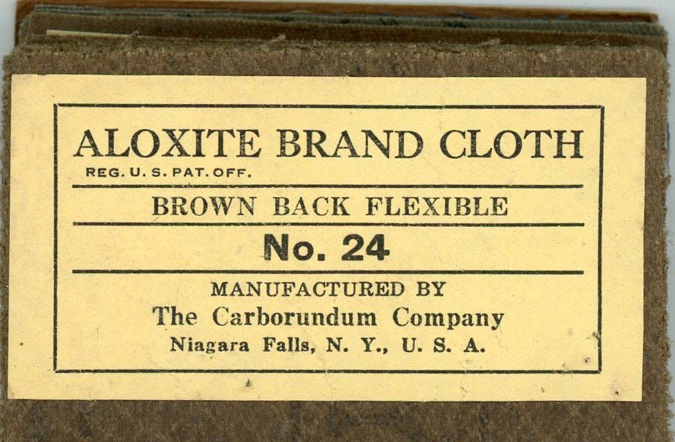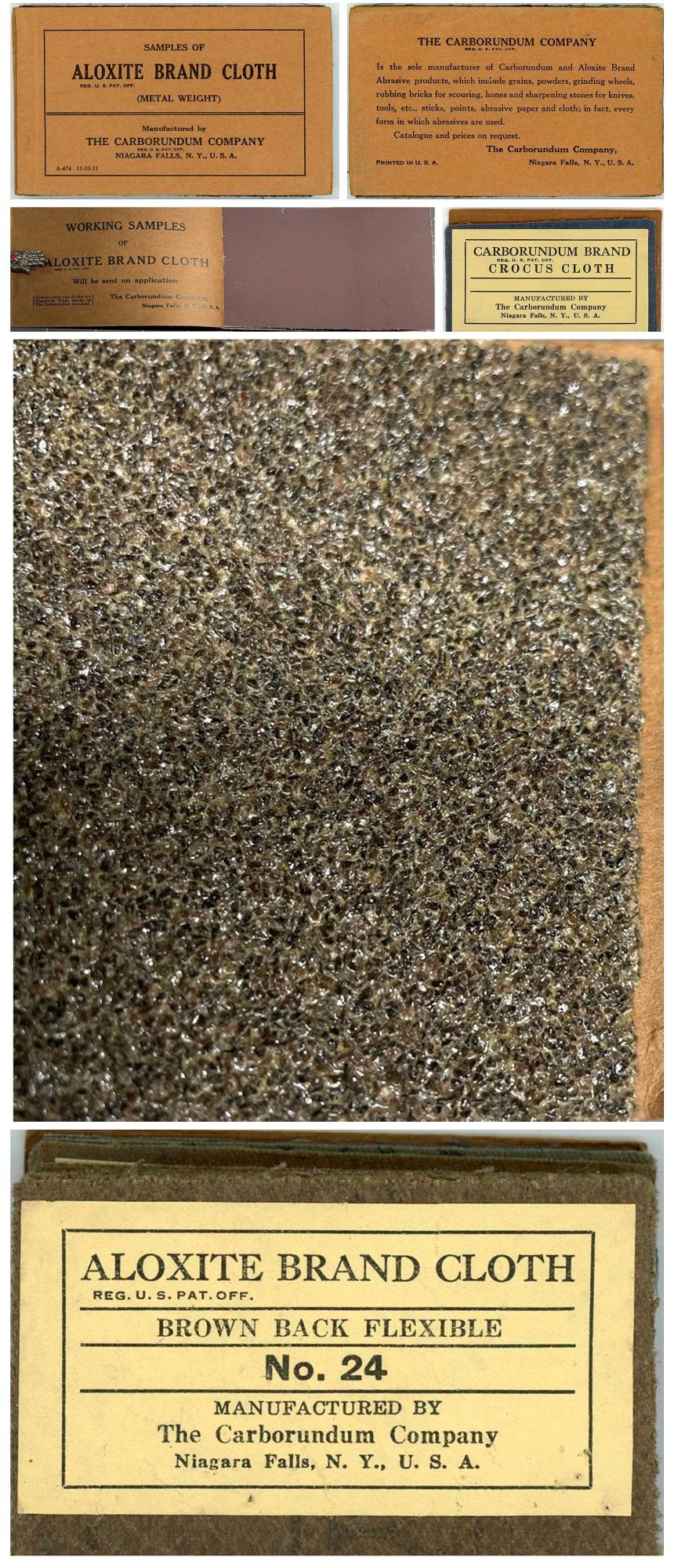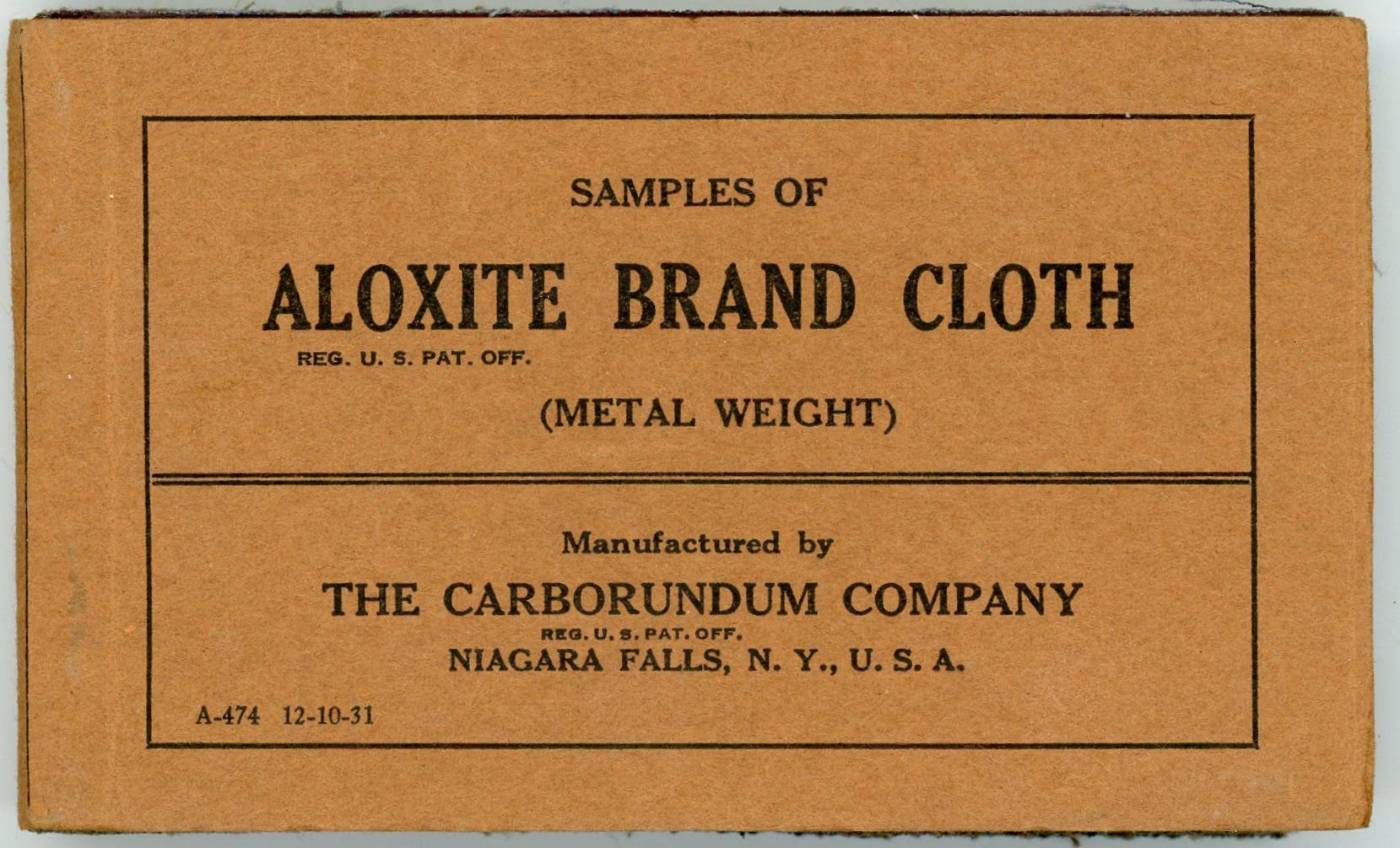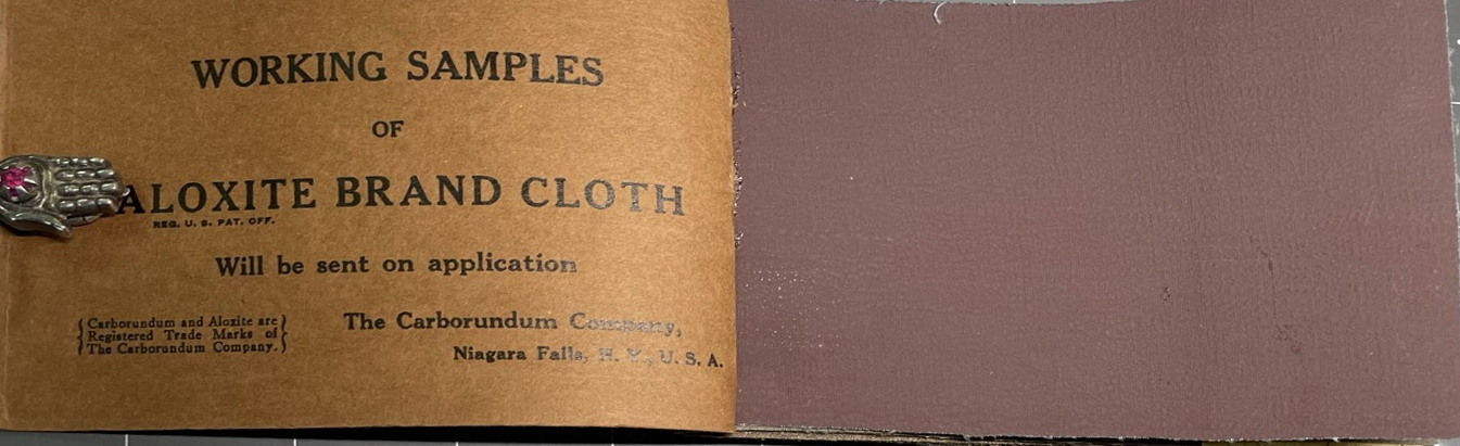 Niagara Falls, NY: Carborundum Company, 1942. Unused.. The 3" x 5" sample booklet includes 14 different weights/grades of the abrasive cloths - from the very finest - Crocus Cloth and Brown Back Flex No. from No 24 to No.320.. Printed wraps. An usual usable sample book. The back cover reads: The Carborundum Company is the sole manufacturer of Carborundum and Aloxite Bran Abrasive products, which include grains, powders, grinding wheels, rubbing bricks for scouring, hones and sharpening stones for knives, tools, etc. sticks, points, abrasive paper and cloth, in fact, every form in which abrasives are used.