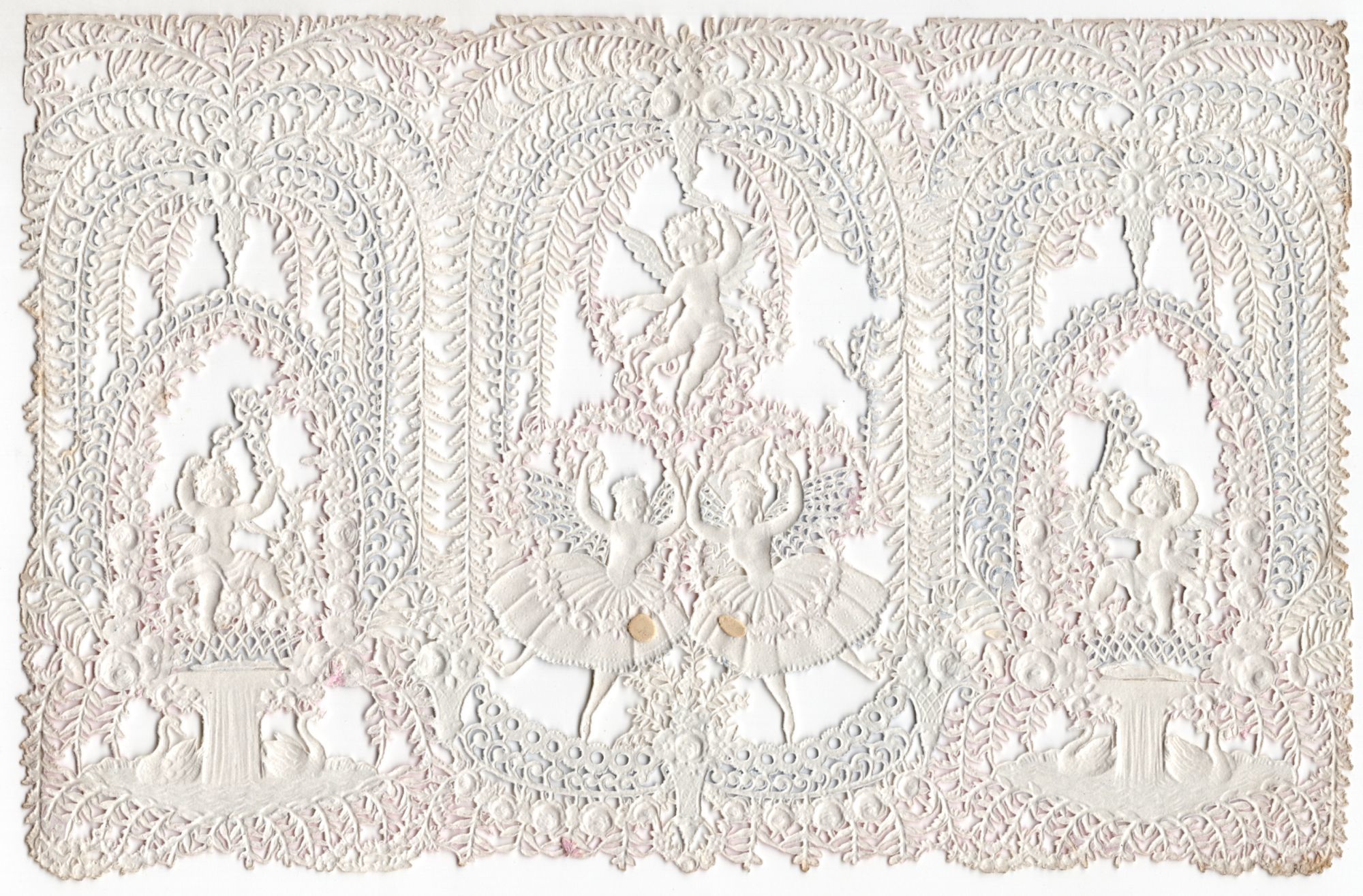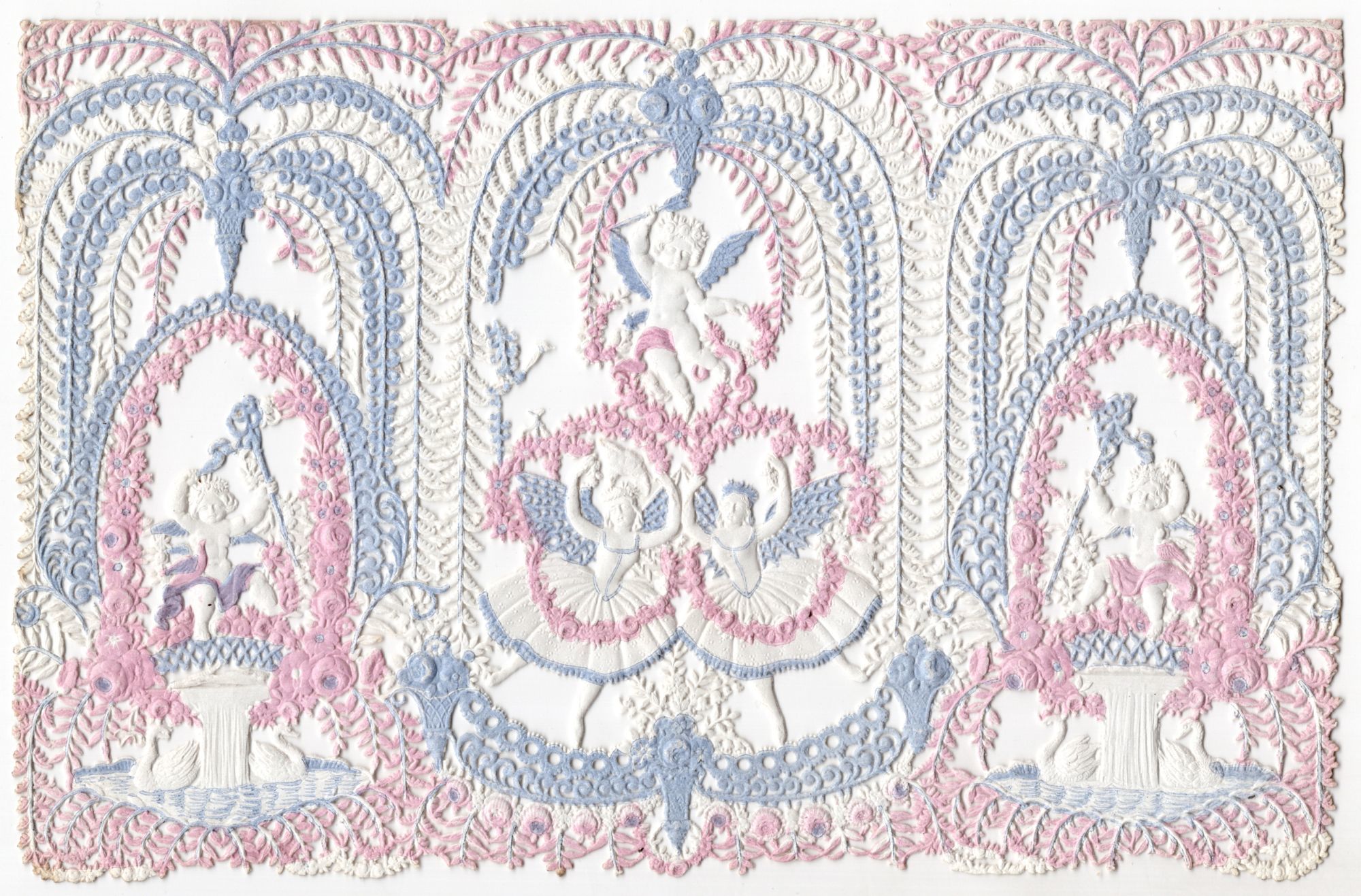 United States, 1850. Very good to near-fine. The most minor of toning around the edges.. An elaborate and remarkably well-preserved embossed lace paper colored with blue and pink, depicting ballerinas, putti, and swans underneath a canopy of weeping willow branches. Measures approx. 4.5" by 7", for octavo-sized Valentine.