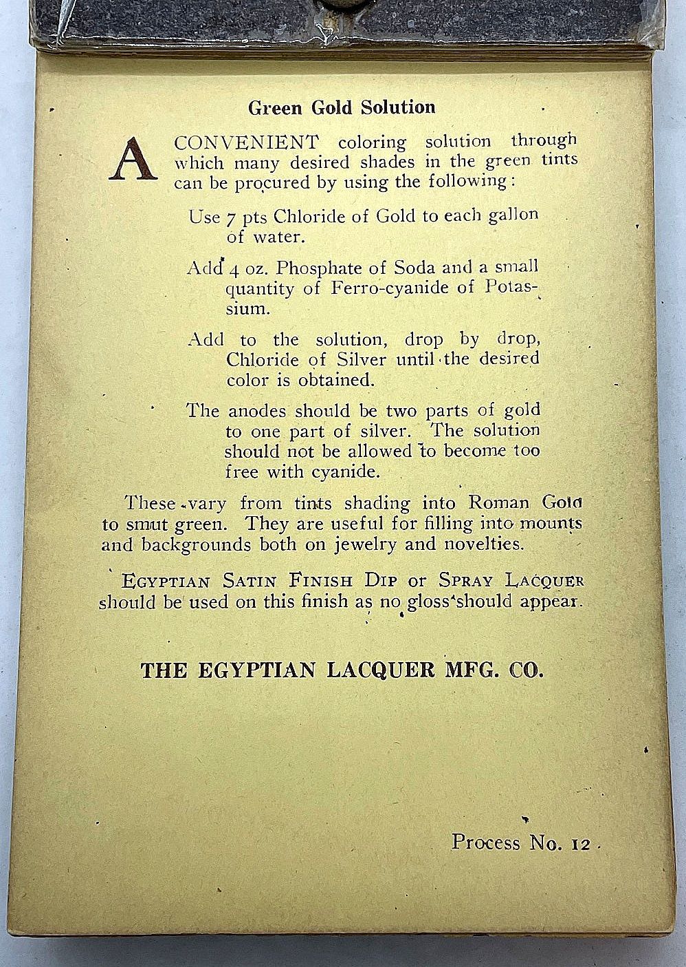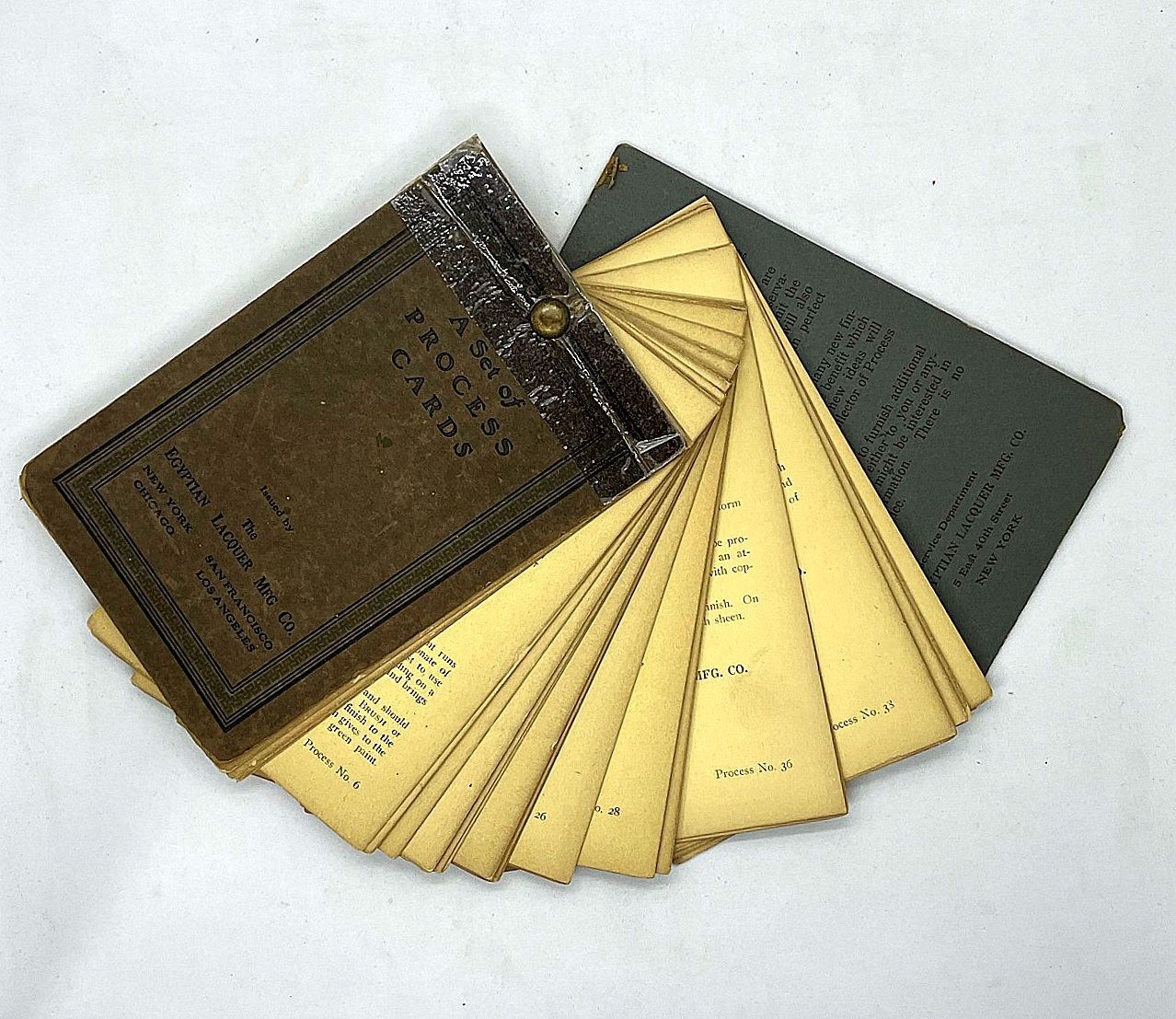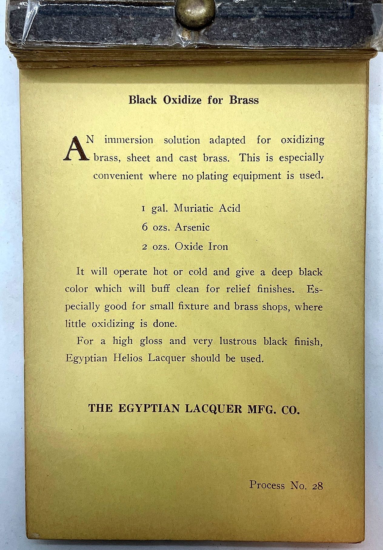 New York etal: Egyptian Lacquer Mfg Co, 1900. Break on board cover reinforced with tape. Wear from handling.. A Set of 47 Process Cards with recipes and complete instructions to prepare chemical solutions of lacquers and finishes... This fan-out page 'book' offers a line of formulations for industrial users. Each card includes a description of the product followed by the ingredients and quantities for the solution and concluding with preparation and application instructions. Each card is numbered at the bottom left. Examples include: Black Nickel Solutions - Gun Metal Finish, Gold Plating Solutions for Lighting Fixtures, Statuary Bronze Oxidize and Heavy Brown Dip for Copper. The set is held together with a large brad at top and fans out to expose the full card. The set was designed to be added to. The back inside cover indicates additional cards for new finishes would be added monthly. It was also designed to keep the set together Measures 7" x 4 1/2'. The company adopted the "Egyptian" name in 1892, when archeological explorations in Egypt revealed ancient artifacts were preserved with a lacquer-like coating. Over the years these coatings have a solid history for developing environmentally safe coatings.