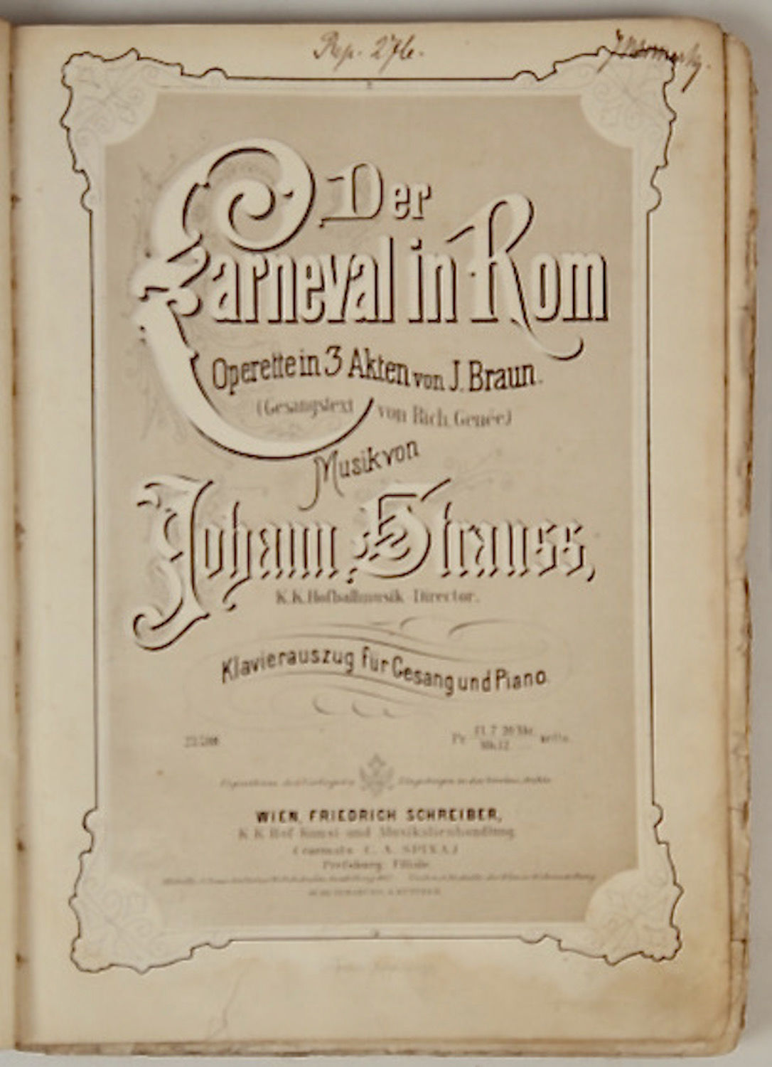 Der Carneval in Rom, a comic opera to a libretto by J. Braun after V. Sardou's Piccolino, was first performed at the Theater an der Wien on 1 March 1873.