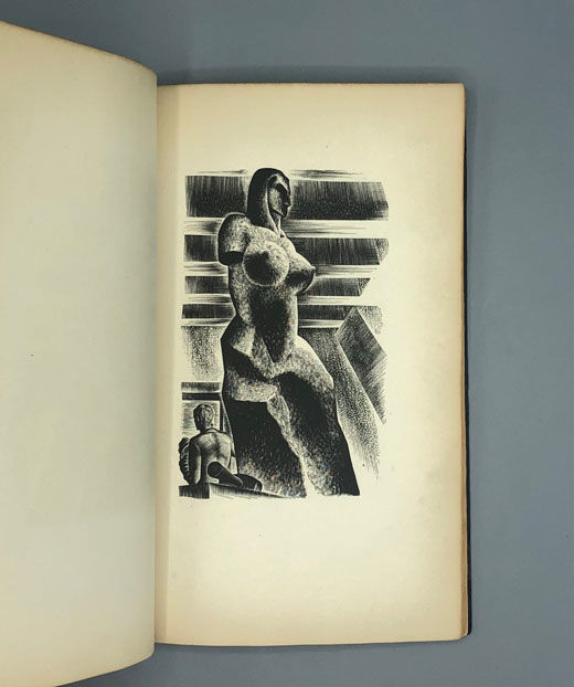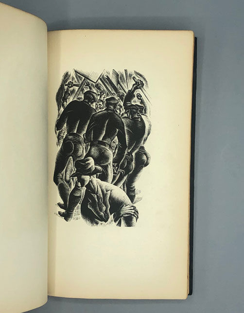 New York: Equinox Cooperative Press, 1933. First edition. Very good. SIGNED. Octavo [23 cm] Handbound with a black string-tie binding, 1/4 copper foil with black star-patterned decorative boards, and an embossed title on the spine. Matching decorative pastedowns. Light rubbing to extremities; string binding broken in two places, some light soiling to boards; pages toned. Lacks the foil slipcase. A story told entirely via wood engravings by the author. This edition was limited to 920 signed and numbered copies, of which this is number 598. Signed on the limitation page by Lynd Ward. This is the fourth of six wordless novels that Ward produced between 1929-1937. Dance 008.