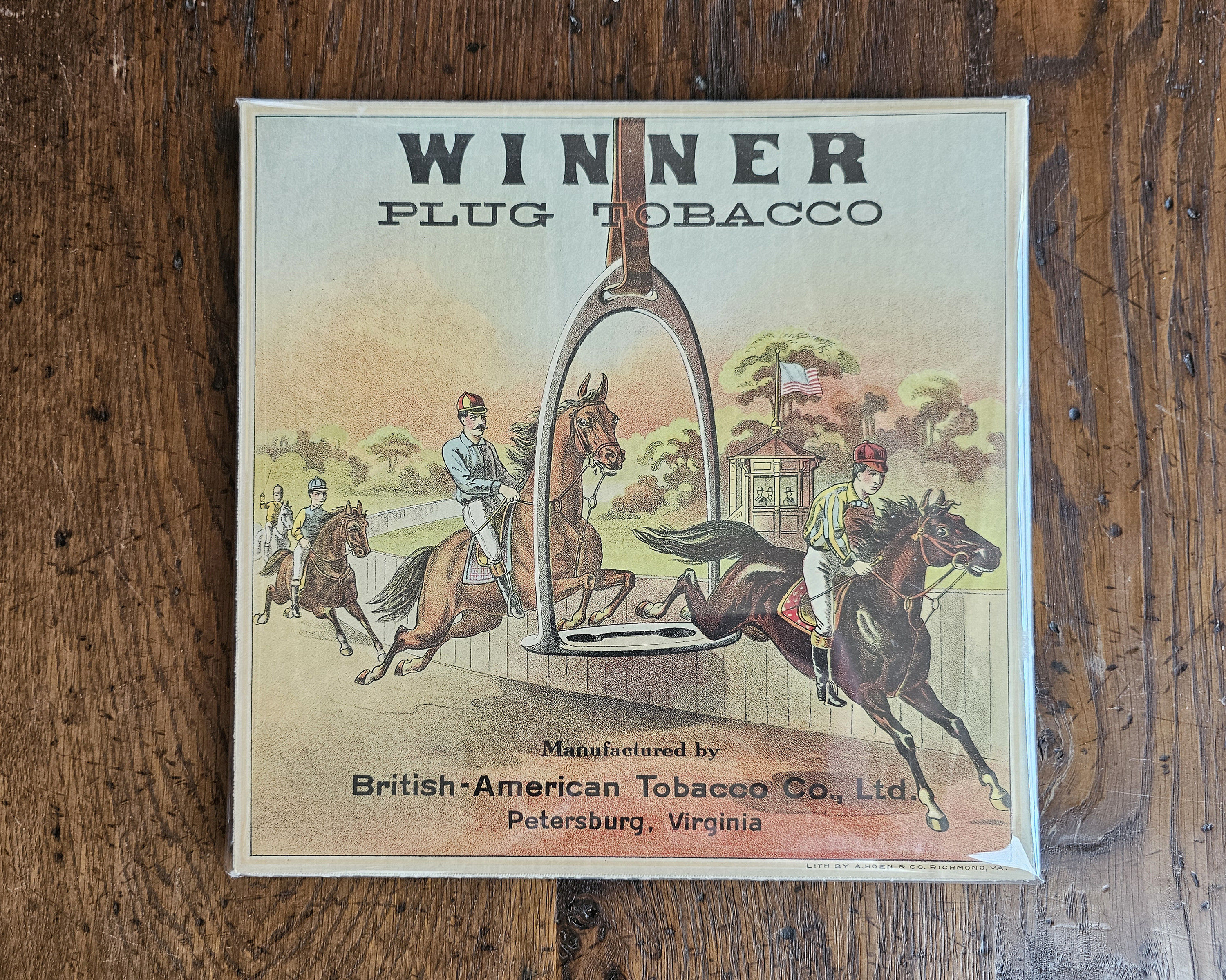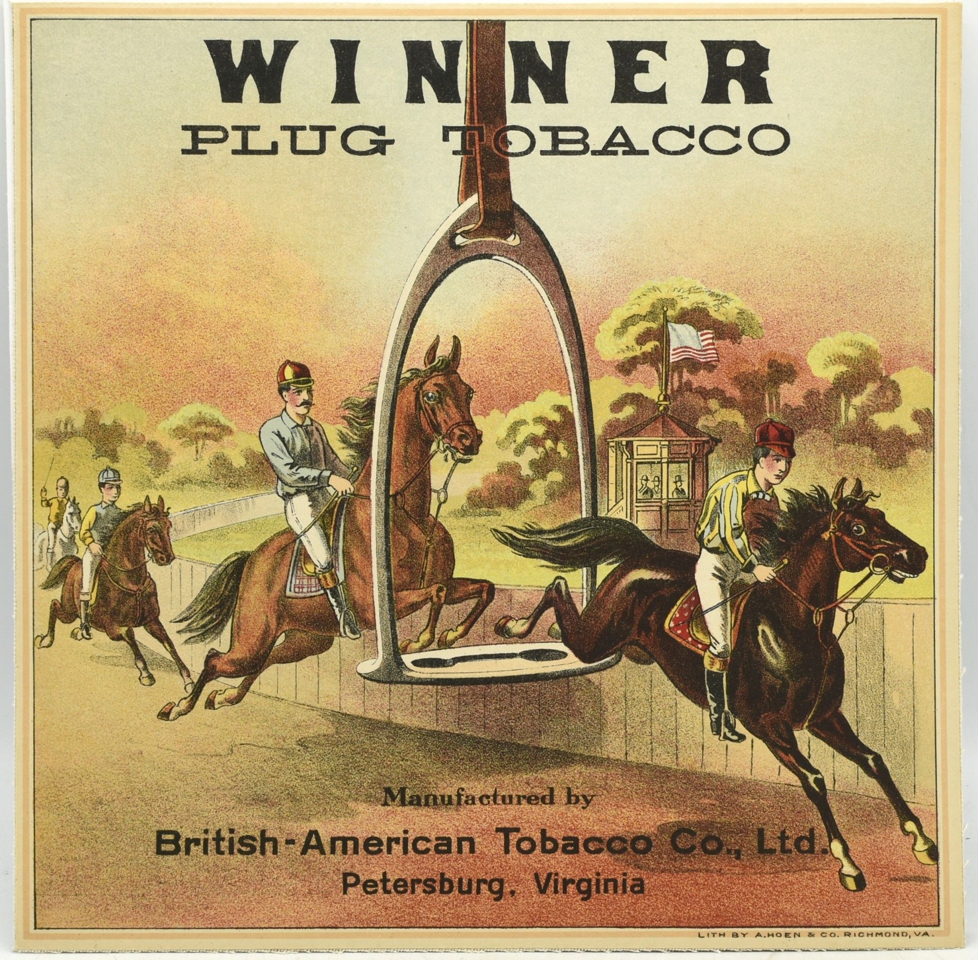 Richmond, Va: A. Hoen & Co, 1890. 10 3/8 x 10 3/8”; color chromolithograph label for “Winner Plug Tobacco” backed in linen. The British-American Tobacco Co. was the advertising company and labels such as these were intended to be pasted onto tobacco crates and barrels. With a fantasy horse race image.~~The Hoen Company was founded by August Hoen in Baltimore (the factory can be seen to this day from the Amtrak train going through Baltimore) and relocated to Richmond. Hoen’s lithographs were “top of the line” so it is not surprising that the wealthy tobacco companies employed their lithographic art.