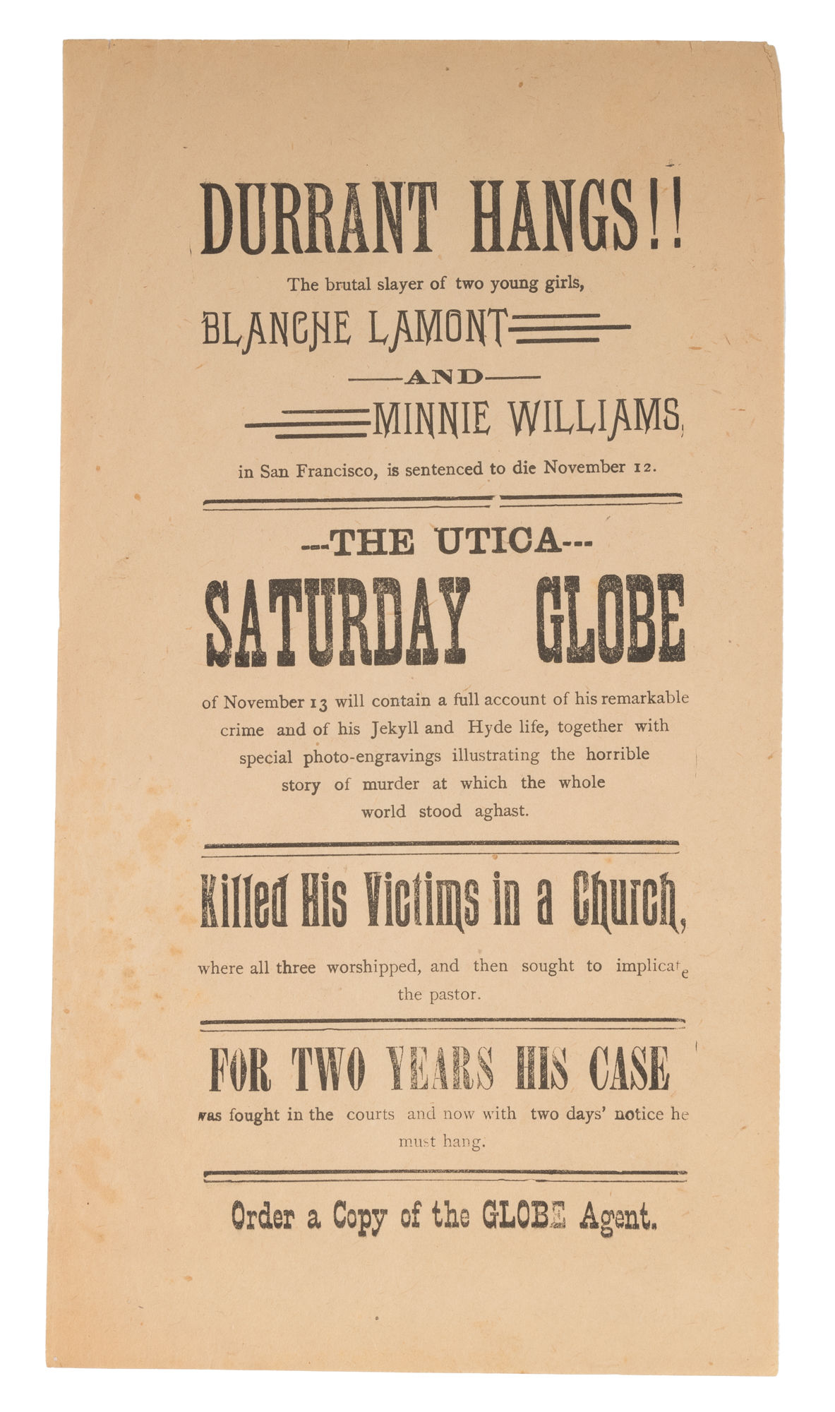 1890. The Brutal Slayer of Two Girls" [Publisher Advertisement]. Durrant Hangs!! The Brutal Slayer of Two Girls, Blanche Lamont and Minnie Williams in San Francisco, Is Sentenced to Die November 12. [Utica, NY: The Utica Saturday Globe, 1890]. 9-1/4" x 5" broadside, single-column text below headline. Light browning, negligible faint dampstain to left-hand margin. $650. * Durrant, the assistant Sunday School Superintendent at the Emmanuel Baptist Church in San Francisco, raped and murdered Minnie Williams, a member of the congregation, when she was decorating the church for Easter Sunday. While investigating that crime, the police discovered that Durrant murdered another girl, Blanche Lamont. The Utica Saturday Globe was a well-regarded illustrated newspaper that was distributed nationally. This small broadside is an advertisement for the paper's account of the Durrant case in its upcoming issue. The reader is promised "special photo-engravings illustrating the horrible story of murder at which the whole world stood aghast." OCLC locates 3 copies (Syracuse University, UC-Berkeley, Yale Law School).