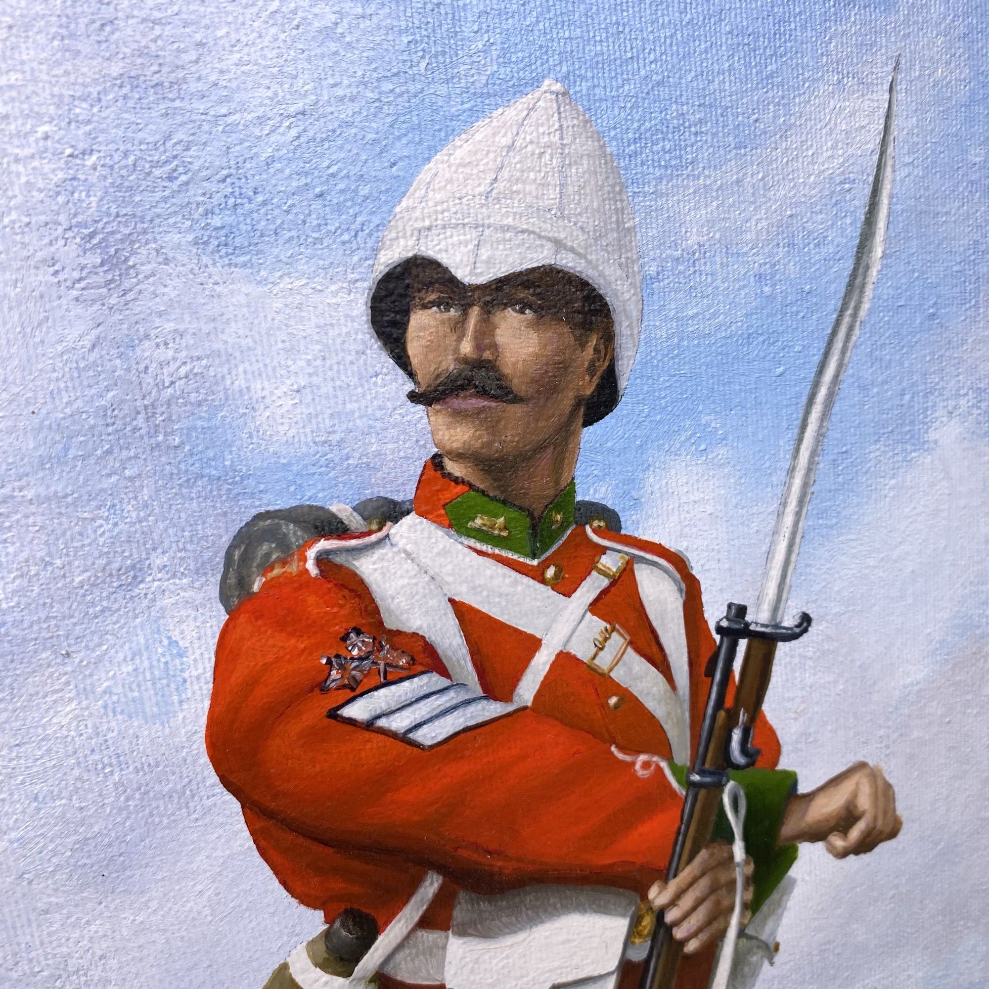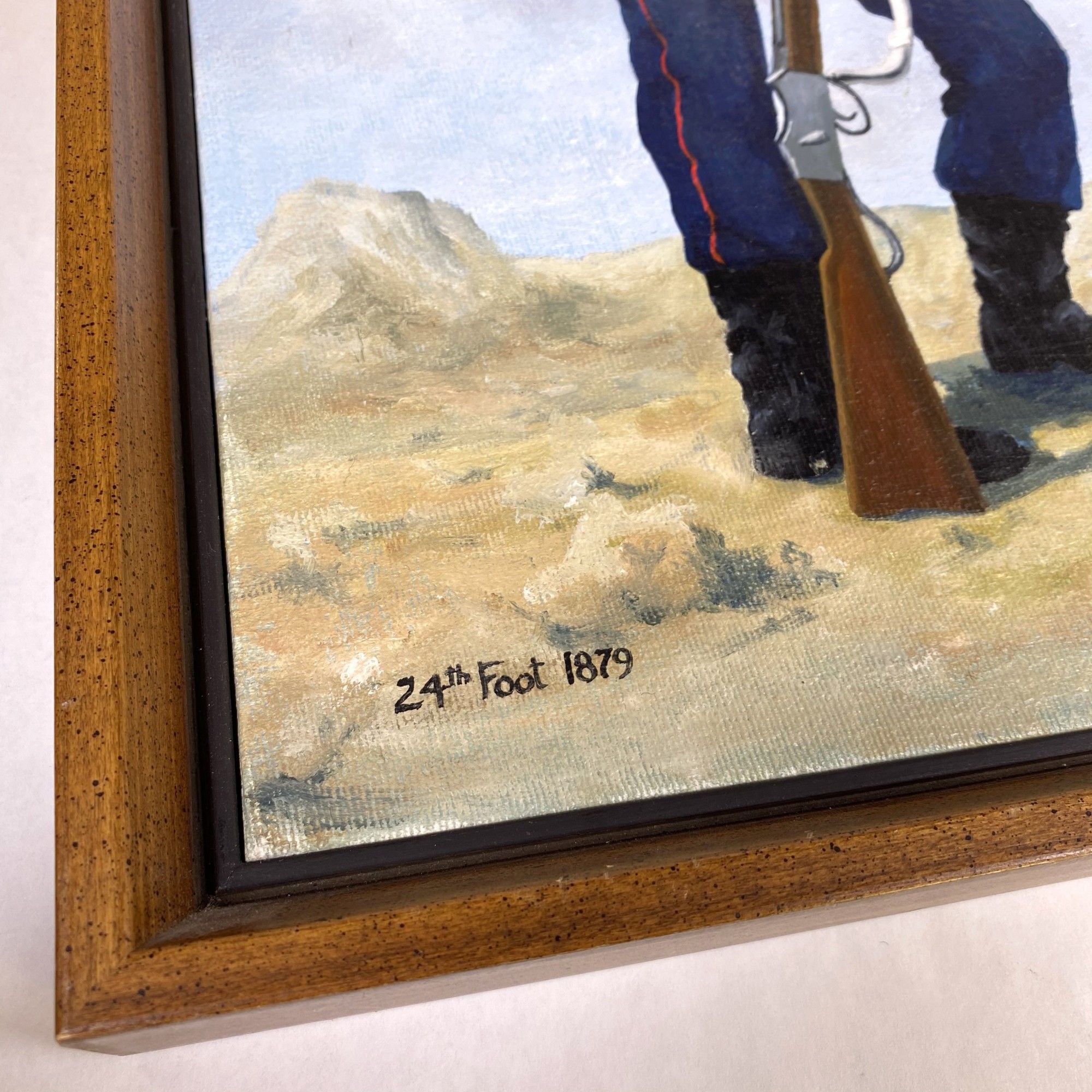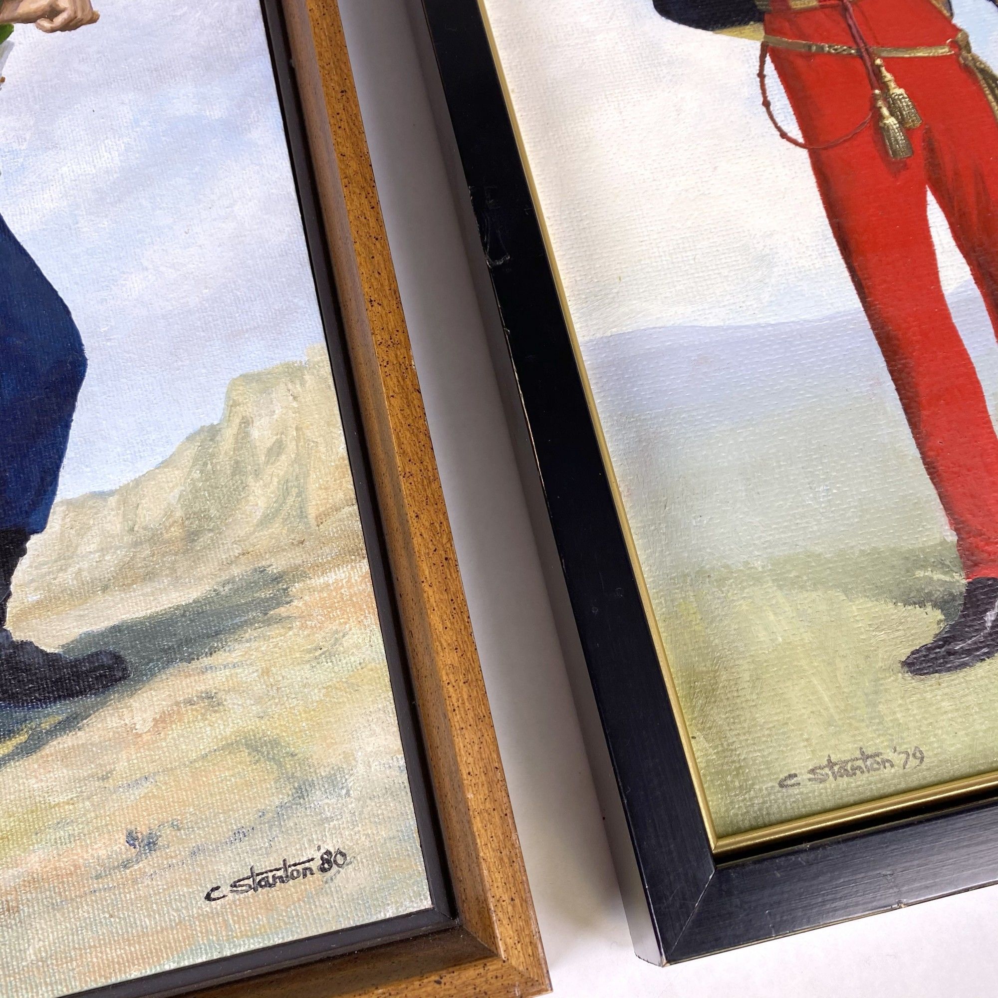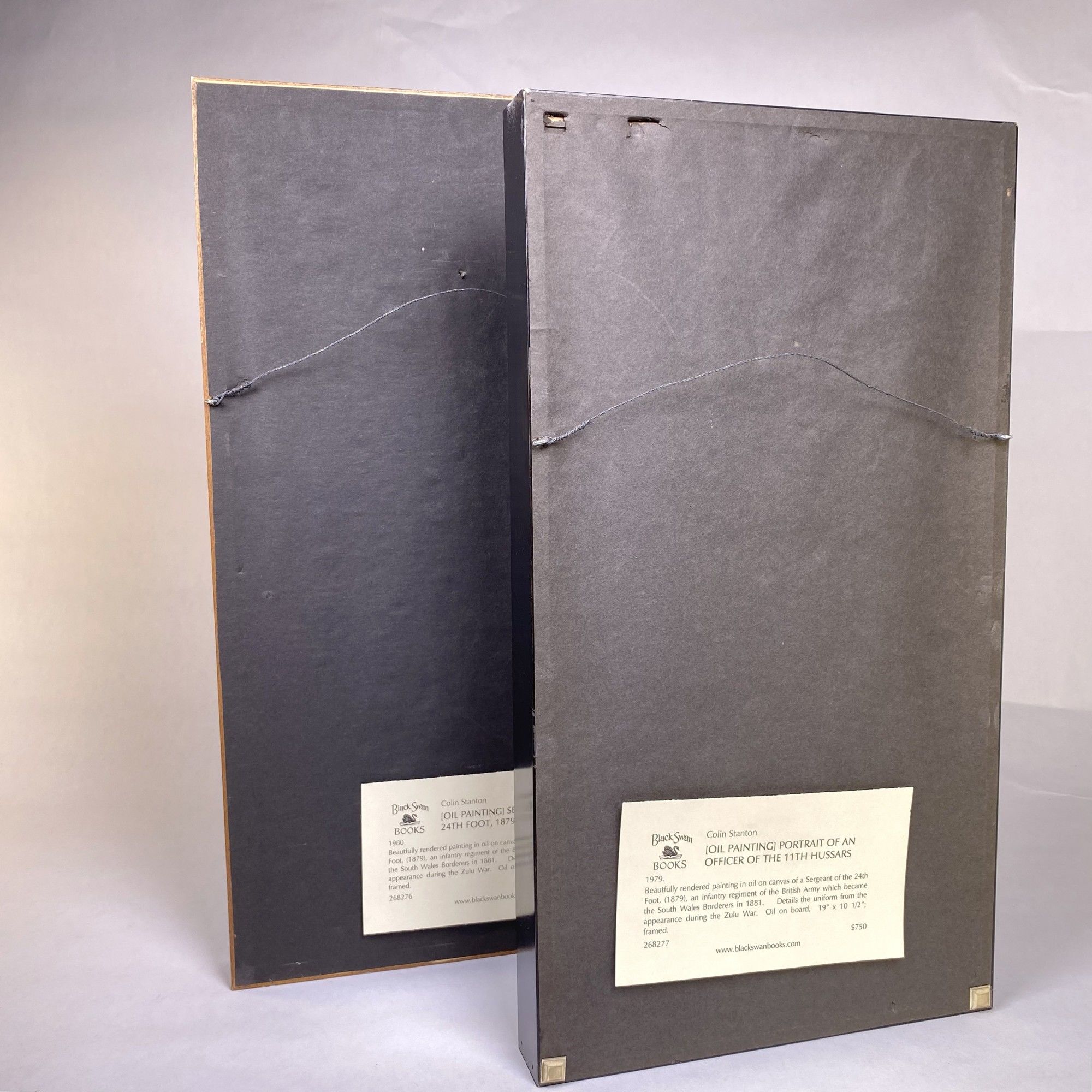 1980. PORTRAIT OF AN OFFICER OF THE 11th HUSSARS. The 11th Light Dragoons became the 11th (Prince Albert's Own) Hussars in 1840, and adopted the uniform with "cherry" colored trousers, reflecting the livery of Prince Albert's house, Saxe-Coburg and Gotha. They charged with the Light Brigade. Oil on board; 18" x 9"; framed.~~SERGEANT OF THE 24th FOOT, 1879. A Sergeant of the 24th Foot, (1879), an infantry regiment of the British Army which became the South Wales Borderers in 1881. Details of the uniform appear to be from the period of the Zulu War. Oil on board. 19" x 10 ½"an infantry regiment of the British Army which became the South Wales Borderers in 1881. Details the uniform from the appearance during the Zulu War. Oil on board, 19" x 10 1/2"; framed.~~The artist Colin Stanton has given careful attention to the details of the uniforms.