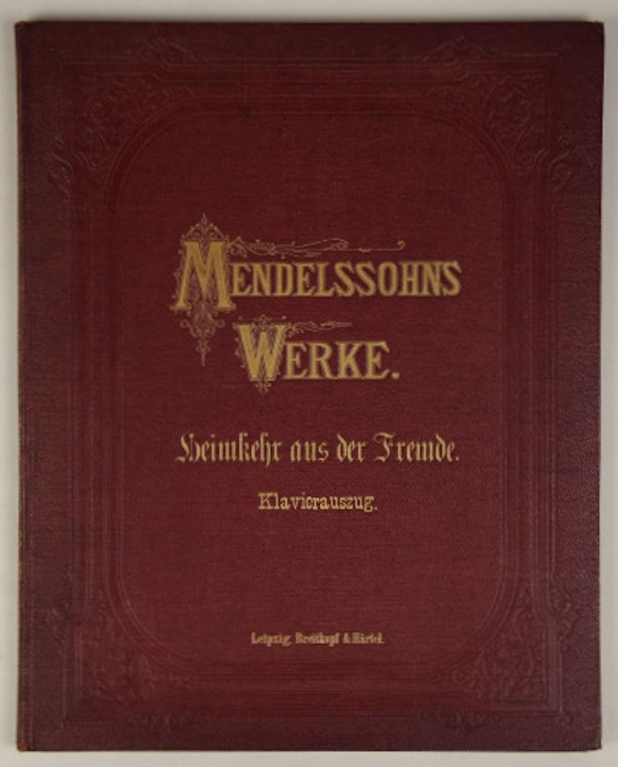 Heimkehr aus dem Fremde. Leipzig: Breitkopf & Härtel, [1885]. [Libretto]. 16mo. Original publisher's light gray printed wrappers. 1f. (recto title, verso blank), 12, [2] pp. (publisher's catalogue of piano-vocal scores and libretti), with additional publisher's catalogue to verso of upper and recto and verso of lower wrapper. Later printing. Wehner MWV L 6, p. 196.