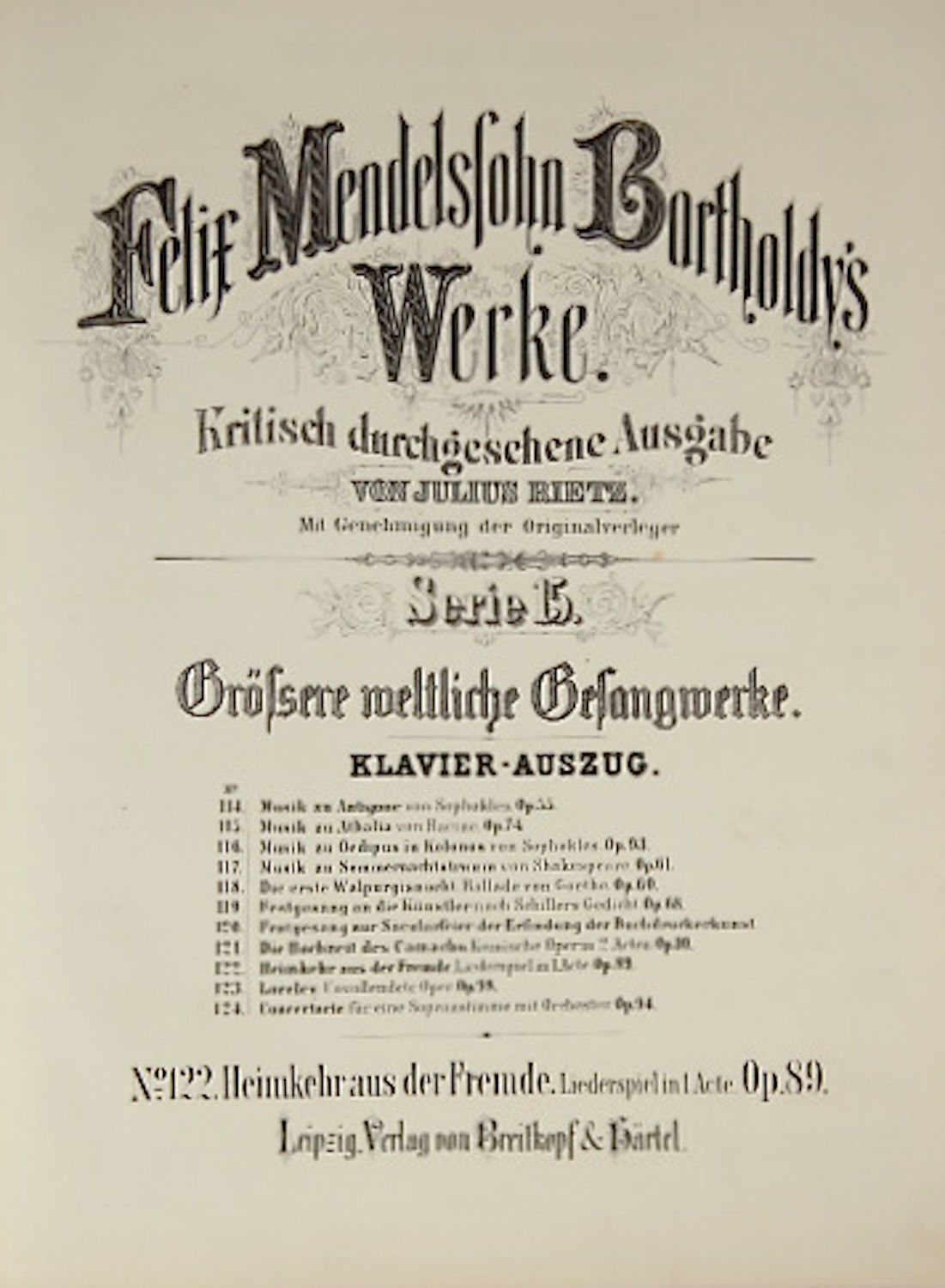 In the series "Felix Mendelssohn Bartholdy's Werke. Kritisch durchgesehene Ausgabe von Julius Reitz. Mit Genehmigung der Originalverleger Serie 15. Grössere weltiche Gesangwerke. Klavier-Auszug." From the Breitkopf edition of Mendelssohn's Complete Works, No. 122.