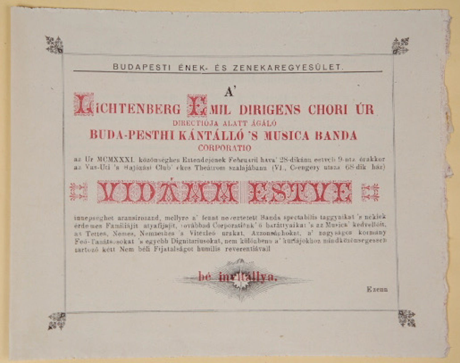 An invitation to the 1931 production of the opera from the Budapest Choral and Orchestra Association (Ének- és Zenekaregyesűlet) partially laid down to front free endpaper signed by István Eisler for the commissioning group and with his name in ink along with a date of December 1930 to upper outer corner and handstamp of Hungarian publisher/musicseller Rózsavölgyi és társa dated December 12, 1930 to lower outer corner of endpaper.