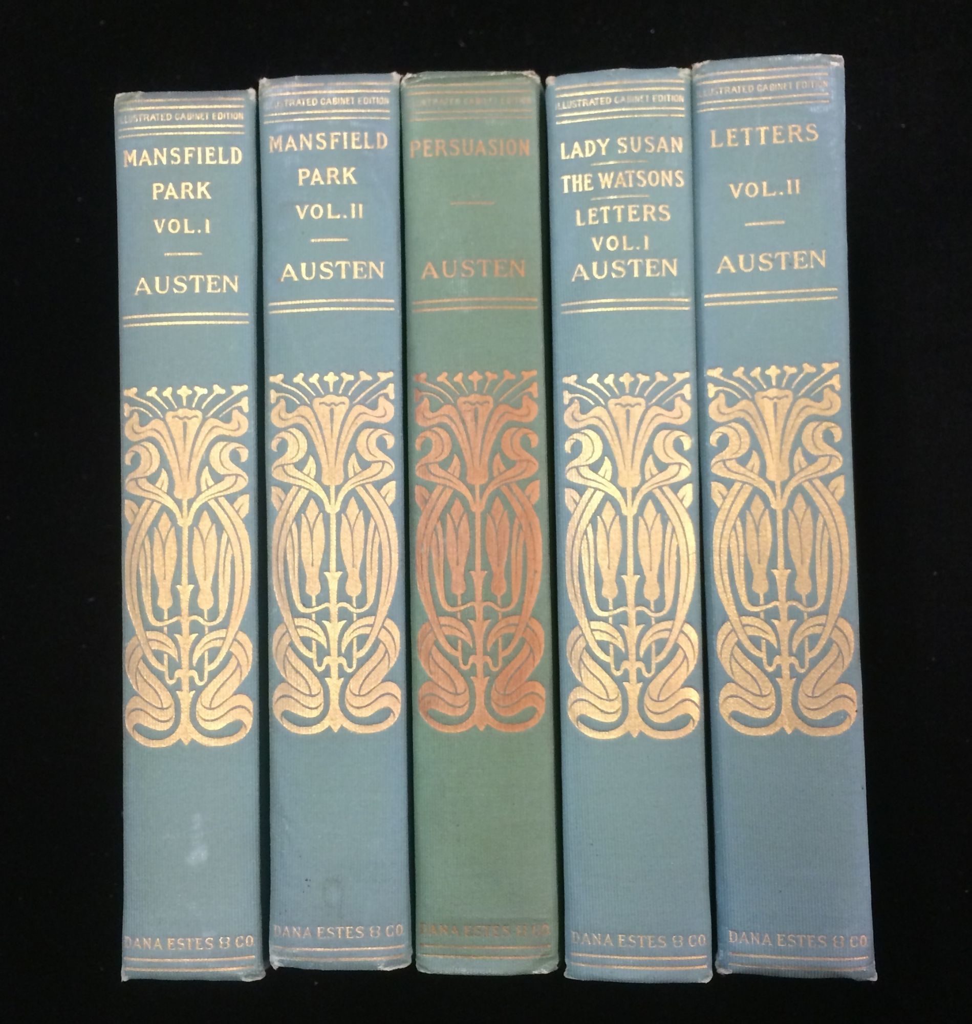 Boston: Dana Estes. 1st Edition Thus. Hardcover. Near Fine. nd, circa 1905. Five volumes only of the Illustrated Cabinet Edition of the works of Jane Austen: MANSFIELD PARK Vol I and II; PERSUASION; LADY SUSAN THE WATSONS LETTERS Vol I and LETTERS Vol II. Light green cloth, Arts and Crafts style floral decoration in gilt to spine. gte, sides untrimmed. Solid copies all around. No names, inscriptions or bookplates.