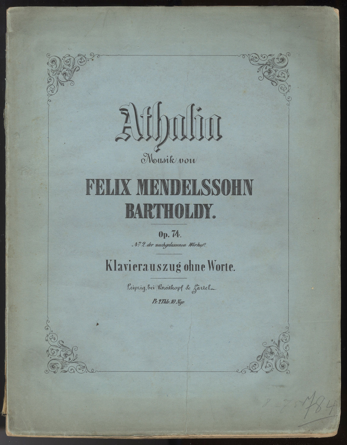 Leipzig: Breitkopf & Härtel [PN 7884], 1852. Folio. Original publisher's light blue wrappers. 1f. (recto title, verso blank), 3-51, [i] (blank) pp. Engraved. Vocal incipits in German and French. Overture with plate number 7899, from the piano-vocal score. With publisher's catalog "Felix Mendelssohn Bartholdy's grössere Gesang-Werke" to verso of lower wrapper.