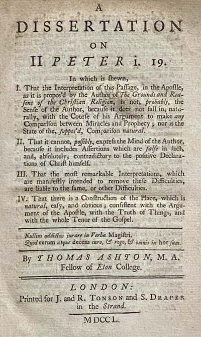 Sammelband of Eight Philosophical and Religious Works Printed in 1750, Discussing Works and Ideas That Influenced Hume, Gibbon, etc.: A Dissertation on II Peter i. 19.; An Impartial Examination of the Bishop of London's Late Appendix to a Dissertation on the Sense of the Ancients before Christ upon the Circumstances and Consequences of the Fall.; Remarks on Dr. Sherlock's, Now Bishop of London's, First Dissertation; in a Letter to His Lordship.; The Plan of a Supplement to Dr. Middleton's Free Enquiry, Exhibited in a Dissertation on the Baptism and Miraculous Gifts of the Holy Ghost.; An Examination of the Consequences of Dr. Middleton's Free Enquiry, &c.; Two Questions, Previous to Dr. Middleton's Free Enquiry, Impartially Considered; An Impartial Examination of the Free Inquiry: The Primitive Fathers Vindicated, and the Necessity of Miracles maintain'd, to the Conclusion of the Third Century. in A Letter to Dr. Middleton; Some Remarks upon Mr. Church's Vindication of Mira
