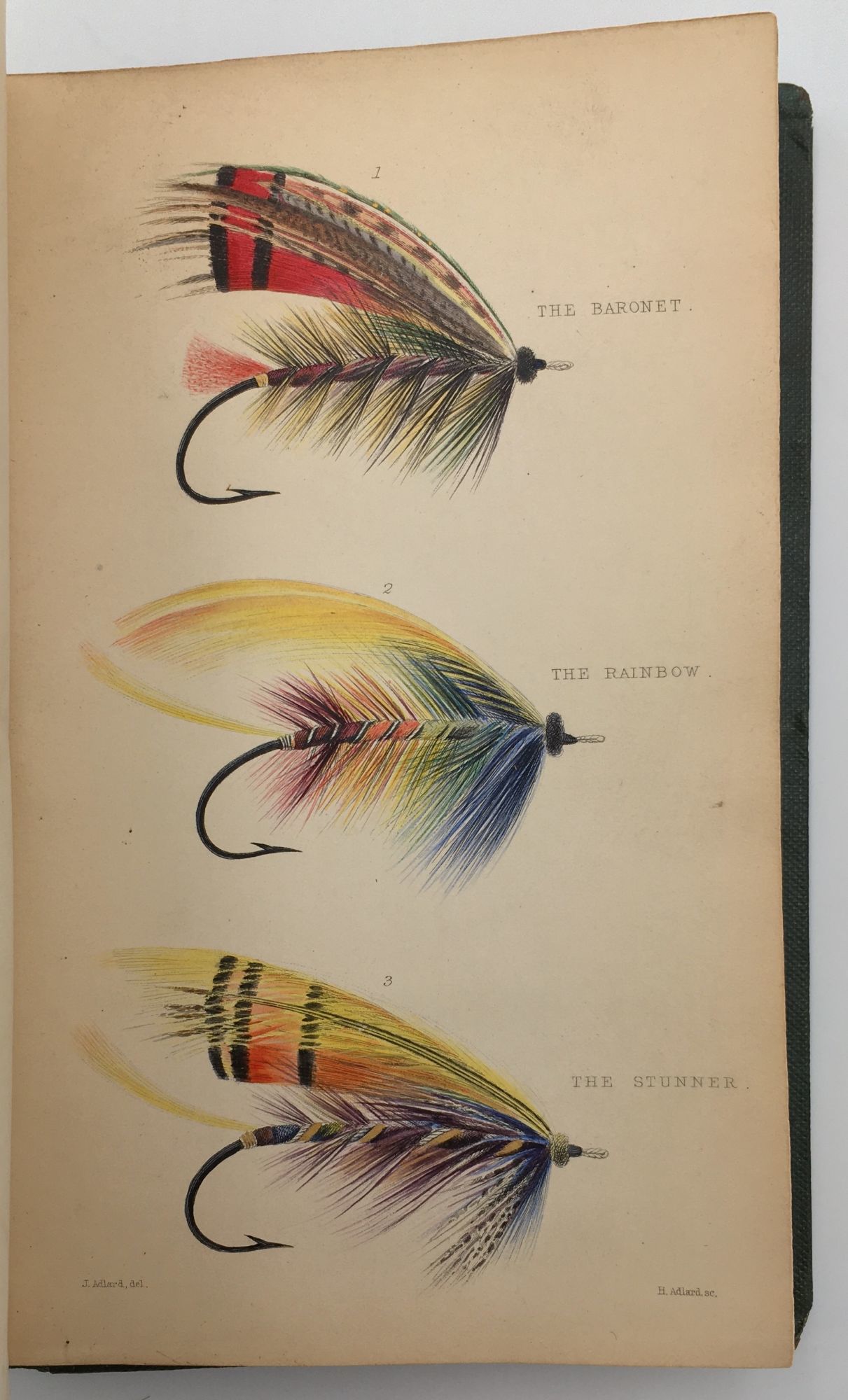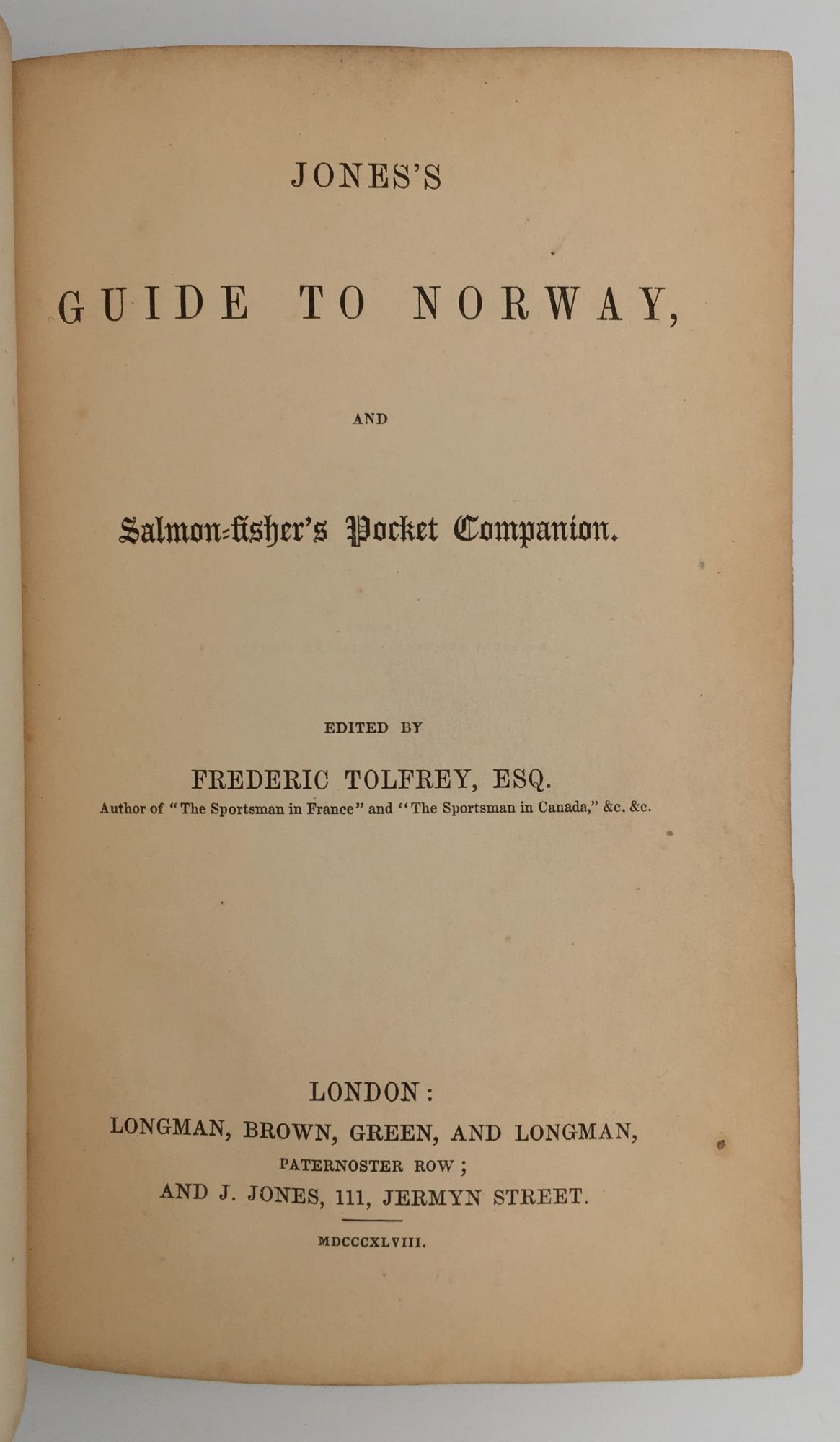 London: Longman, Brown, Green, and Longman, Paternoster Row; and J. Jones, 111 Jermyn Street, 1848. First edition. Additional lithographed title, lithographed frontispiece, and 8 hand-colored engraved plates of flies by J. and H. Adlard. xxii, 239 pp. 1 vols. 16mo. Original green cloth gilt. Tidy ink gift inscription on verso of half title dated 1859. Skilfully rebacked preserving original spine (cloth a bit toned, corners lightly bumped). Very good plus. First edition. Additional lithographed title, lithographed frontispiece, and 8 hand-colored engraved plates of flies by J. and H. Adlard. xxii, 239 pp. 1 vols. 16mo. The very scarce first edition of the first British work on Norwegian angling. Issued at the instigation of J. Jones, a tackle dealer of Jermyn Street, who wrote the introduction. As Charles Woods notes in Bibliotheca Salmo Salar, “It is a cornerstone.”. Westwood & Satchell, p. 210; Bibliotheca Salmo Salar 34