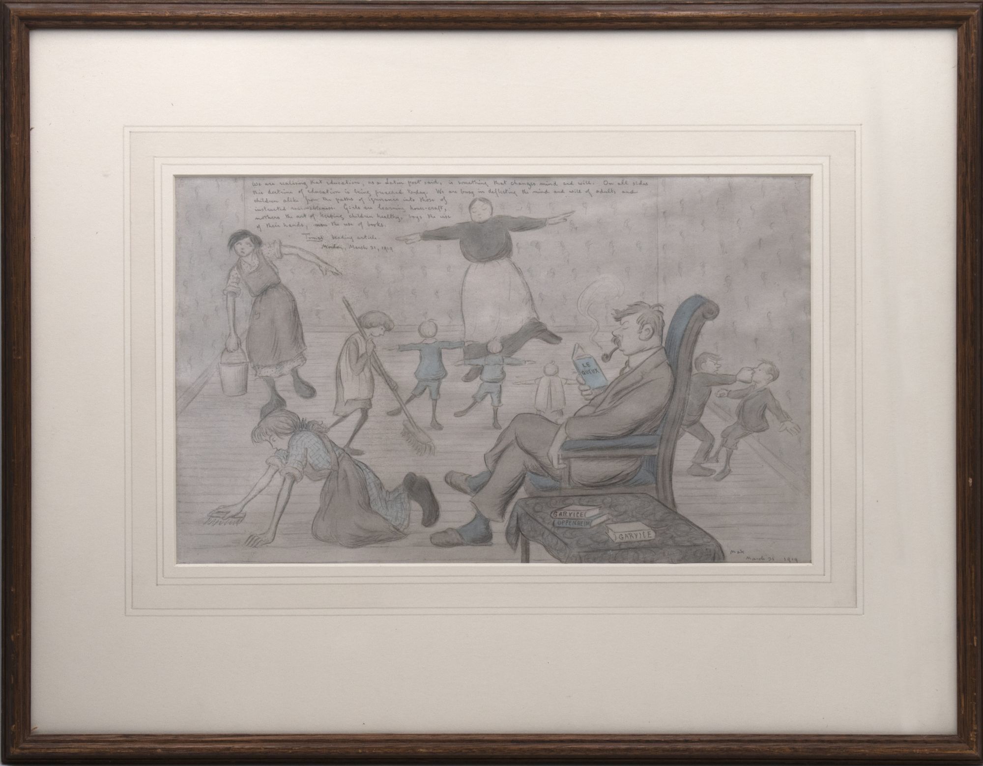 1919. Graphite and coloured washes on paper. Signed Max and dated March 31, 1919 lower right. 7-7/8 x 11-3/4 inches. Matted and framed. Graphite and coloured washes on paper. Signed Max and dated March 31, 1919 lower right. 7-7/8 x 11-3/4 inches. Annotated in Berrbohm's hand in pencil upper left " 'We are realising that education, as a Latin poet said, is something that changes mind and will. On all sides this doctrine of education is being preached today. We are busy deflecting the mind and will of adults and children alike from the paths of ignorance into those of instructed reasonableness. Girls are learning house-craft, mothers the art of keeping children healthy, boys use their hands, men the use of book'. Times leading article, March 31, 1919," Rupert Hart-Davis 1981