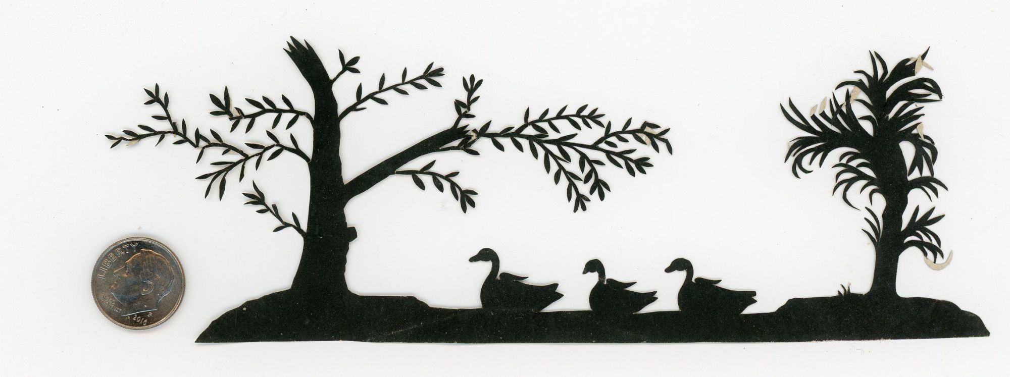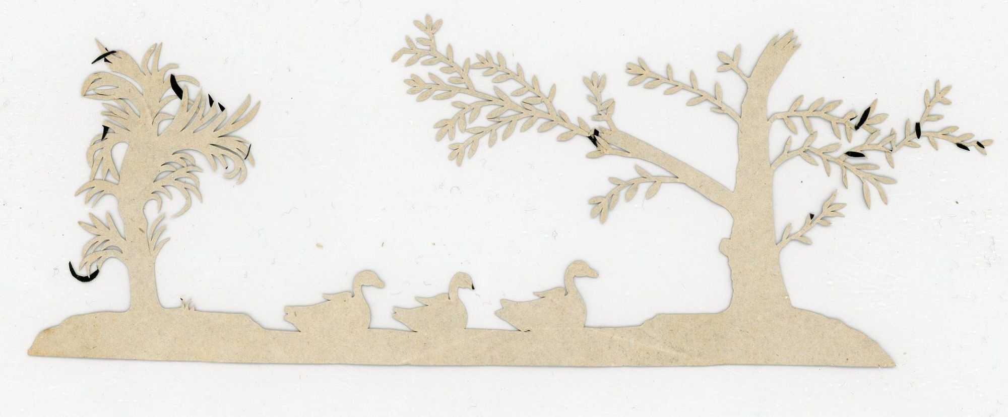 1820. Few light bends on tips.. A 2 1/2" x 6 3/4" cutwork from a single sheet black matte paper depicts a tree, three swans and a shrub. Note the delicate cuts and fine finish work. The paper has a very high rag content allowing it to be somewhat pliable. The reverse is blank. A delightful little miniature piece.