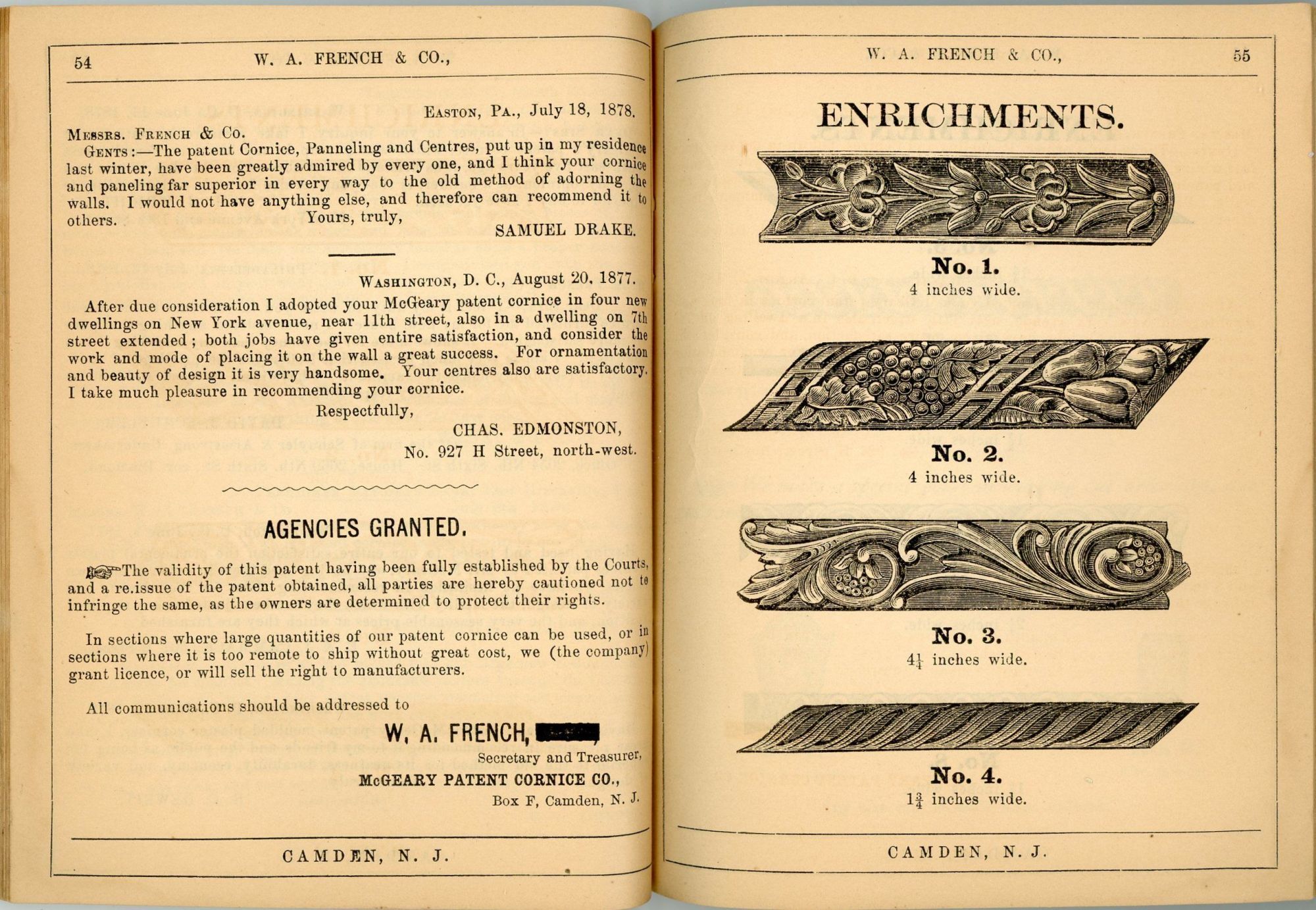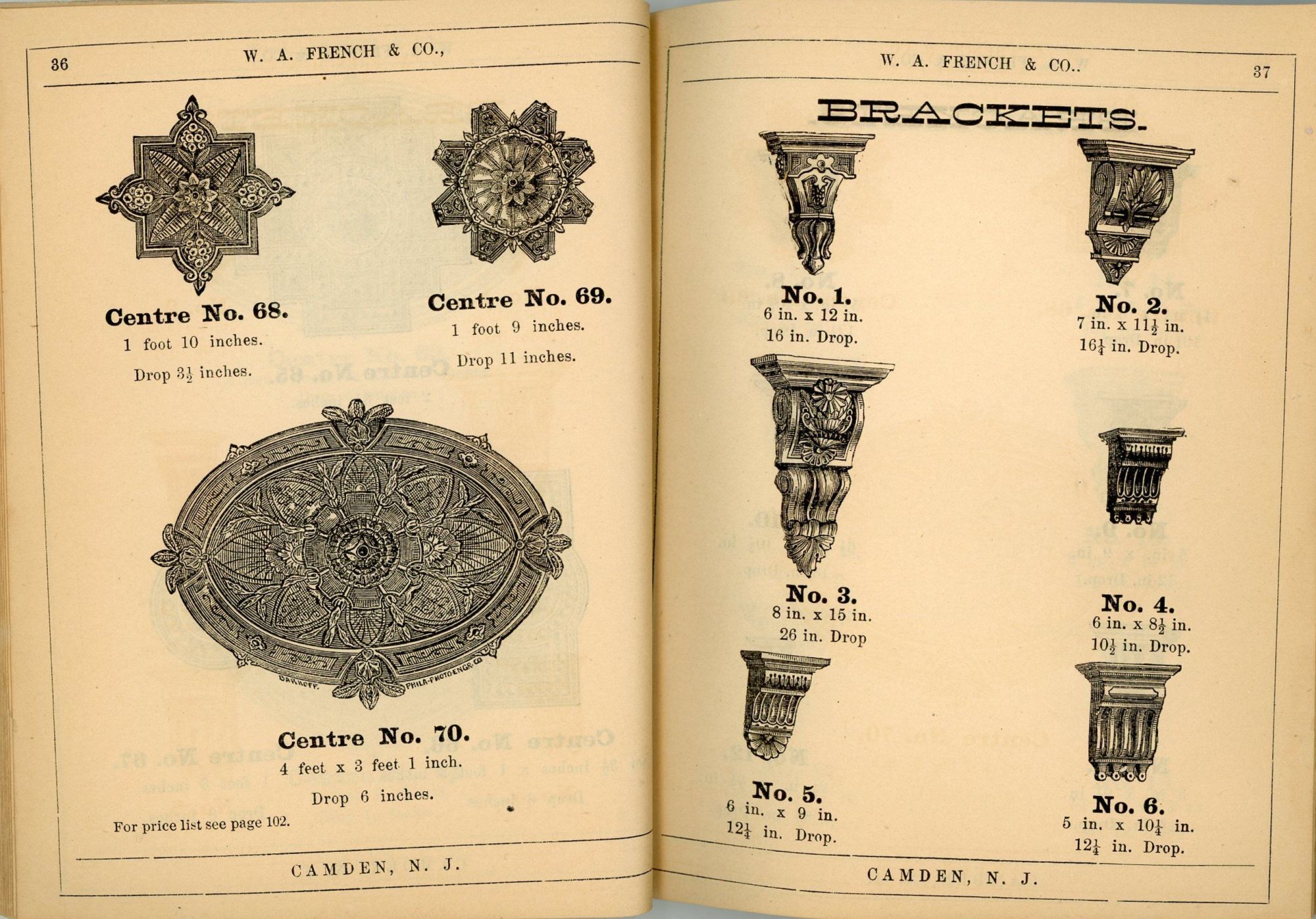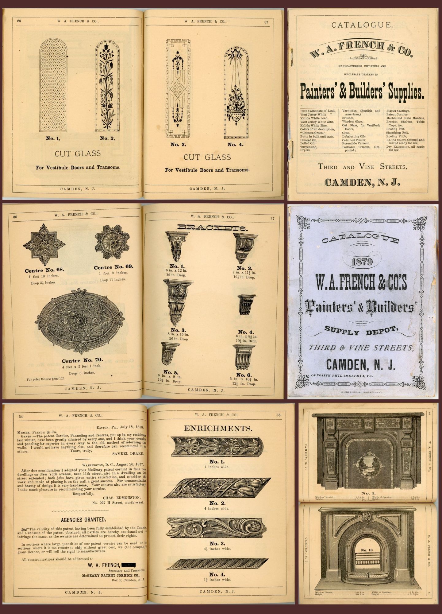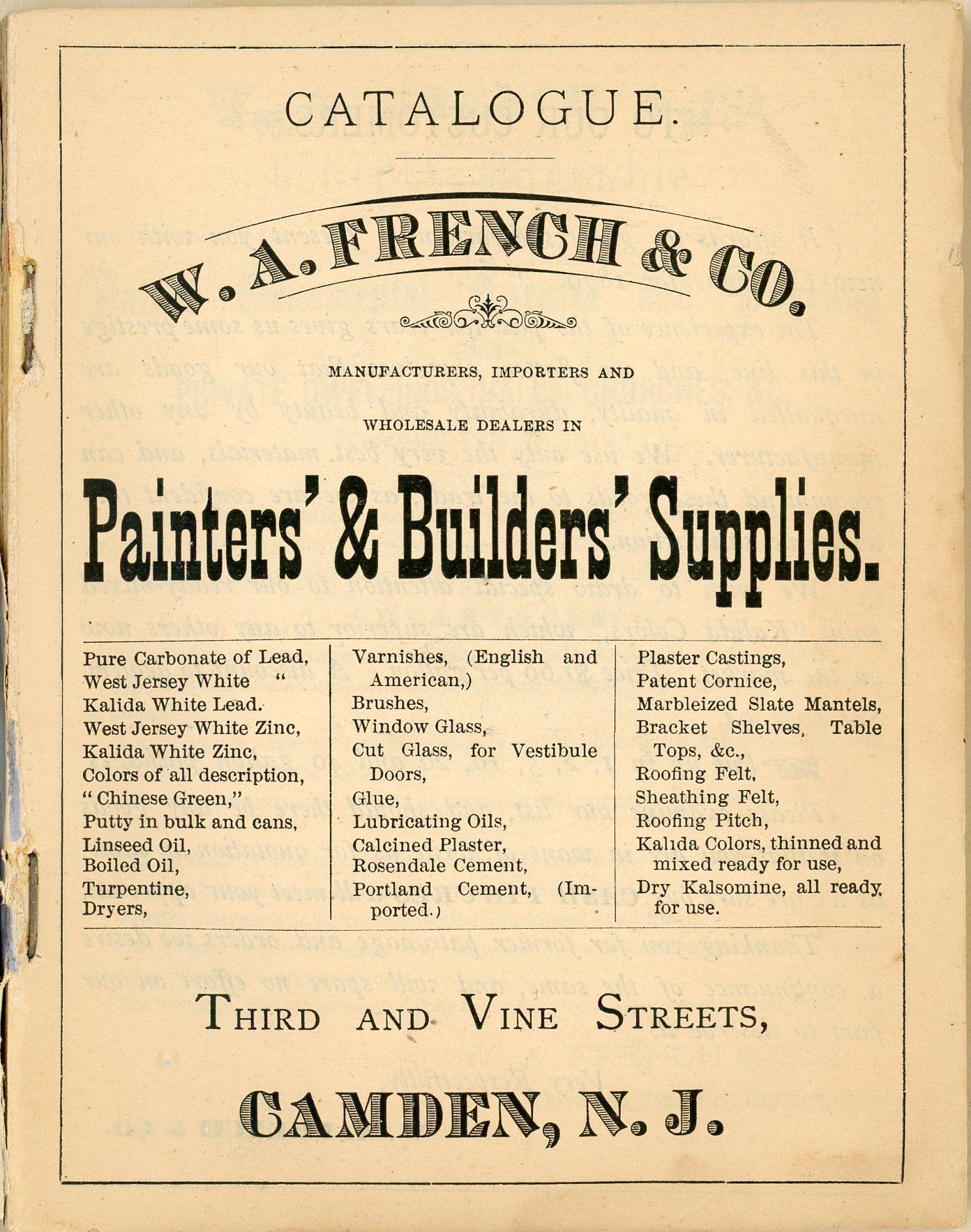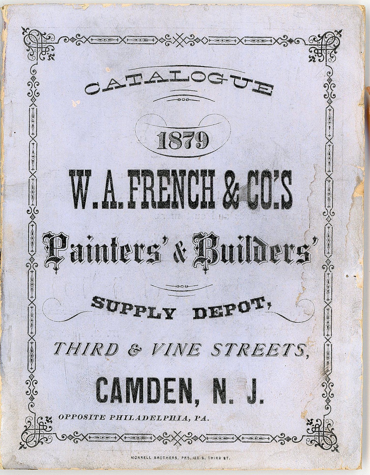Hamden NJ (Opposite Philadelphia PA: Morel Brothers Pros, 1879. Heavy cover wear. Water stain back cover.. 112 pp. polished stock wraps. Black and white illustrated catalogue including Pure Cabonate of Lead, West Jersey White Lead, Kalida White Lead, West Jersey White Zinc, Kalida White Zinc, Colors of all Description, "Chinese Green", Putty in bulk and cans, Linseed Oil, Boiled Oil, Turpentine, Druyers, Varnishes (English and American) Brushes, Window Glass, Cut Glass for Vestibule Doors, Glue, Lubricating Oils, calcimined Plaster, Rosendale Cement, Portland Cement, Plaster Castings, Patent Cornice, Marbleized Slate Mantels, Bracket Shelves - Table and Top &c, Roofing Felt, Sheathing Felt, Roofing Pitch, Kalida Colors,thinned and mixed ready for use and Dry Kalsomine all ready for use. Includes dimensions but no prices. Measures 6" x 4 1/2