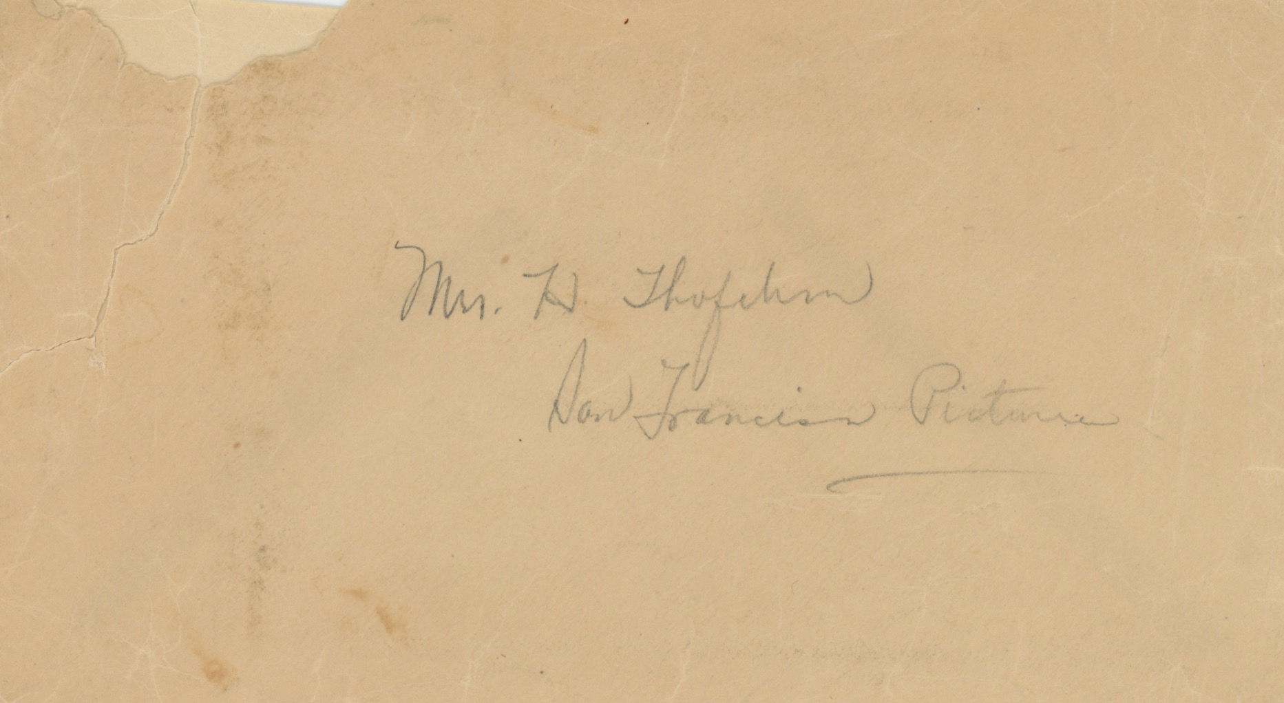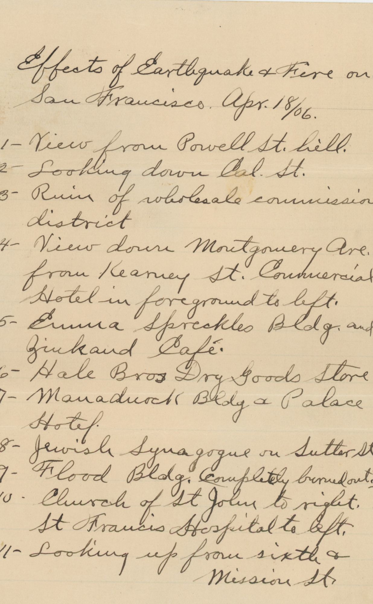 San Francisco, 1906. Thirty-one silver gelatin prints, measuring 4 x 3 inches, with four accompanying sheets measuring 8 x 5 ½ inches identifying the images. Also included is the original envelope to an illegible recipient, or possibly crediting the images. Fading to images else about fine, very good minus overall. Many photographers, amateur and professional alike, took to the streets of San Francisco to document devastation caused by the earthquake and subsequent fire of 1906. Collected here are thirty-one images taken by one such photographer - likely an amateur based on the image quality and perspectives. What is unusual about the collection here is that the photographer took meticulous notes on each image, and the images as found in a (rather illegible) envelope included several sheets explaining the location of each image. The photographer travelled through most of downtown, with varied locations represented. The title is likely misleading, as the fire raged for several days and the pictures were likely taken several days after the 18th of April. The envelope has the name “Mrs H. Thof illegible],” which suggests that perhaps the photographer was a woman, or possibly that these were given to the same as a gift by another photographer. Overall a scarce survival of images, of which we find no other copies.