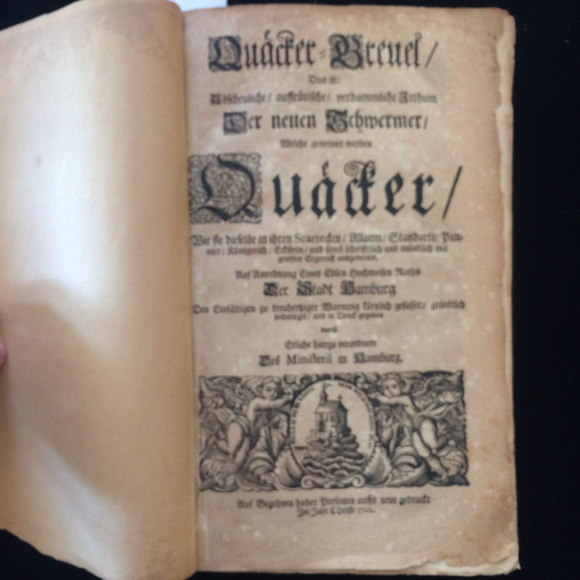 Quacker-Greuel : das ist: abscheuliche, auffru?rische, verdammliche Irthum der neuen Schwermer, welche genennet werden Qua?cker. Wie sie dieselbe in ihren Scartecken, Allarm, Standarte, Pannier, Ko?nigreich, Eckstein, und sonst schrifftlich und mu?ndlich mit grossen Ergerniss ausgebreitet. Auf Anordnung eines edlen hochweisen Raths der Stadt Hamburg. (Quakers)