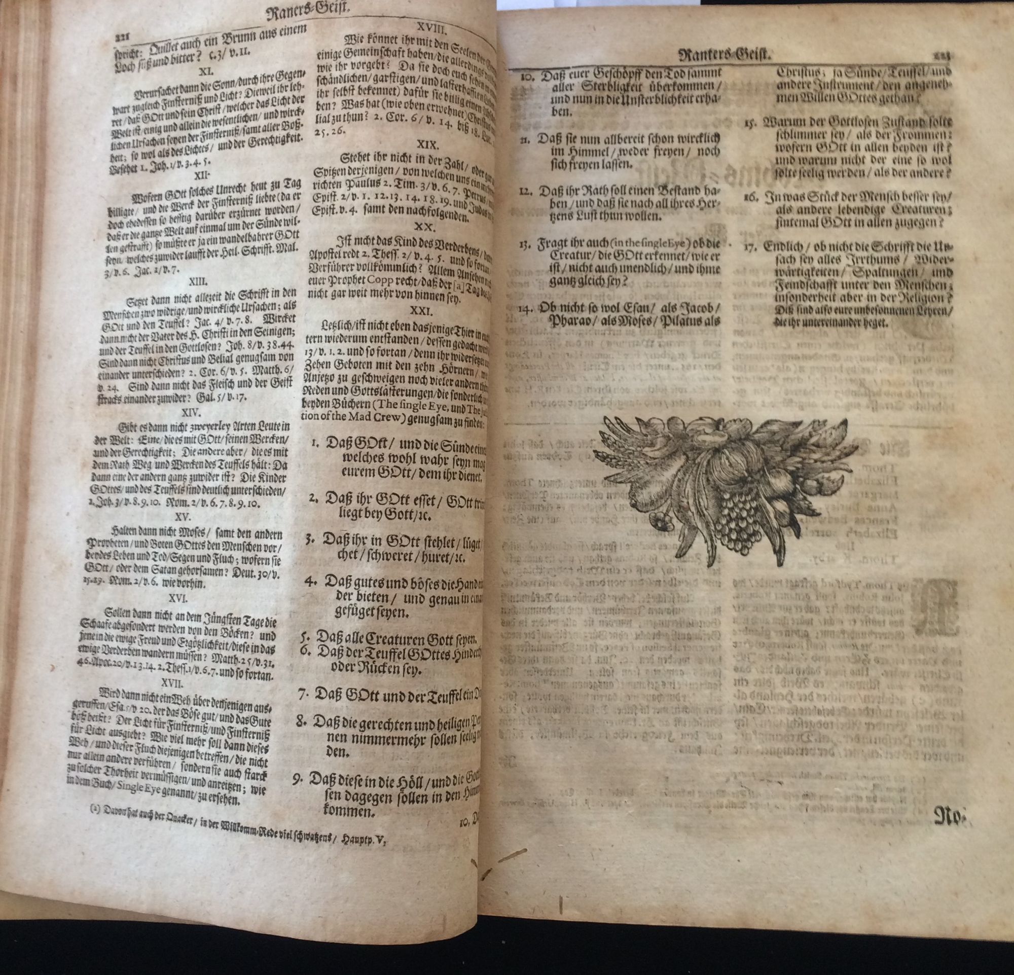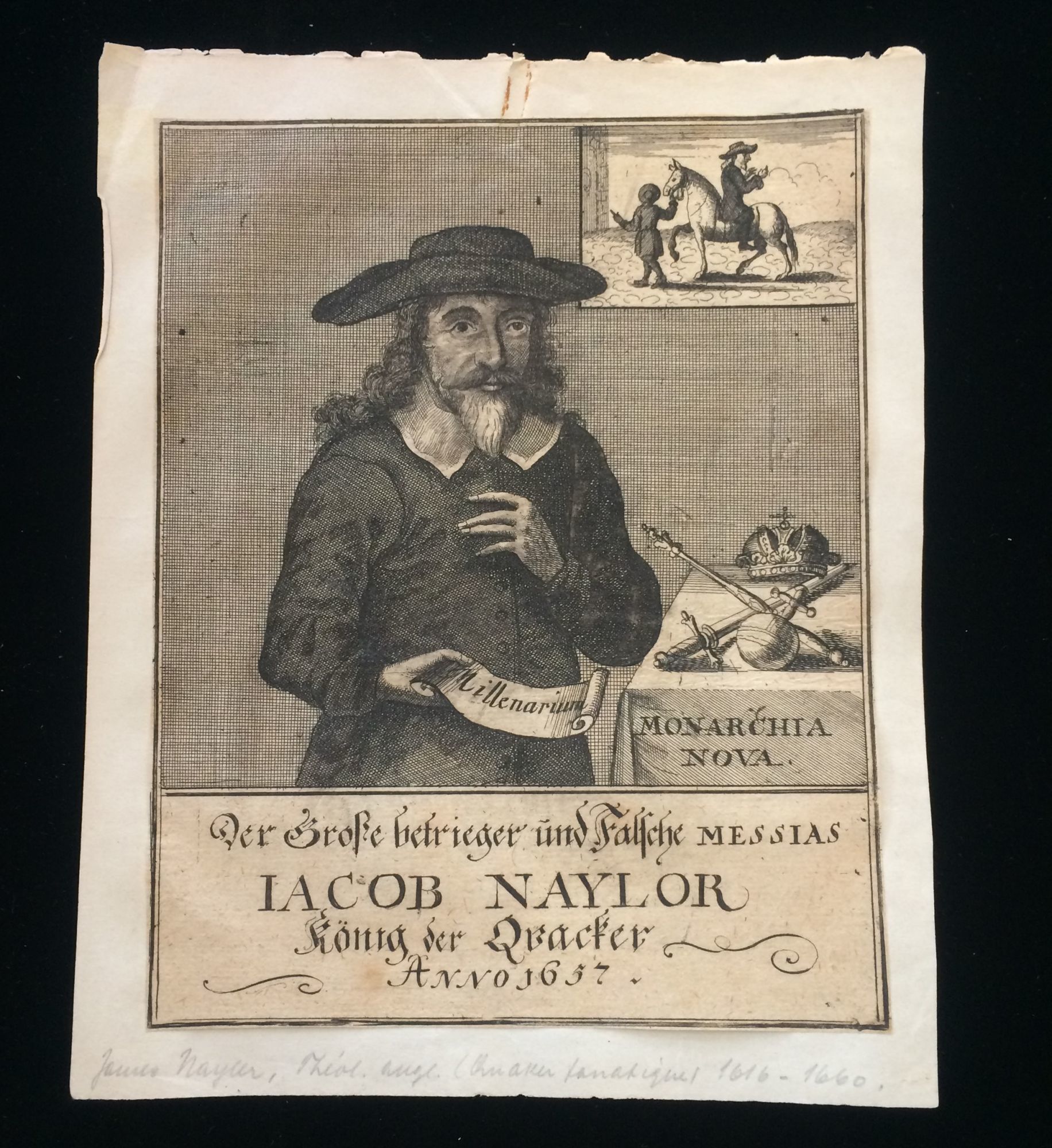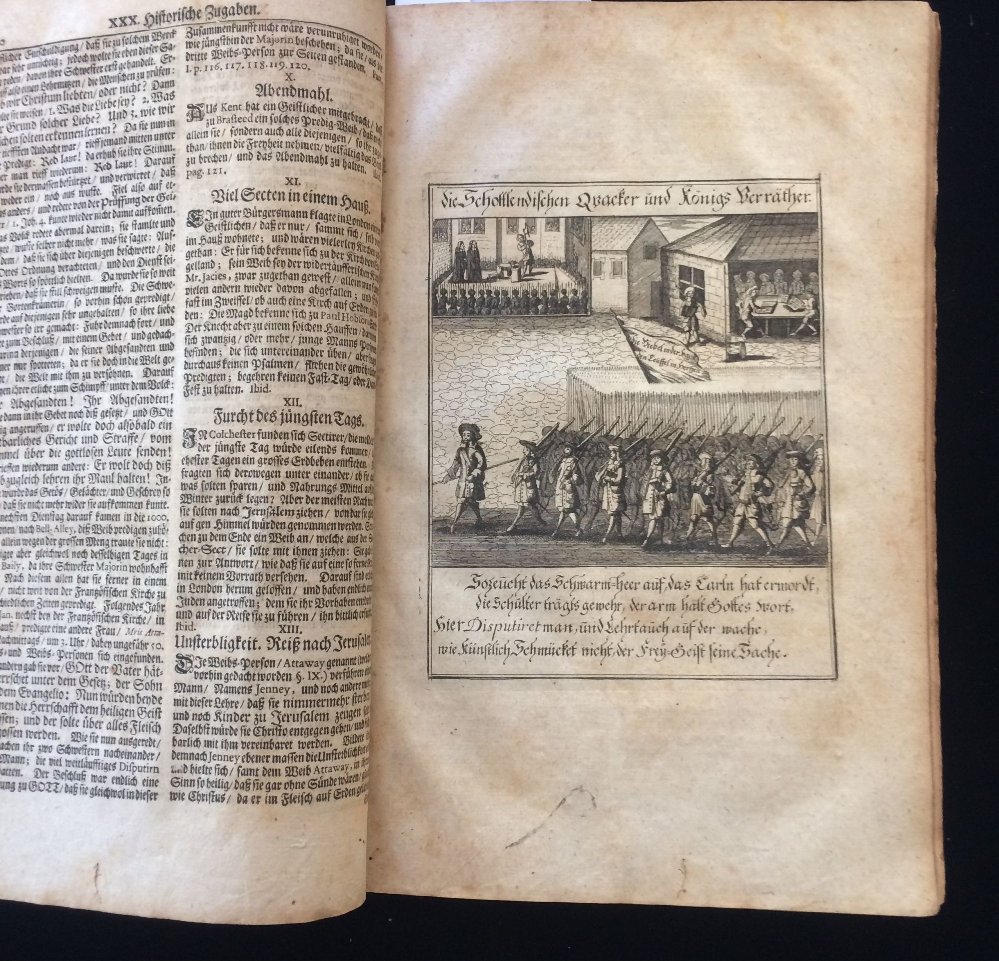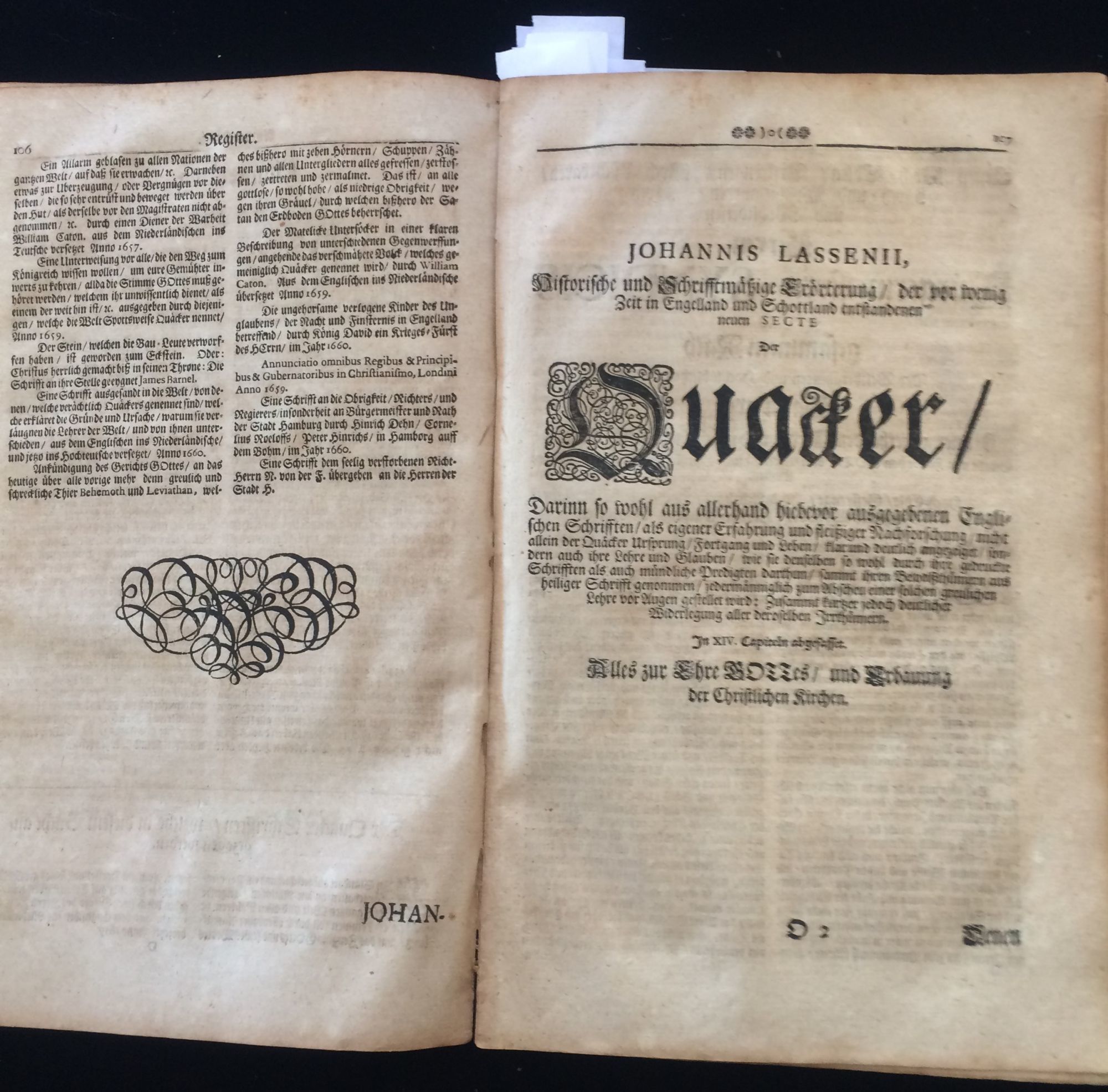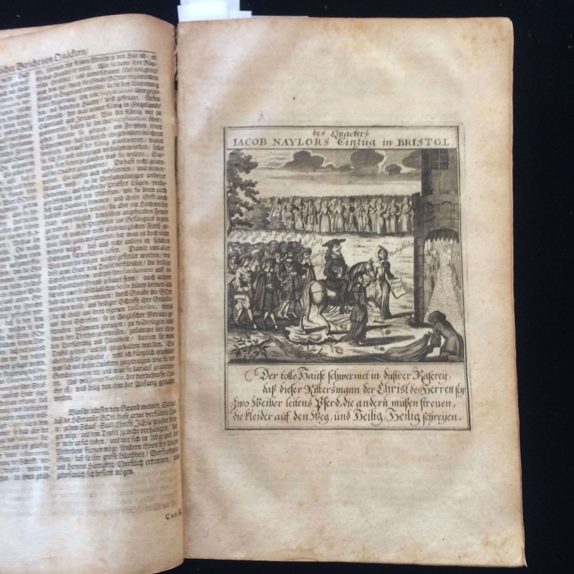 Hamburg: Auf Begehren hoher Personen auffs neue, 1702. 1st Edition. Soft cover. Very Good. Folio, 367, double-columned text, amply illustrated with decorated capitals and devices throughout, and 7 full page engraving copper plates plates (at 112, 118, 168, 192, 230, 244, and 276. There is also a loose plate, uniform in engraved format, at page 227. This rare edition reprints anti-Quaker treatises, emanating largely from Lutheran Christian theologians, that appeared in 1660 and assembled here for the first time. WorldCat lists 7 versions of this edition, 3 specifically as printed here. Most of the copper plates depict the activities of early Quaker preacher and missionary James Naylor ("mistakenly" identified as Jacob). Most notable is the one of him entering Bristol, England on donkey as the Savior Christ. The anti-Quakers exploited the outrage that ensued to label beliefs "blasphemous" and all of Quakerism "false doctrine" "cunningly endeavored" and "revolting, hideous and damnable teaching" Groupings tied, but an unbound copy, with an apparently contemporary paper sheet affixed. Leaves toned as expected, overall remarkably well-preserved. We could find no auction records in the US and no recent European ones.
