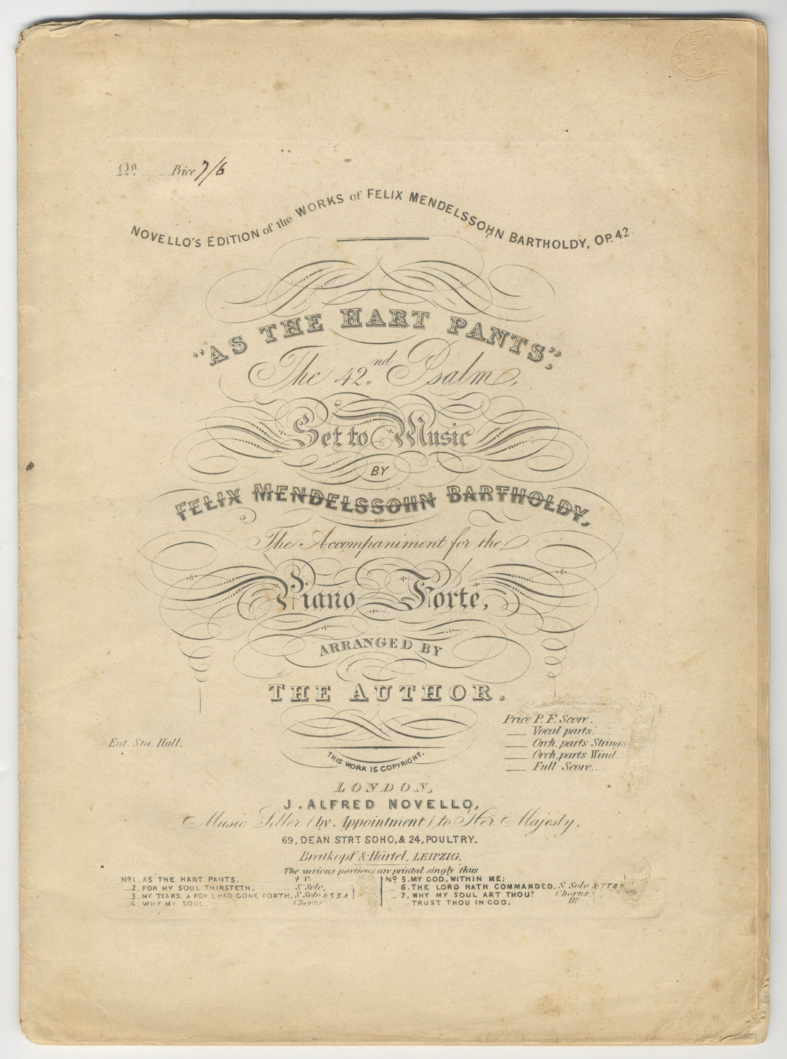 London: J. Alfred Novello ... 69, Dean Strt. Soho, & 24, Poultry [PN 550], 1849. Folio. Unbound. 1f. (recto title, verso blank), 41, [i] (publisher's catalogue) pp. Engraved throughout. With "Novello's Edition of the Works of Felix Mendelssohn Bartholdy, Op. 42" printed to head of title.