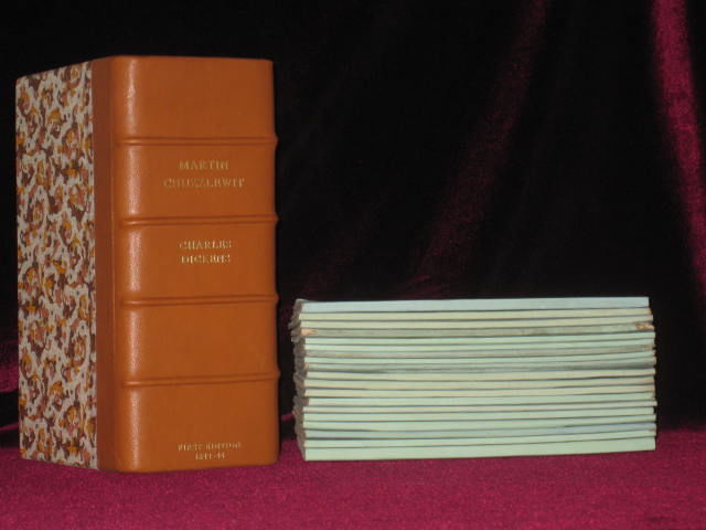 London (January 1843-July 1844): Chapman & Hall. First Edition. Original Wraps. Publisher's Presentation Copy, with "With The Publisher's Compliments" stamped onto front wrapper of part IV, in the same style as we have seen on other publisher presentation copies. ALL wrappers are correct. ALL ads and slips are present, as called for by Hatton & Cleaver, (except for the rare "Foreign Travel" slip in part VII, which is known in only 6 copies). Annotated by Thomas Hatton in part VIII on the verso of plate #15, thus: "M - C / Part 8 / A" and in part XVI on the verso of plate #32 thus: "Part 16 / A " as was his custom on certain ads and plates. First issue of the text, conforming in all points to Smith pp. 65 - 67. Errata is 13 lines and the vignette title is in the first state with the British Pounds symbol following "100." The text in parts V and part VIII is UNOPENED, therefore unread. Illustrated by Hablot K. Browne. The plates in part XXVIII are lightly age-toned, all others are very good to fine; tissue guards are in place. Octavo, [i-vii]viii[ix]x-xii[xiii]xiv[xv-xvi], [1]2-624. An outstanding set in every respect, internally very clean and bright; minor soiling to a few wrappers; neat subscriber's name on front wrap of part XI; spines expertly renewed on most parts. Armorial bookplate on slipcase. Housed in a custom tan quarter-leather slipcase, with chemise. Provenance: The Hatton & Cleaver collection, the Heritage Bookshop, Charles Parkhurst Rare Books, Inc. Hatton & Cleaver, pp. 185-212.