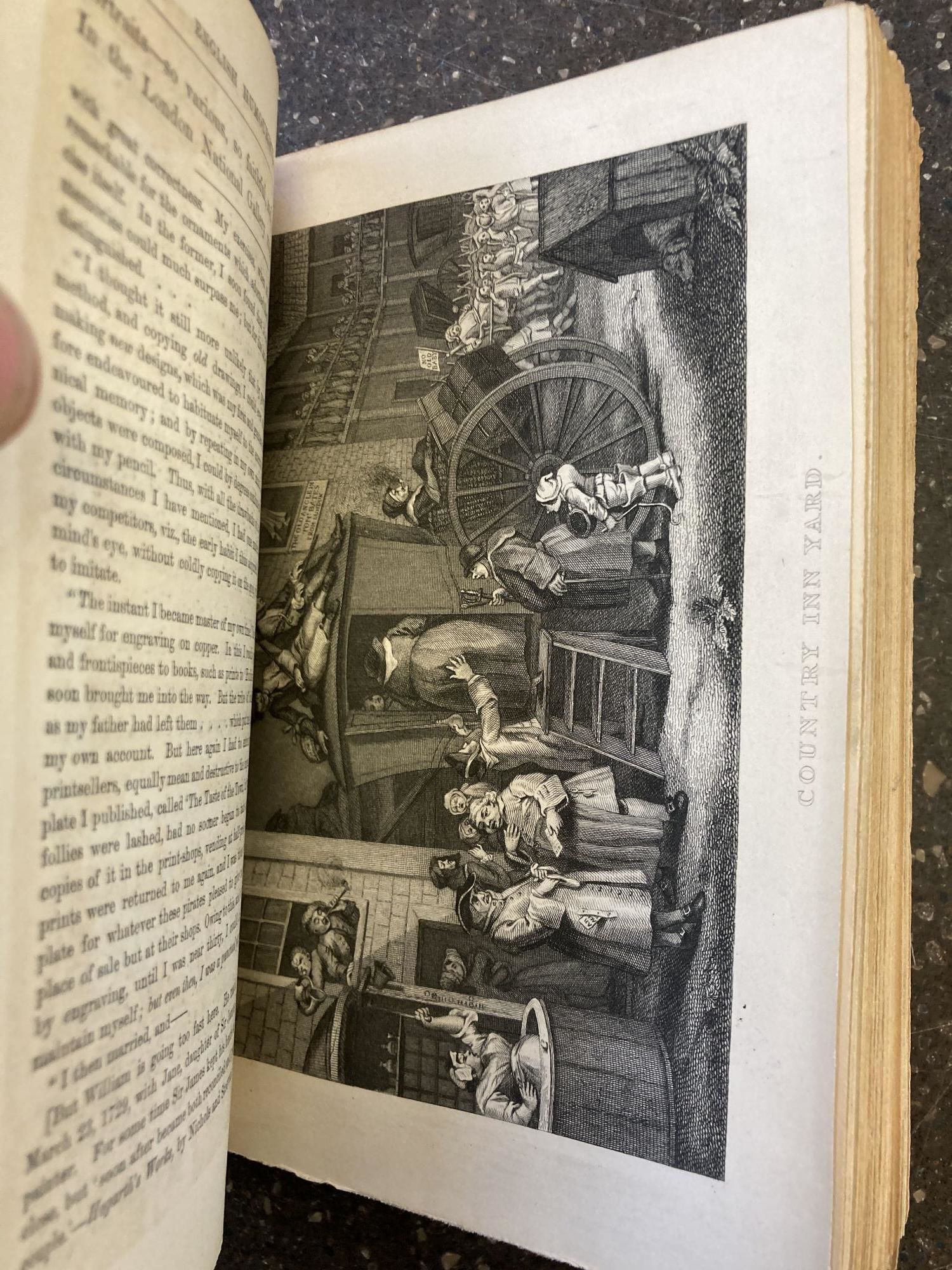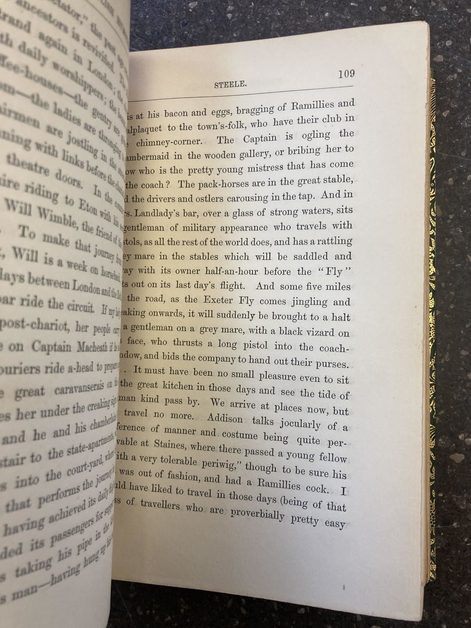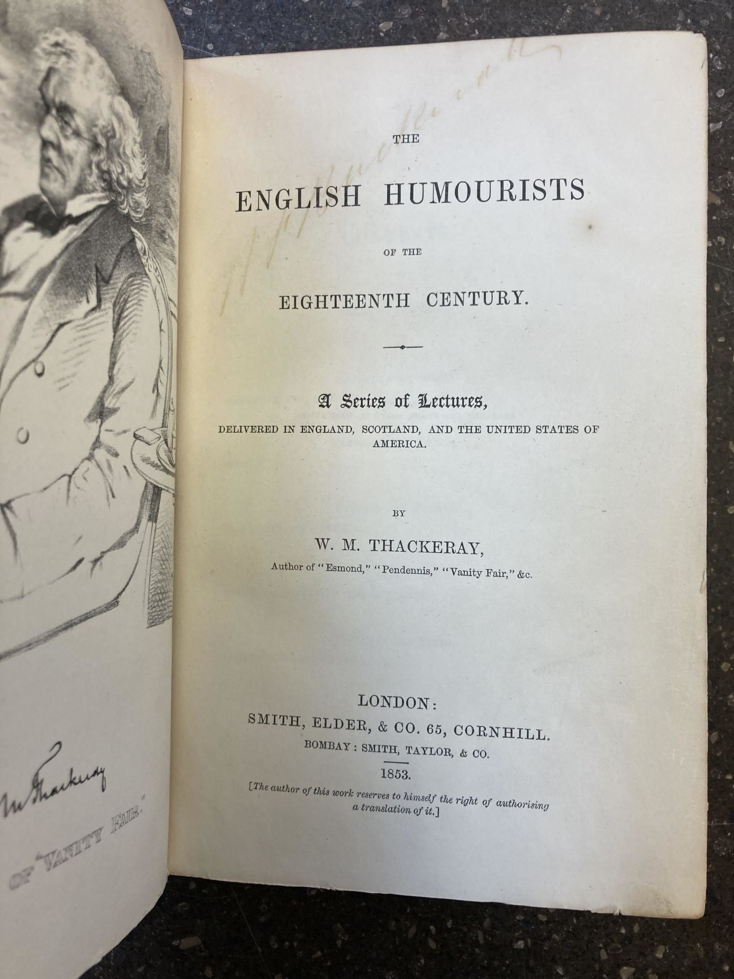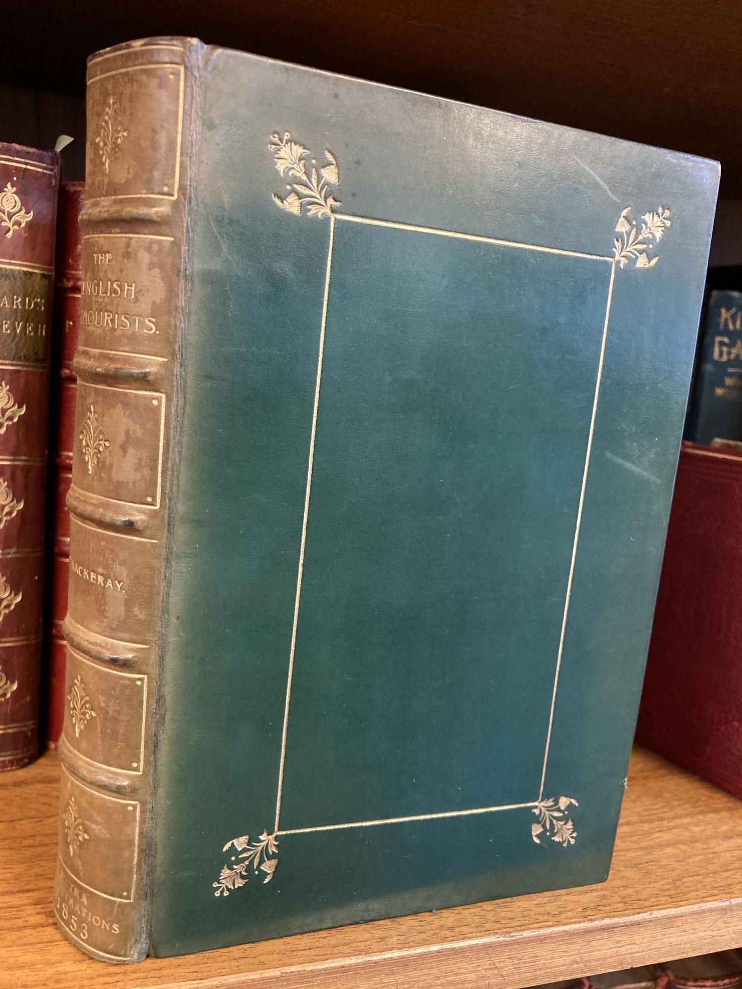 London: Smith, Elder, & Co, 1853. First Edition, Extra-Illustrated. Hardcover. Octavo, 322 pages, [6] ads, [16] ads; VG; 'Bound by Ramage, London', with their gilt stamp, in full dark green polished calf, gilt tooling to boards, paneled spine with gilt tooling and titling, some sun-fading; mild wear and rubbing; top edge gilt; patterned endpapers, bookplate to front pastedown; with errata leaf; Extra-Illustrated with 29 plates bound in from various sources; shelved case 3. The English Humourists of the Eighteenth Century collects a series of engaging lectures by W. M. Thackeray on Swift, Pope, Fielding, Congreve, Addison, Steele, Prior, Gay, Hogarth, Smollett, Sterne, and Goldsmith. 1339526. Shelved Dupont Bookstore.