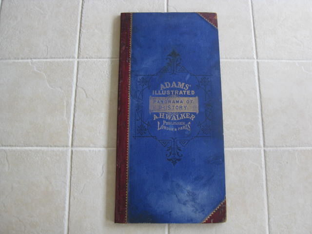 London & Paris: A. H. Walker, 1878. Hard Cover. Very Good. Large folio (27 1/4" x 13"), "Third edition and Twelfth-Thousand carefully and critically revised and brought down to 1878." Twenty-one color lithographs (each 27" x 13"), conjoined to make a folding panorama of approximately 22 feet long, when unfolded; simply spectacular. One can behold all of mankind's history, when unfolded. Bound in publisher's 3/4 leather over blue cloth, decorated in gilt. {Together with] A Key or Explanation of Adams' Panorama of History, A. H. Walker Publisher (1879); octavo, 48 pages, publisher's blue cloth stamped in gilt and black (lacking the title page), containing a full and complete outline of all nations, embraced in Biblical, ancient, midieval and modern history. Internally clean and bright; spine of portfolio renewed, tips worn, cloth a little faded. Very good to fine.