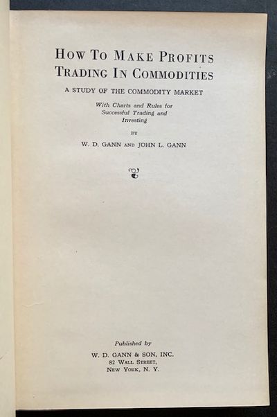 New York: W.D. Gann & Son, 1941. Cloth. Very Good. A solid, well-preserved copy of the uncommon 1941 1st edition. Tight and VG to VG+ in its purple cloth, with still somewhat-bright gilt-titling along the spine. Very mild spotting to the panels, very light soiling at the endsheets and pastedowns. Clean as could be to the text and otherwise internally, with no writng or markings of any kind. Octavo, black-and-white photos of the author and his son (the dedicatee) at the front, copious charts at the rear. An important early title in investment and trading literature, scarce in its original 1941 edition.