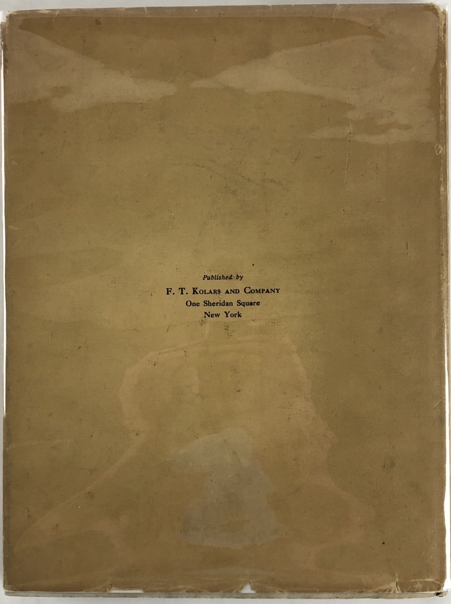 New York: F.T. Kolars and Company, 1920. Hardcover. VG; water stains to front cover, inner cover and several pages; wear to cover with partial tear to front cover dust jacket (upper right corner) and small partial tears at bottom edge (back cover). 1339682. Special Collections.