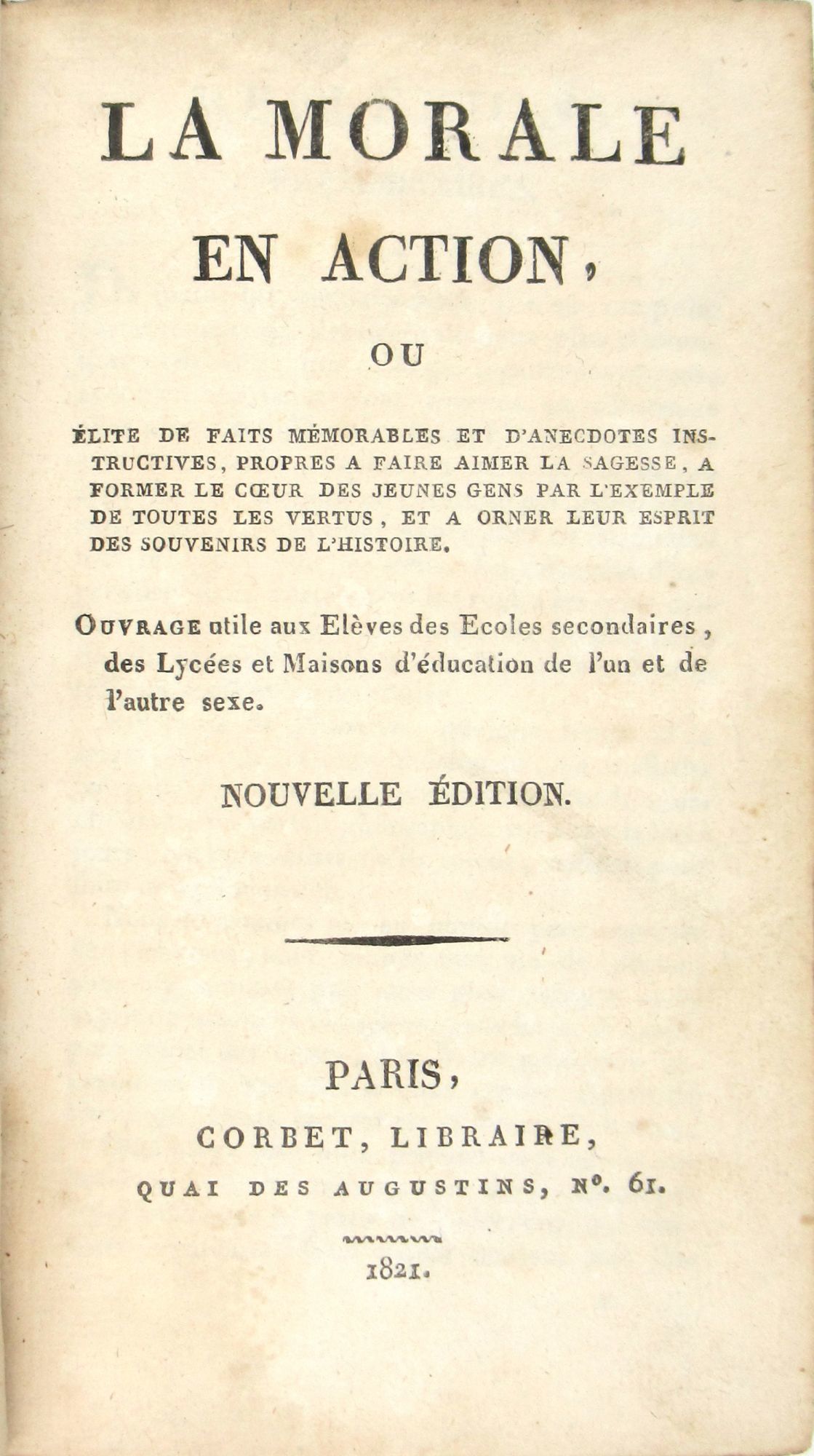 La Morale en Action, ou Élite de faits mémorables et d'anecdotes instructives, propres a faire aimer la sagesse, a former le cœur des jeunes gens par l'exemple de toutes les vertus, et a orner leur esprit des souvenirs de l'histoire. Ouvrage utile aux élèves des écoles secondaires, des lycées et maison d'éducation de l'un et e l'autre sexe
