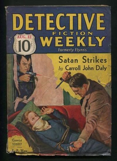 New York: The Red Star News Company. Good. 1933. (Vol. LXXVIII, No. 3). Magazine. [pages tanned but not brittle, slightly heavier than usual edgewear to yapped covers, rear cover wrinkled/soiled, small tear at right edge of front cover]. (pen and ink illustrations) Novelette: "Satan Strikes," a Satan Hall story (John Carroll Daly). Short stories: "A Dead Man in the Cast" (Edward Parrish Ware); "Red Rebound" (Frederick C. Davis); "Head Hunt" (Charles Alexander); "Murder Terrace" (Robert Arthur). Serial: "The Ship of Death," Part 2 of 5 (Michael Keyes). True stories: "The 'Pipe' Murders" (Bert Mohrman); "Illustrated Crimes: The Owl Car Murders" (Paul Berdanier); "I Am a Check Artist" (Convict 12627); "Salamander Man" (Dugal O'Liam). .