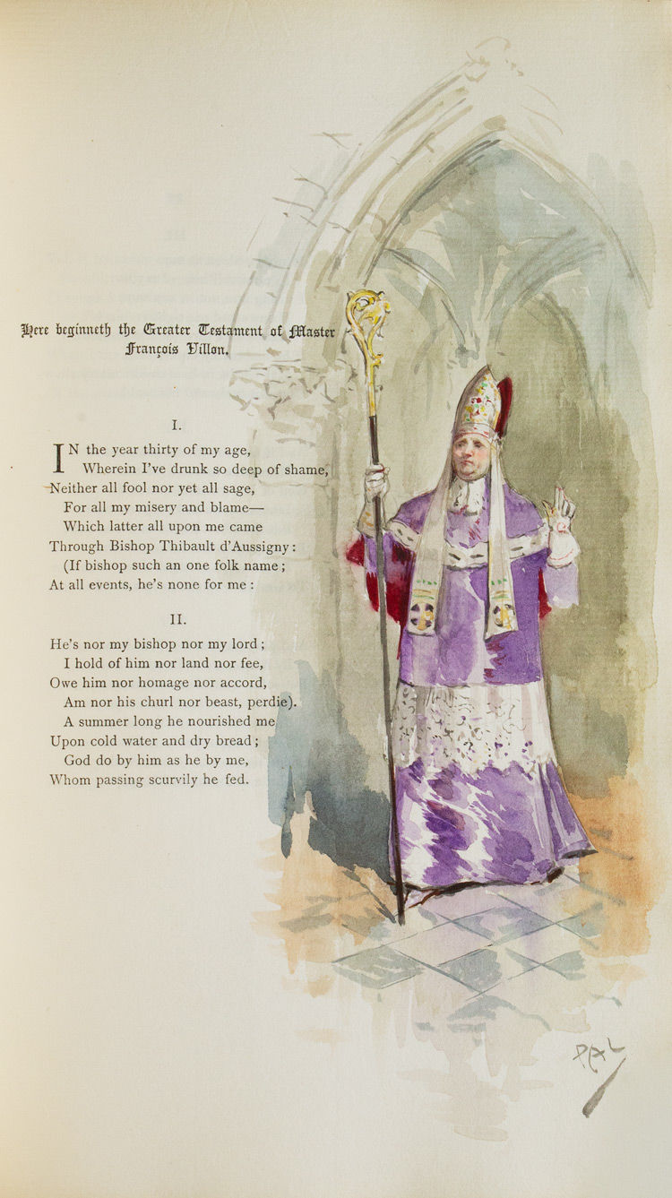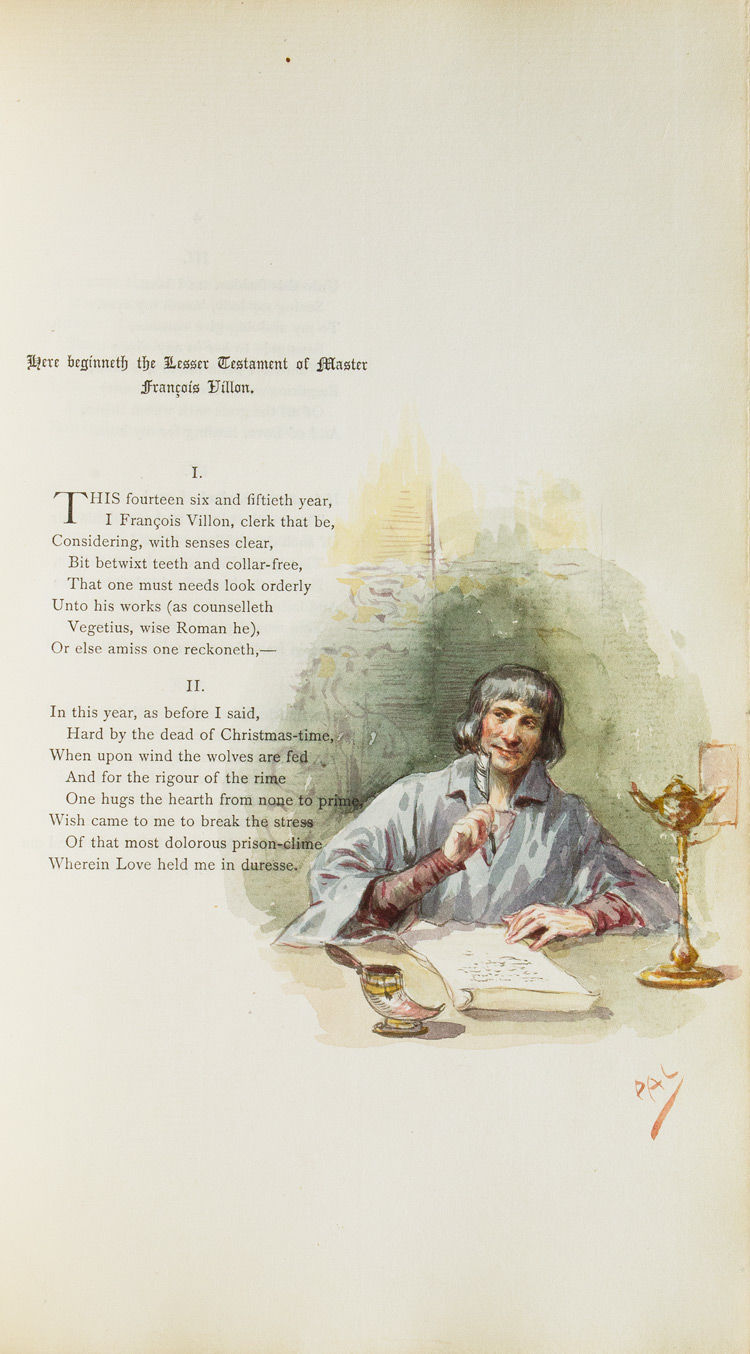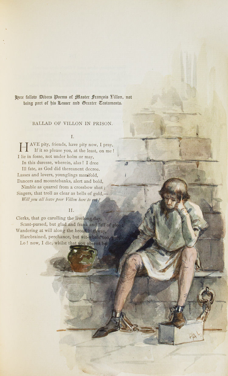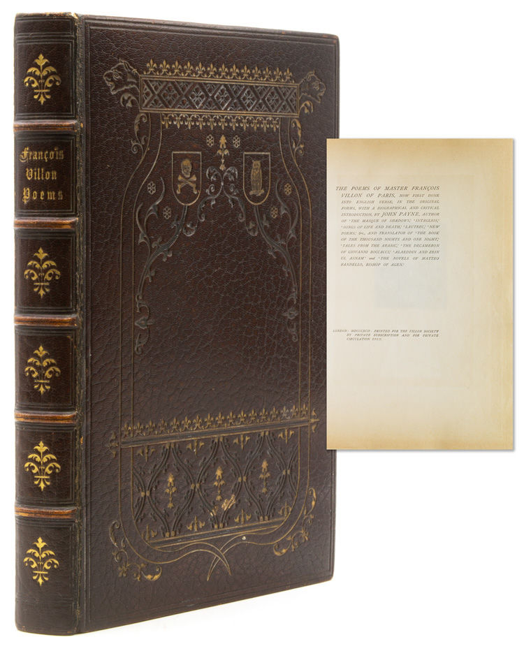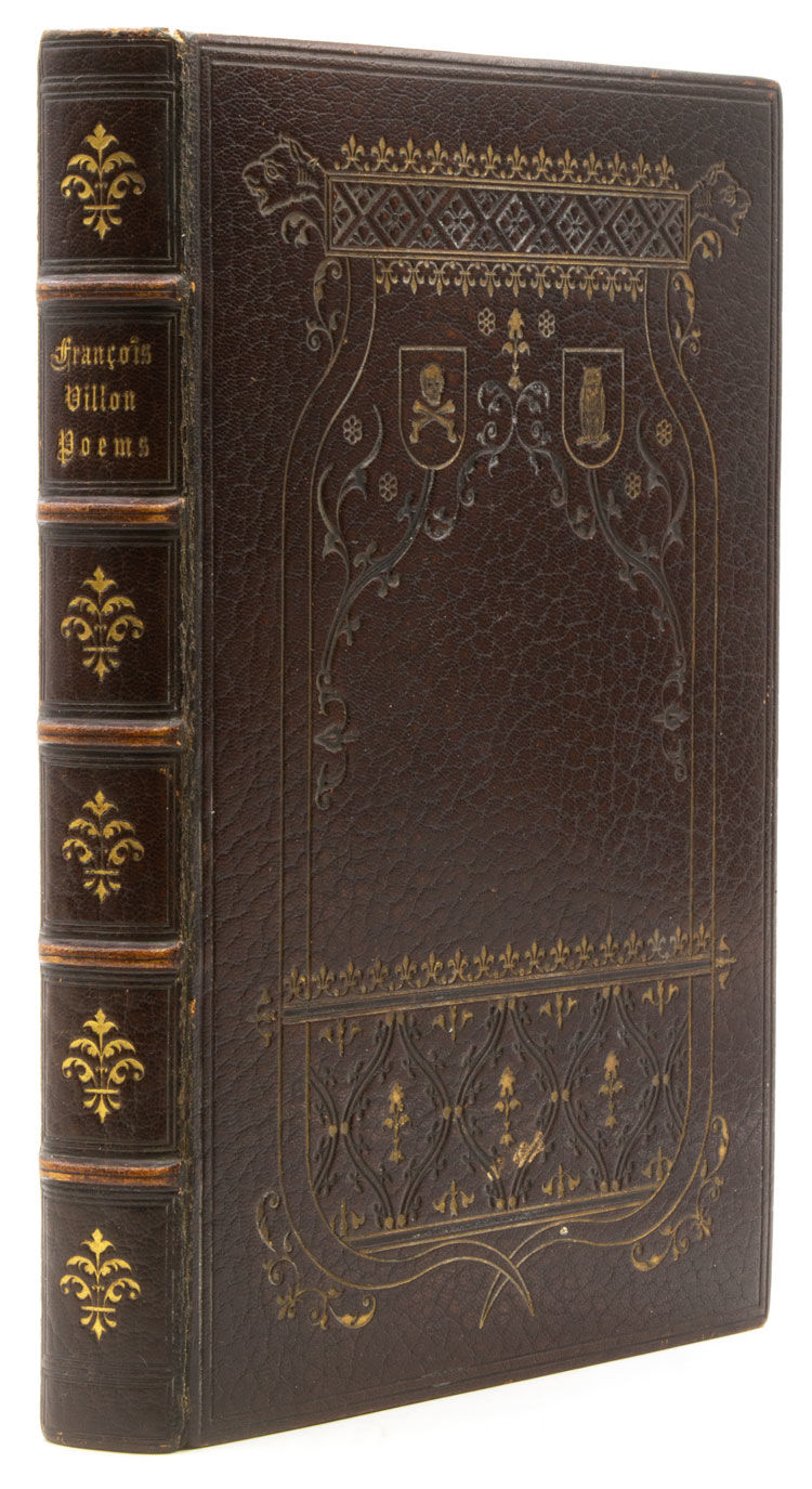 London: Printed by the Villon Society by Private Subscription and for Private Circulation Only, nd. Number 35 of Large Paper Issue. frontis. cvi, 158, [2]pp. 4to (11 x 7-1/4 inches). Bound in full morocco, full morocco doublures, t.ew.g., rest uncut, by Lortic Fils (after 1891). Number 35 of Large Paper Issue. frontis. cvi, 158, [2]pp. 4to (11 x 7-1/4 inches). With 15 full page portraits inserted at the front including Baudelaire, Dumas, etc. With 8 watercolours by Jean Paleologue (1855-1942) and signed PAL including a portrait of Villon.