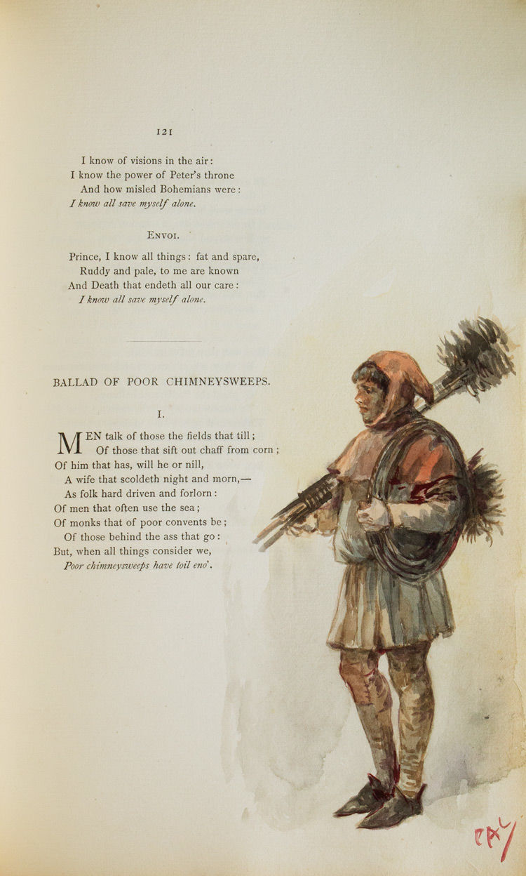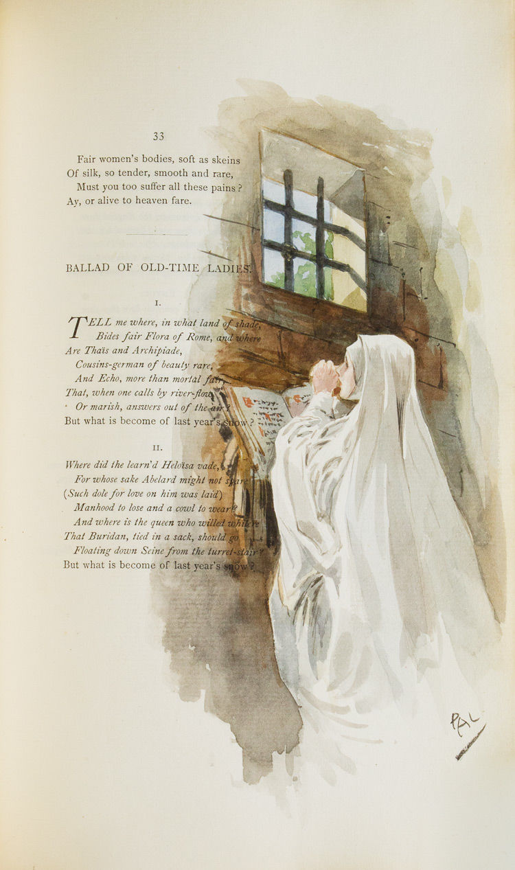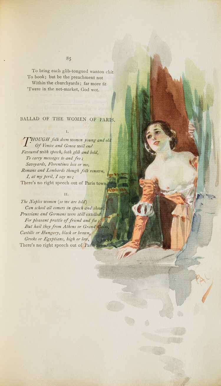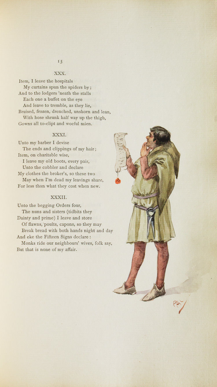 London: Printed by the Villon Society by Private Subscription and for Private Circulation Only, nd. Number 35 of Large Paper Issue. frontis. cvi, 158, [2]pp. 4to (11 x 7-1/4 inches). Bound in full morocco, full morocco doublures, t.ew.g., rest uncut, by Lortic Fils (after 1891). Number 35 of Large Paper Issue. frontis. cvi, 158, [2]pp. 4to (11 x 7-1/4 inches). With 15 full page portraits inserted at the front including Baudelaire, Dumas, etc. With 8 watercolours by Jean Paleologue (1855-1942) and signed PAL including a portrait of Villon.