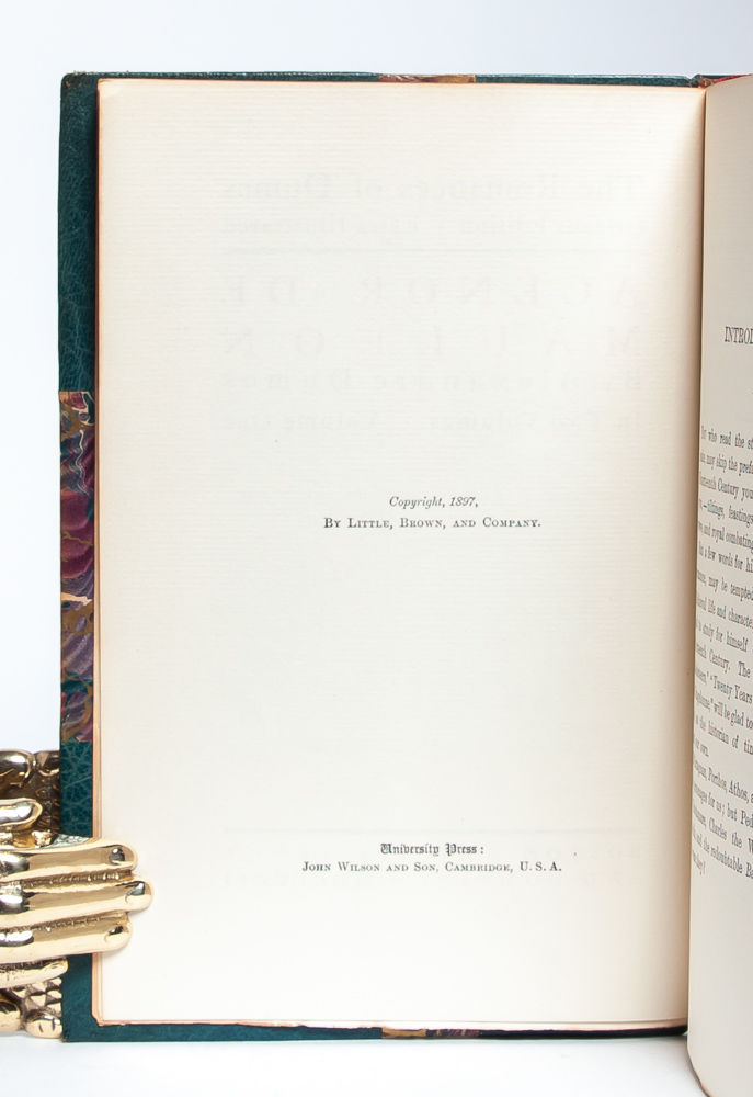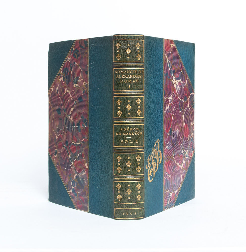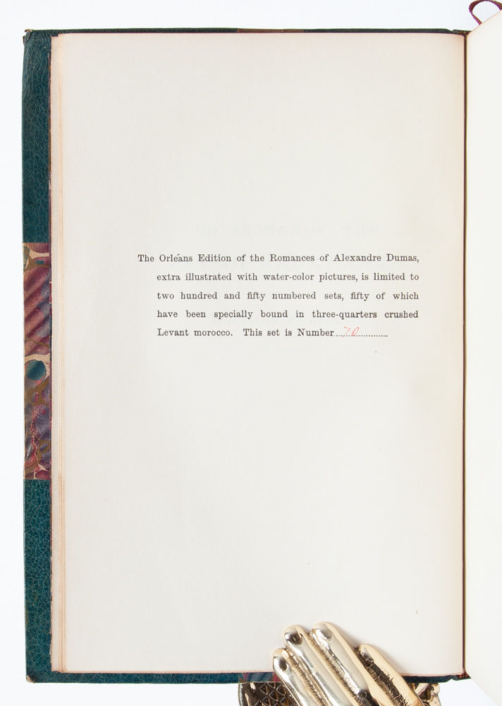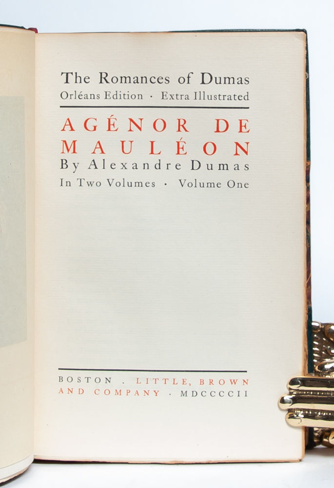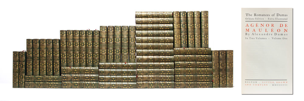 Boston: Little, Brown & Co, 1902. Orleans Edition. Fine. One of 250 numbered sets extra-illustrated with water color illustrations, of which this is number 70. Each volume measuring 5 1/2 x 8 1/2 inches, together occupying approximately 81 1/2 inches (207 cm) of shelf space. Finely bound in three-quarter crushed morocco over marbled boards and embossed in gilt. Top edges brightly gilt, all other edges untrimmed. Marbled endpapers. Inside and out, a beautiful set with striking illustrations bringing Dumas' greatest works to life.