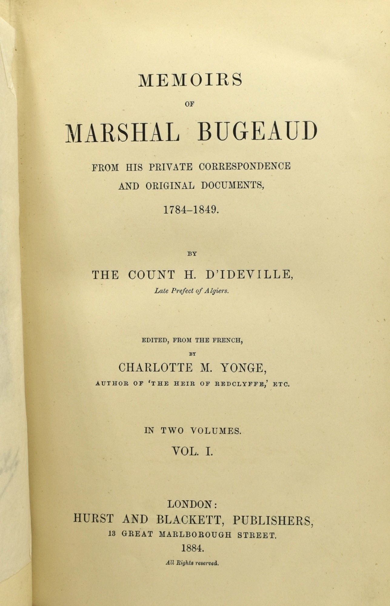 MEMOIRS OF MARSHAL BUGEAUD FROM HIS PRIVATE CORRESPONDENCE AND ORIGINAL DOCUMENTS 1784-1849 (2 VOLUMES)